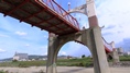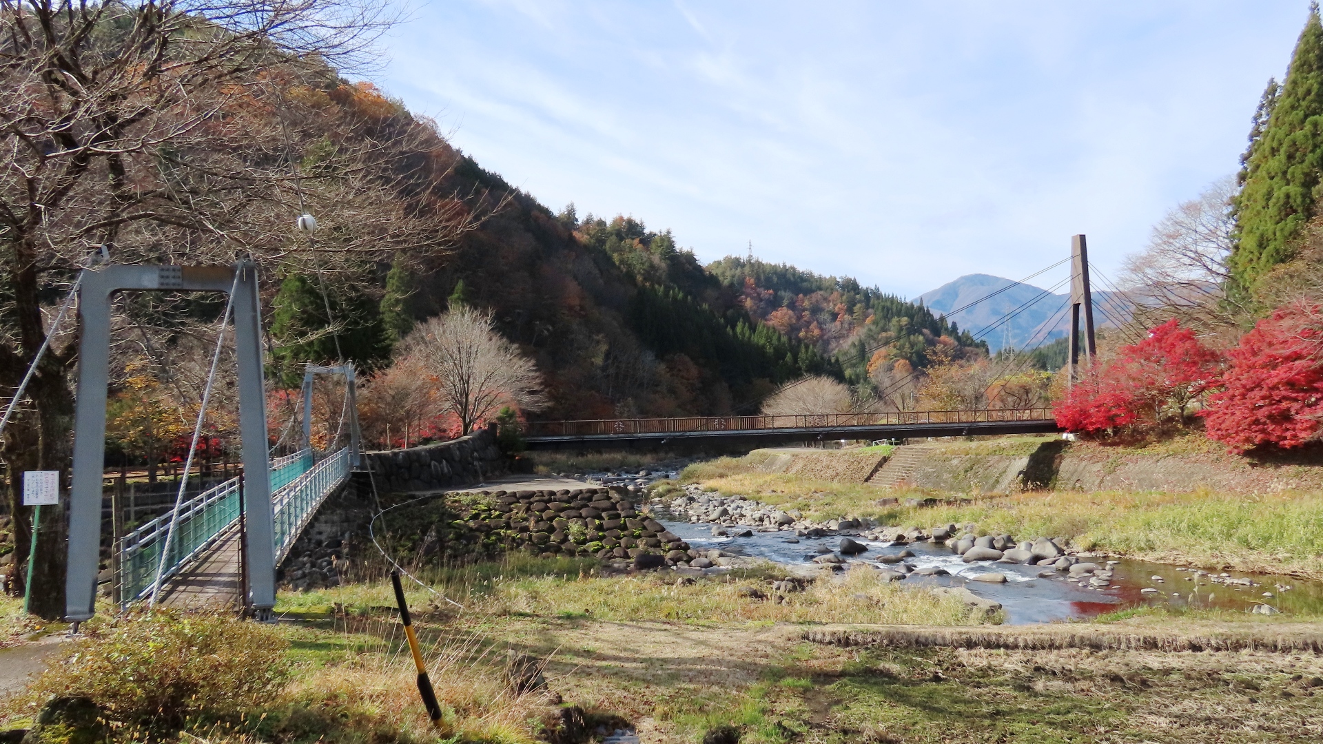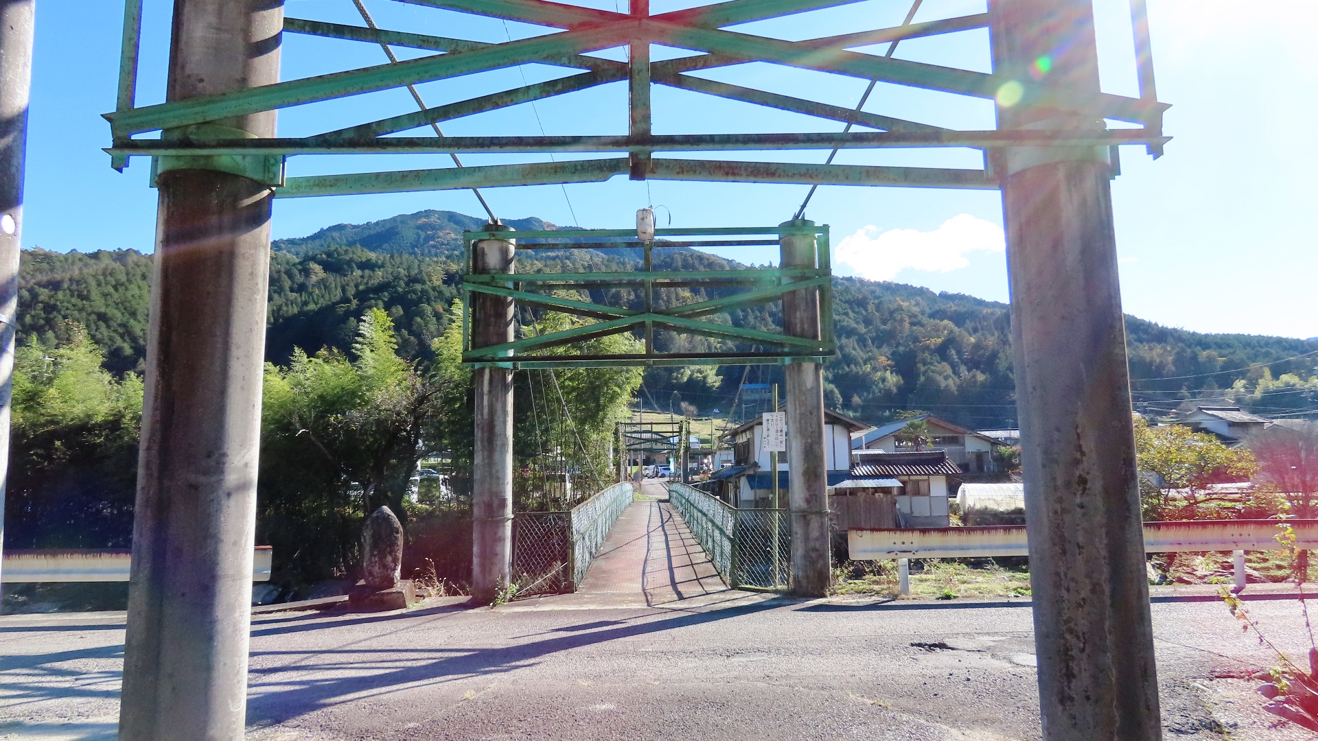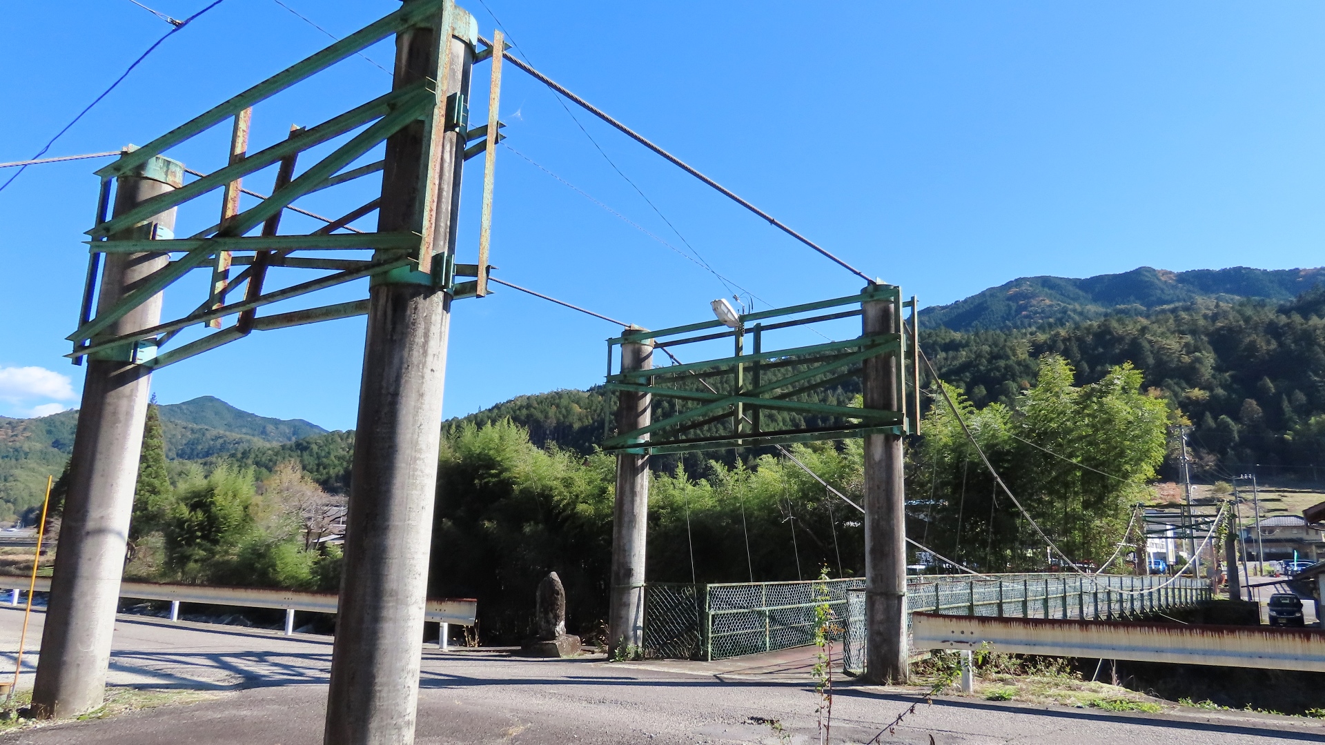釜戸の吊橋の下流に架かる主塔が小さめの橋。また橋の真ん中が 持ち上がって折れ曲がっている。 2023.11 |