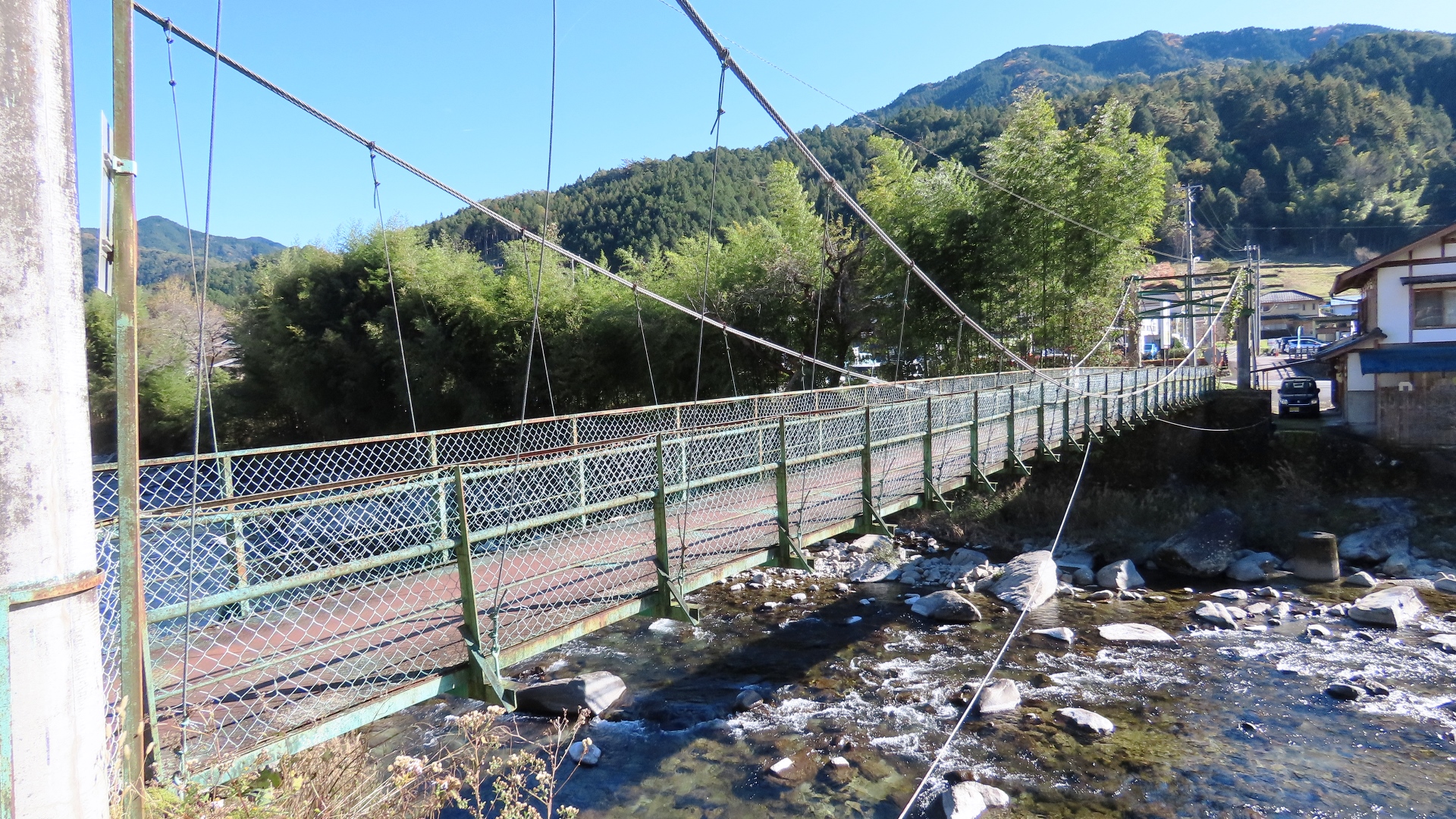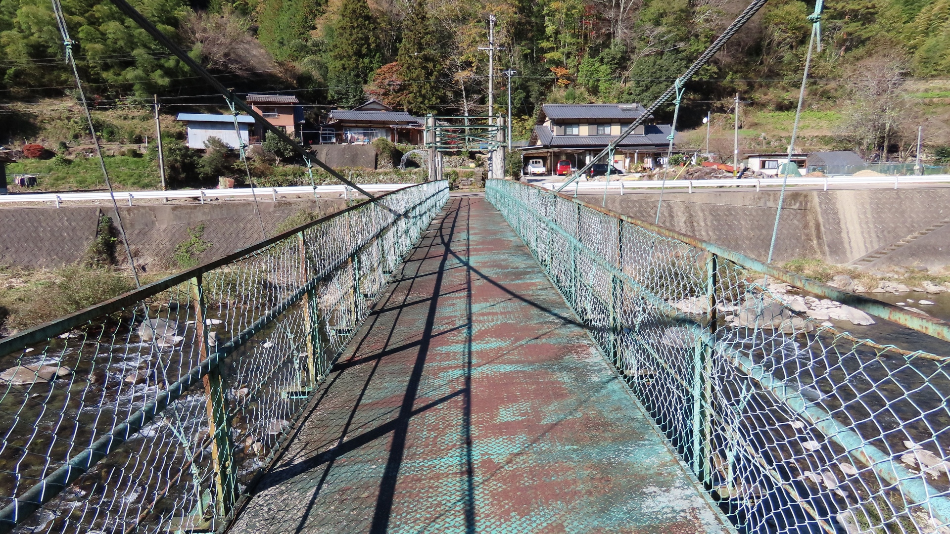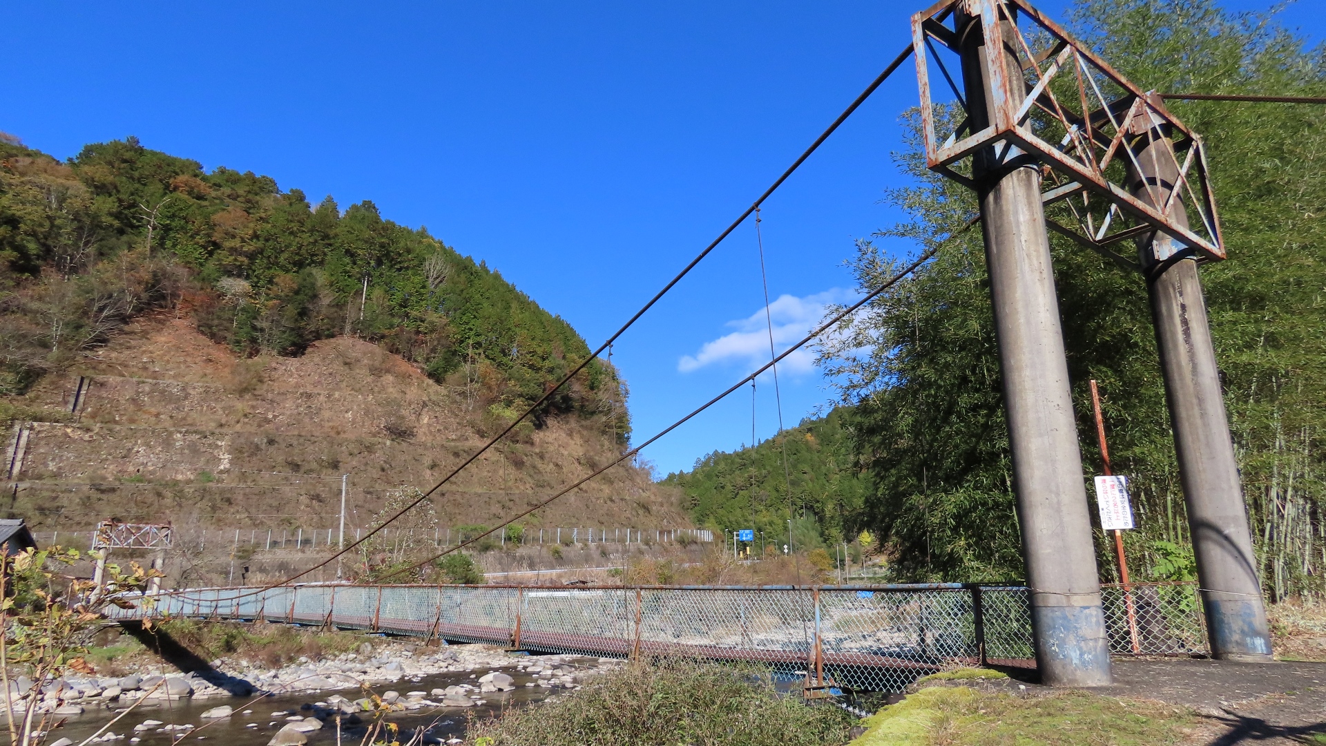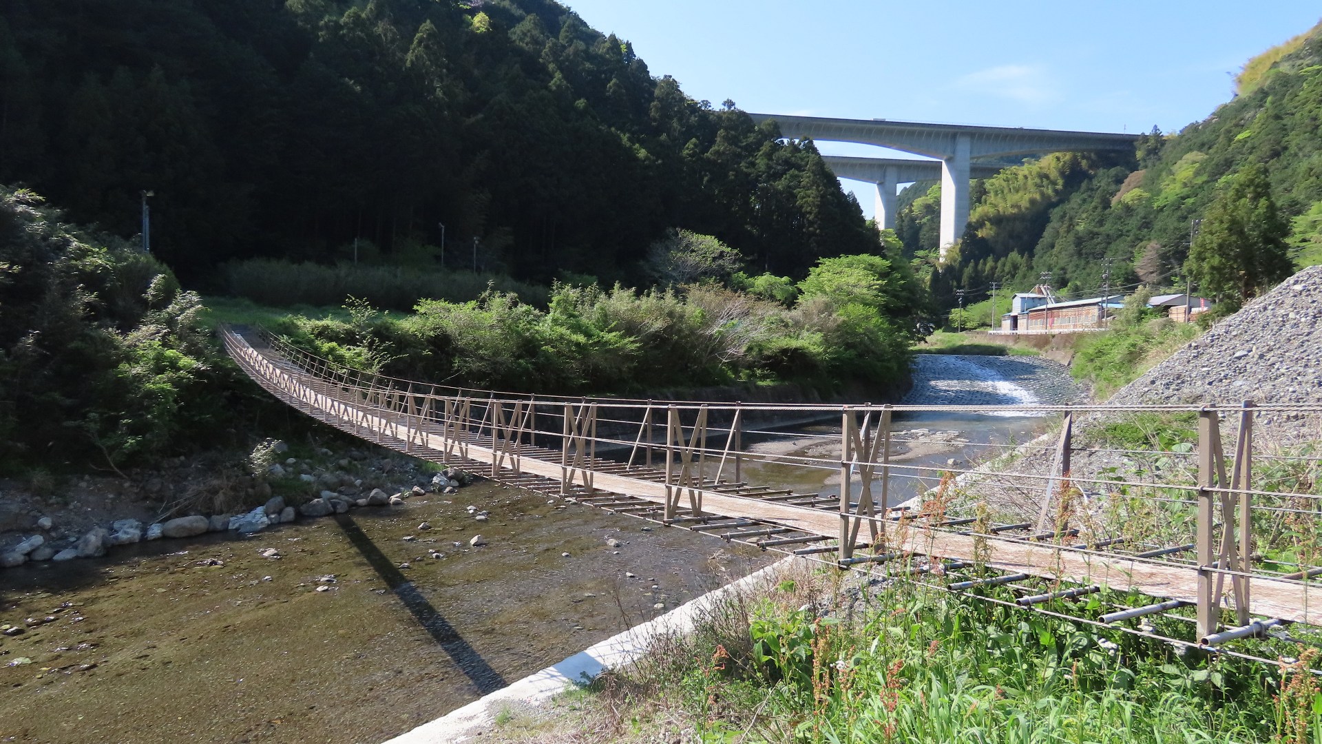 | 蕨野橋の約6km上流に架かる全長約140mの県道をまたぐ吊橋。 床板は木材で幅は狭い。 |