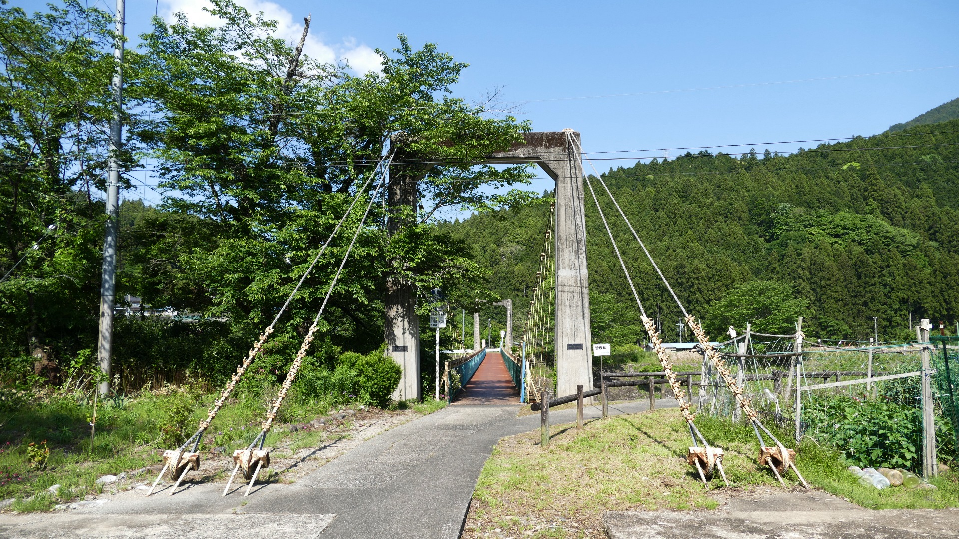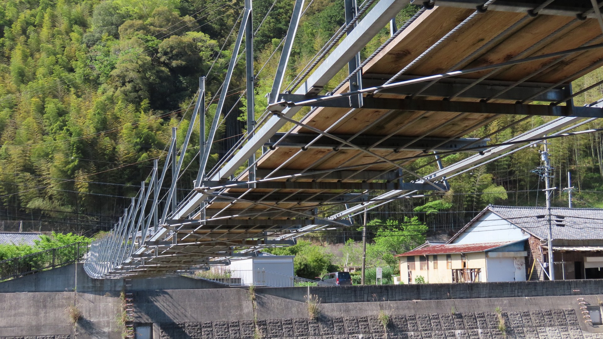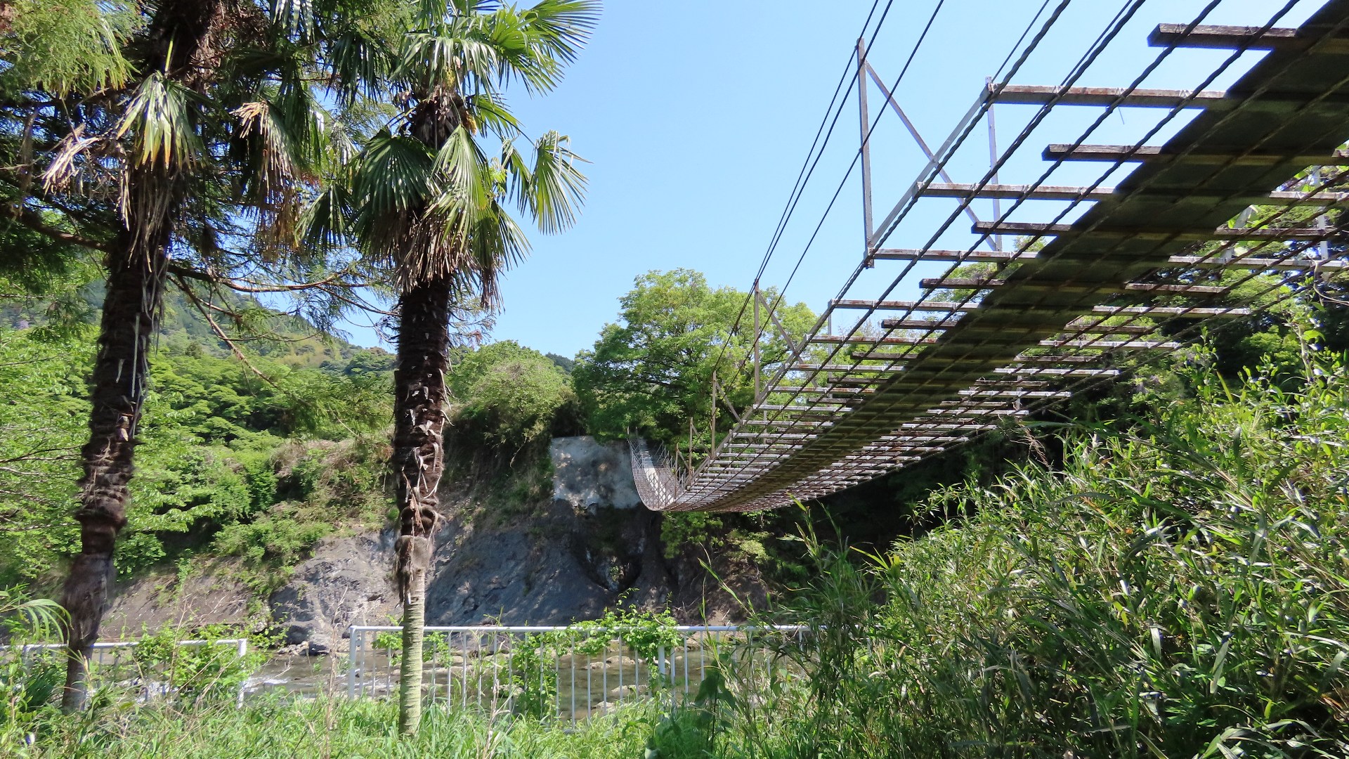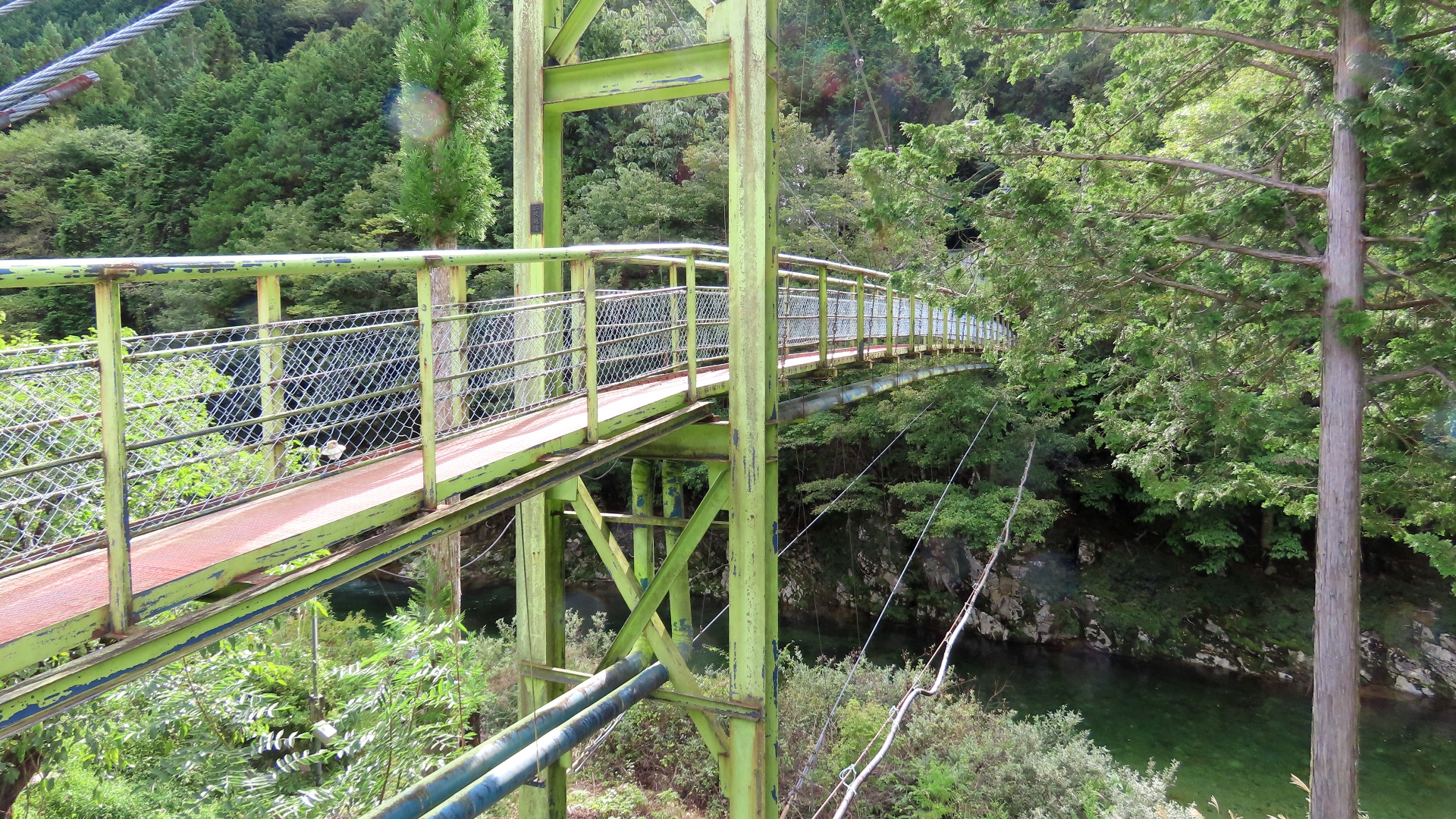 | 蕨野橋の約6km上流に架かる全長約140mの県道をまたぐ吊橋。 床板は木材で幅は狭い。 |