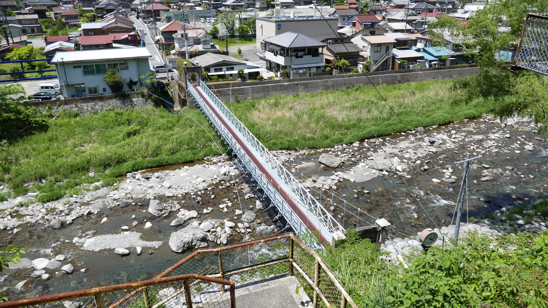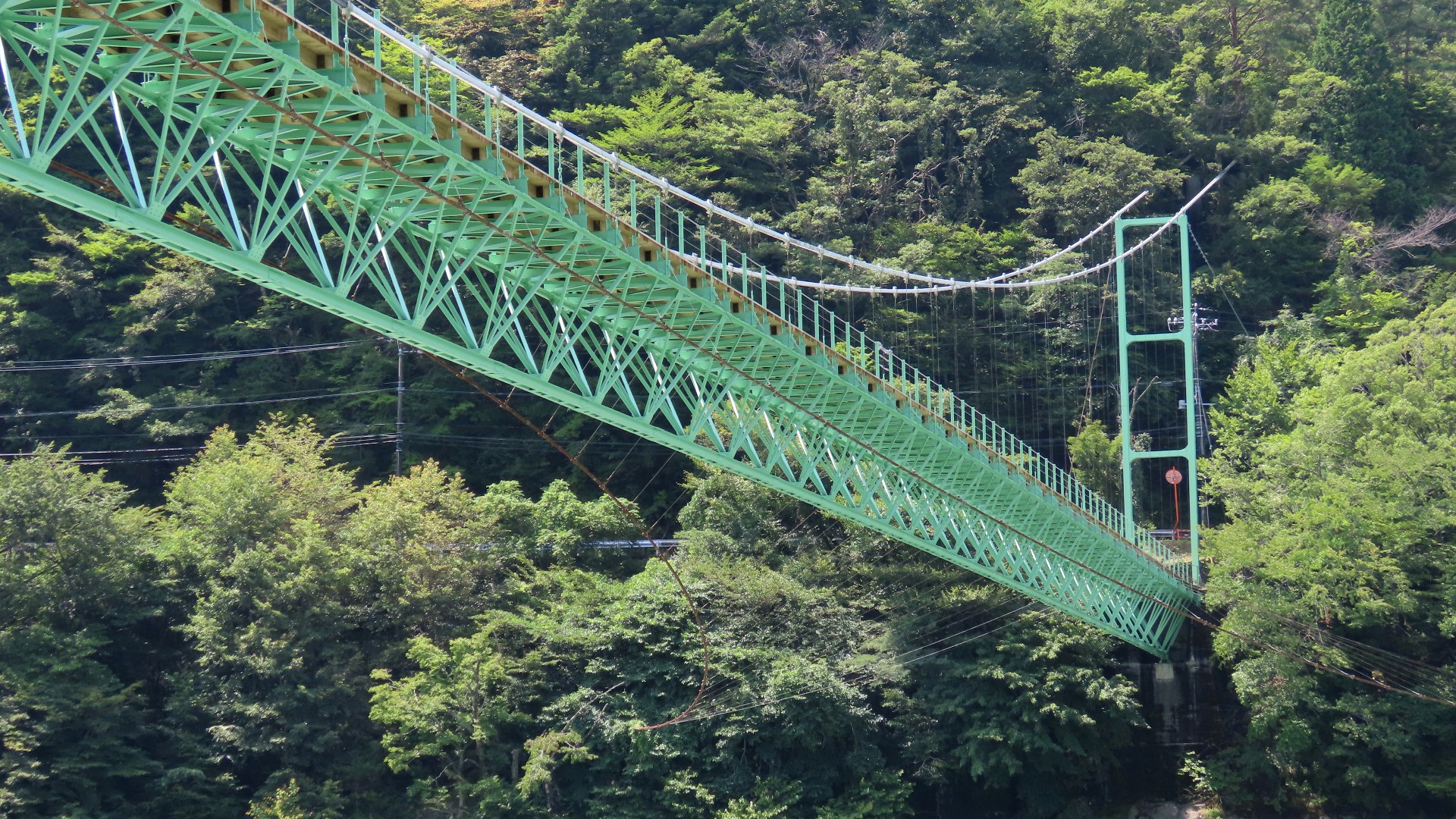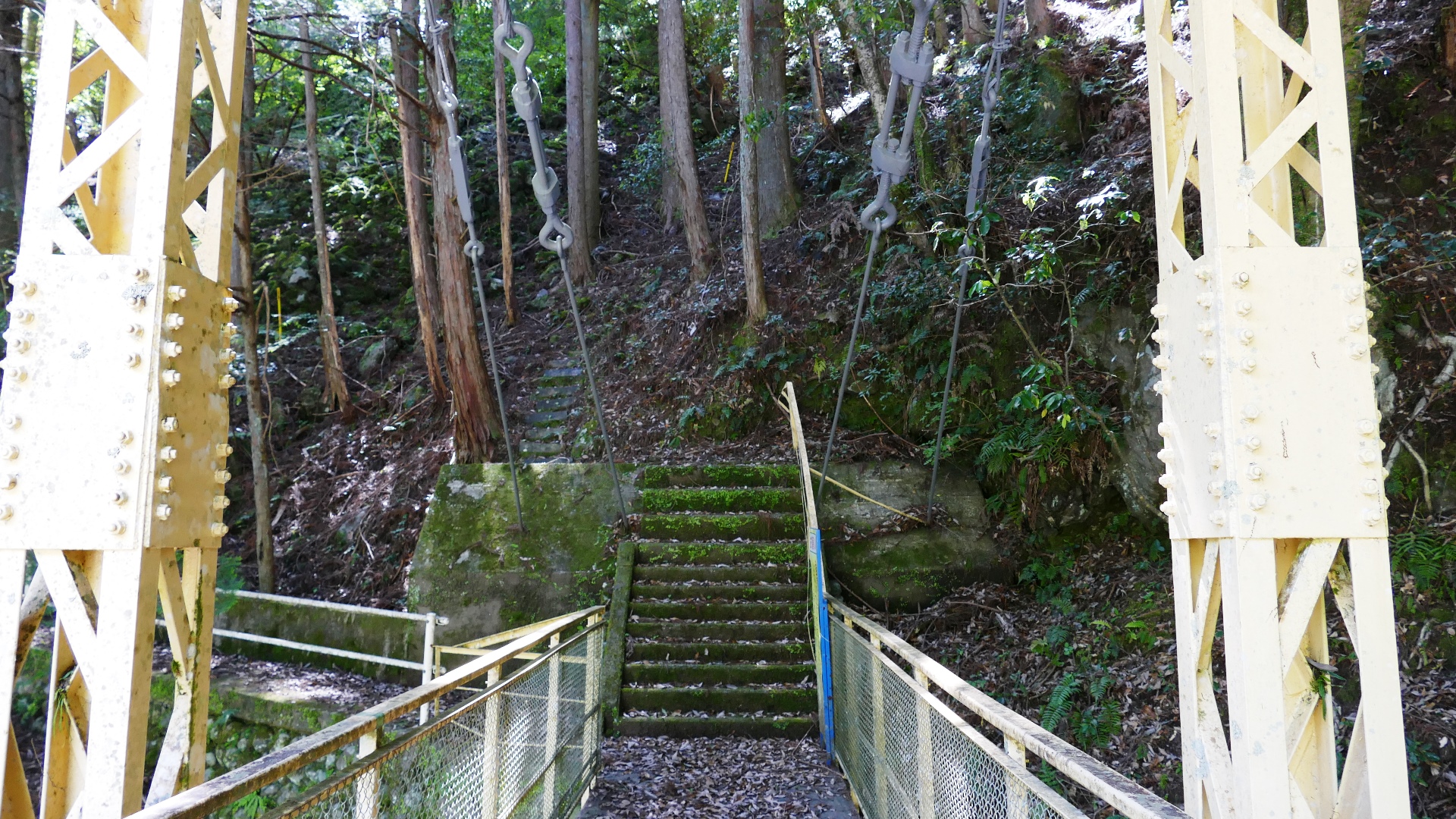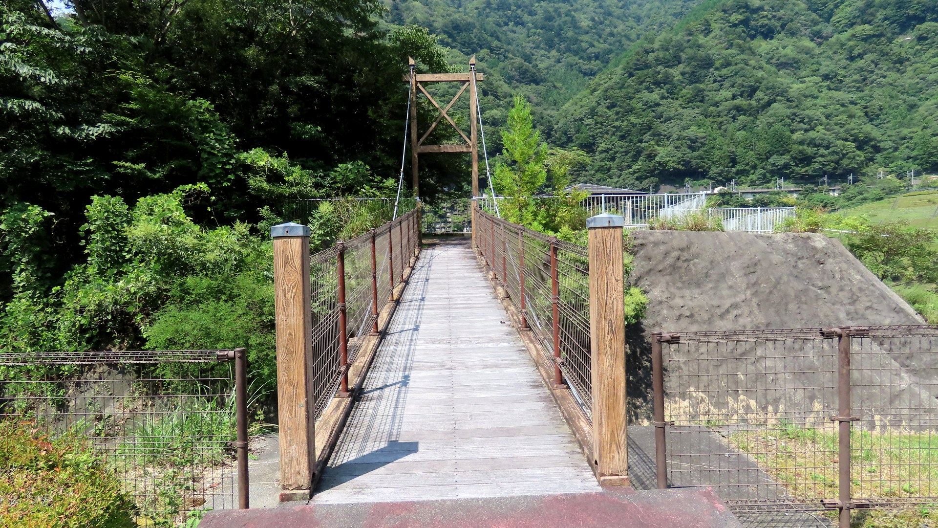 | 蕨野橋の約6km上流に架かる全長約140mの県道をまたぐ吊橋。 床板は木材で幅は狭い。 |
