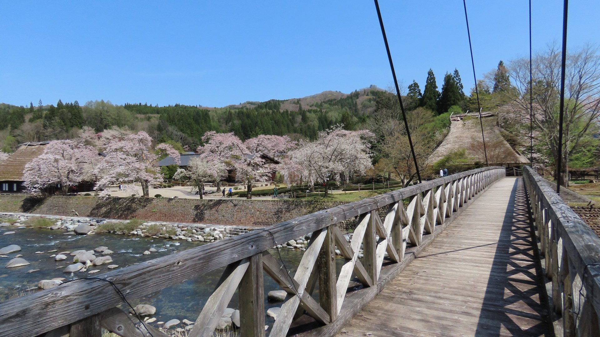 | 合掌造りの民族資料館「荘川の里」(入場料410円)内の荘川に架かる 昭和62年完成の人道橋 2025.5 |