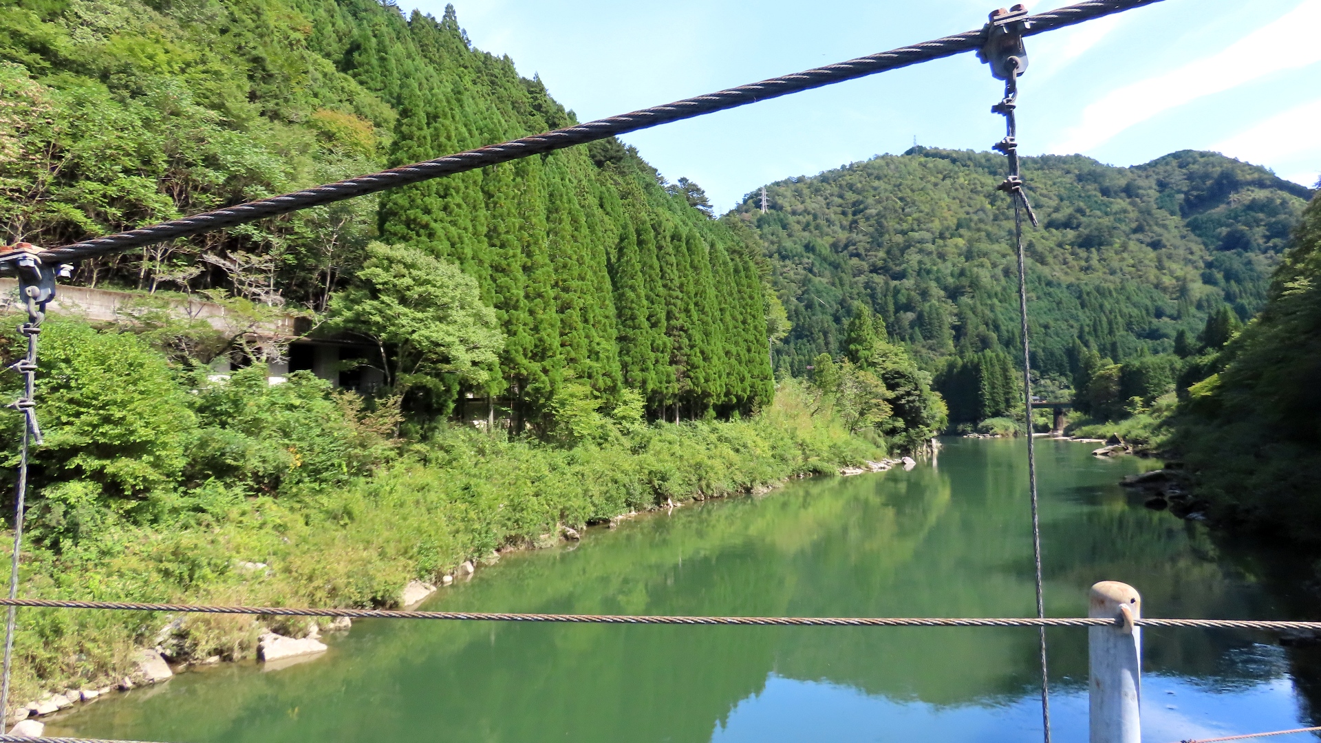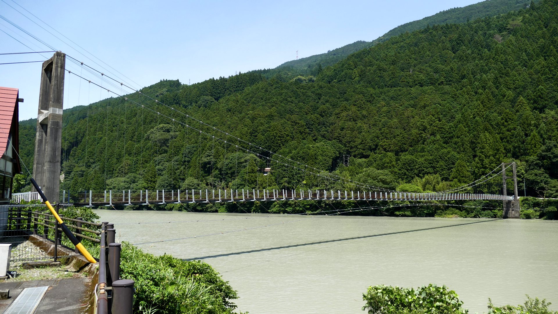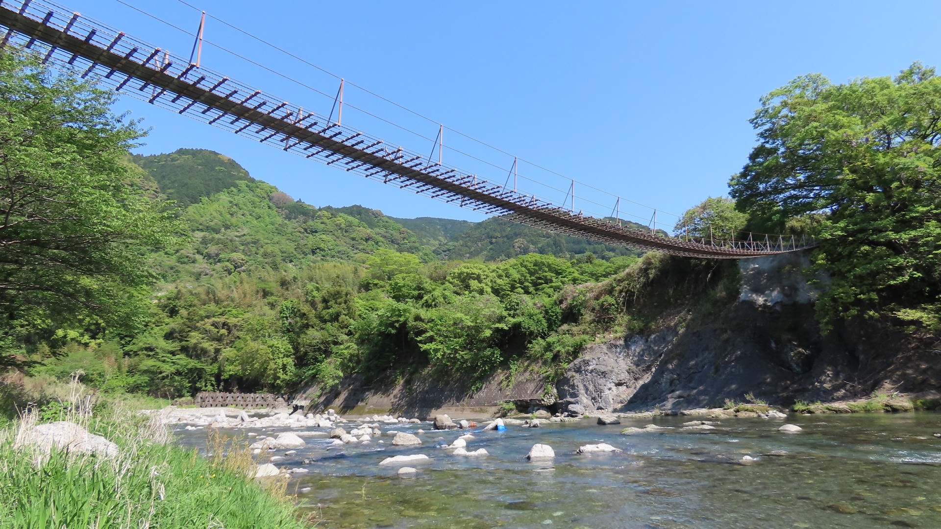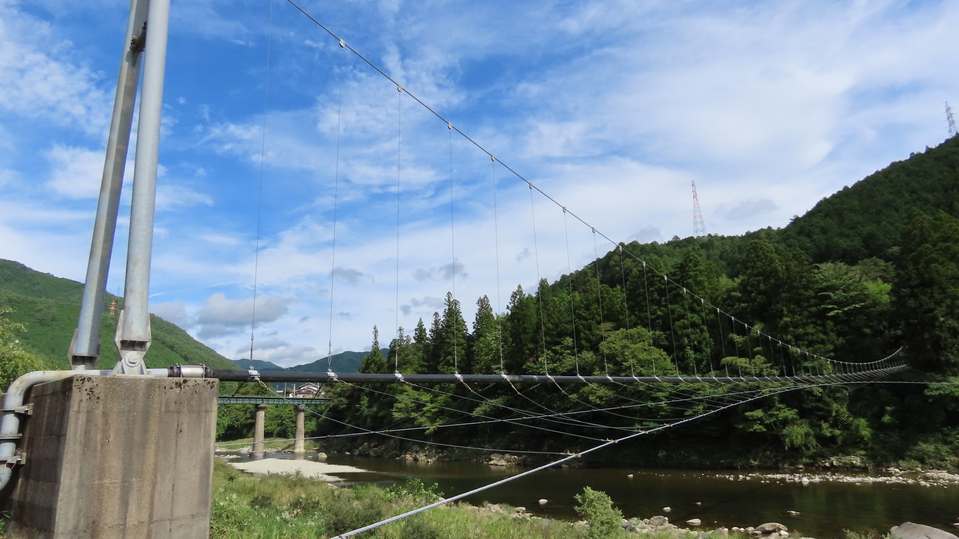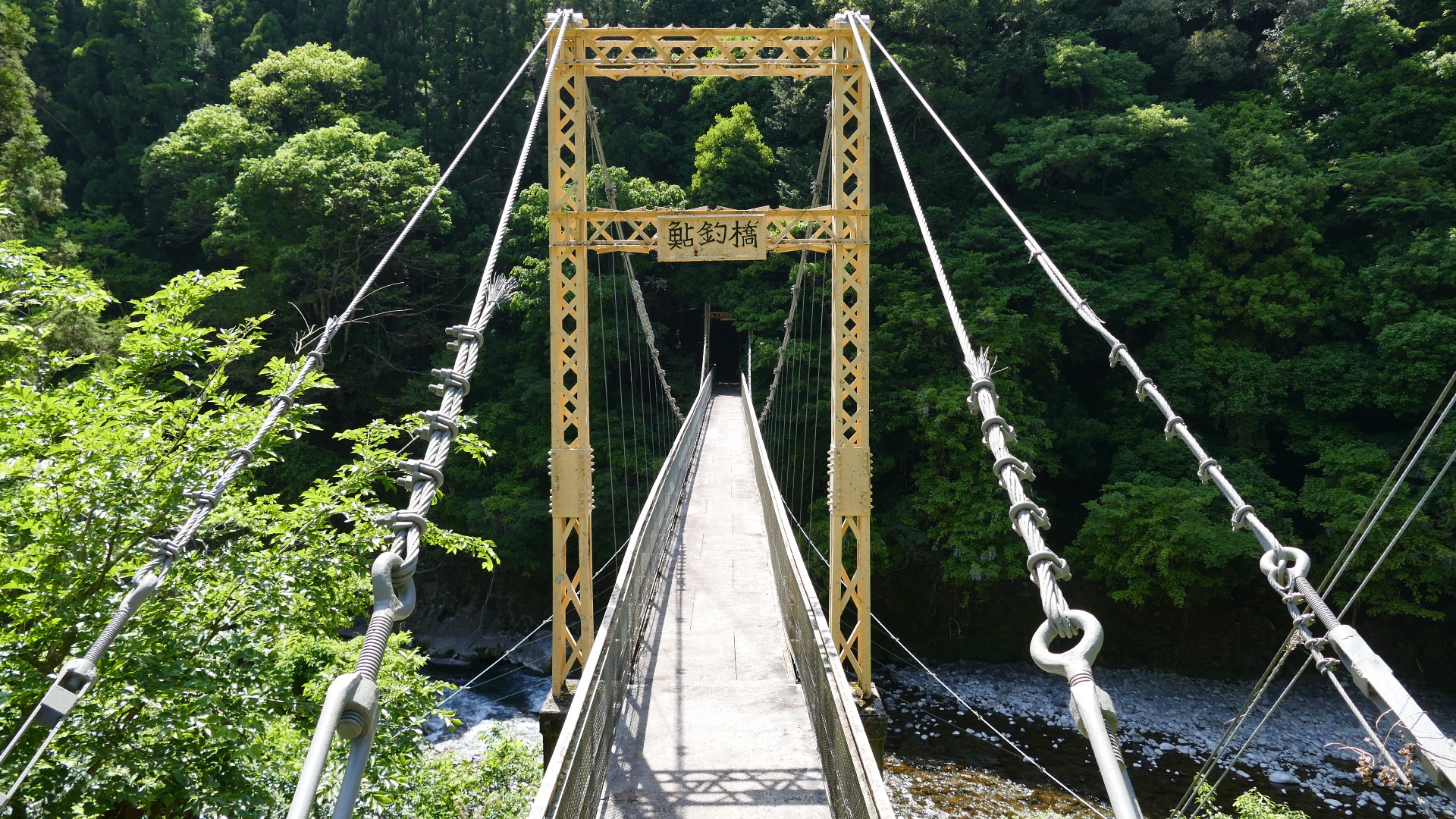 | 入志摩橋の約4.5km上流に架かる全長約50mの吊橋。 キャンプ場一角にある吊橋みたいで、それまでのと比べて安定感ある。 |