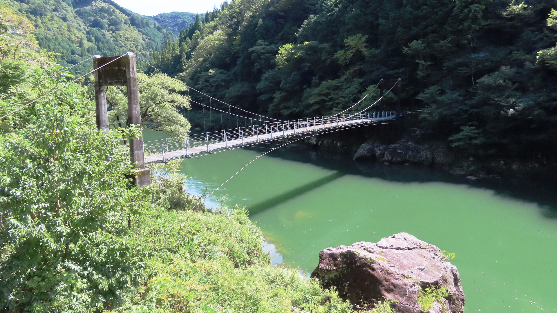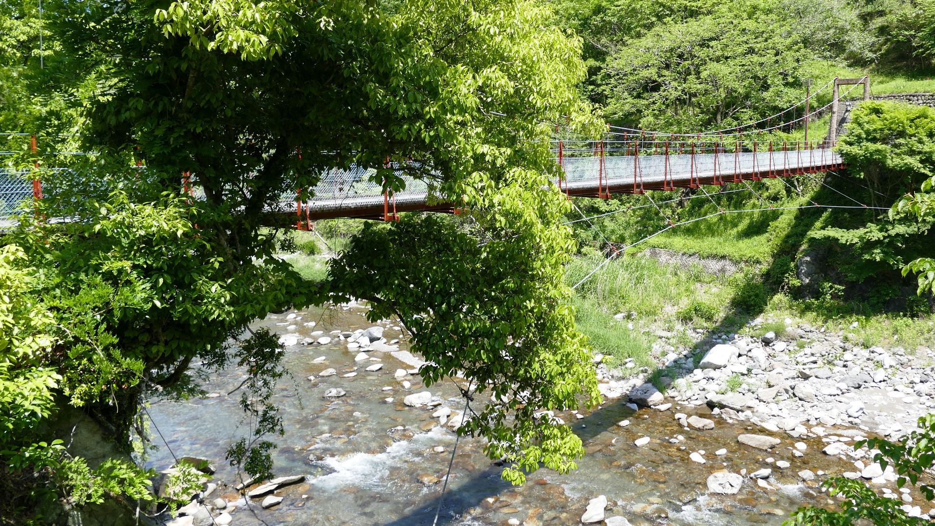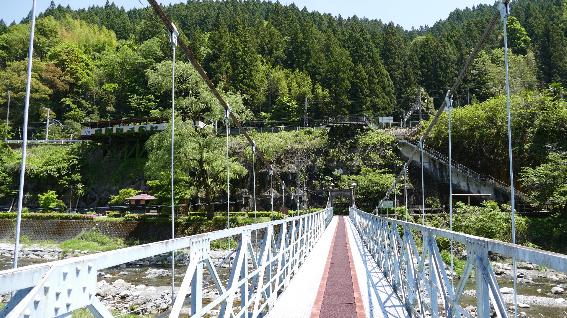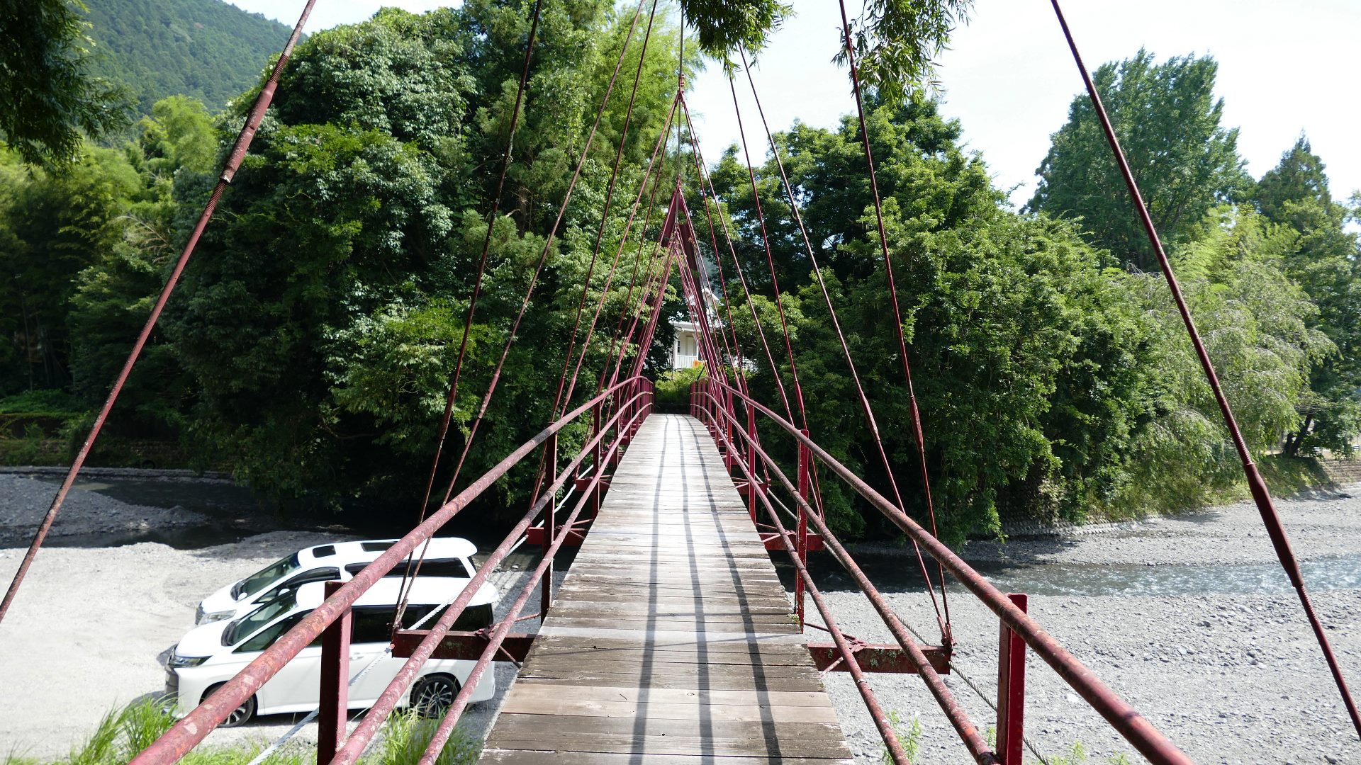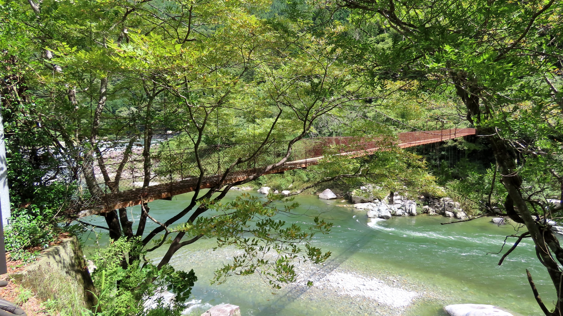 | 入志摩橋の約4.5km上流に架かる全長約50mの吊橋。 キャンプ場一角にある吊橋みたいで、それまでのと比べて安定感ある。 |