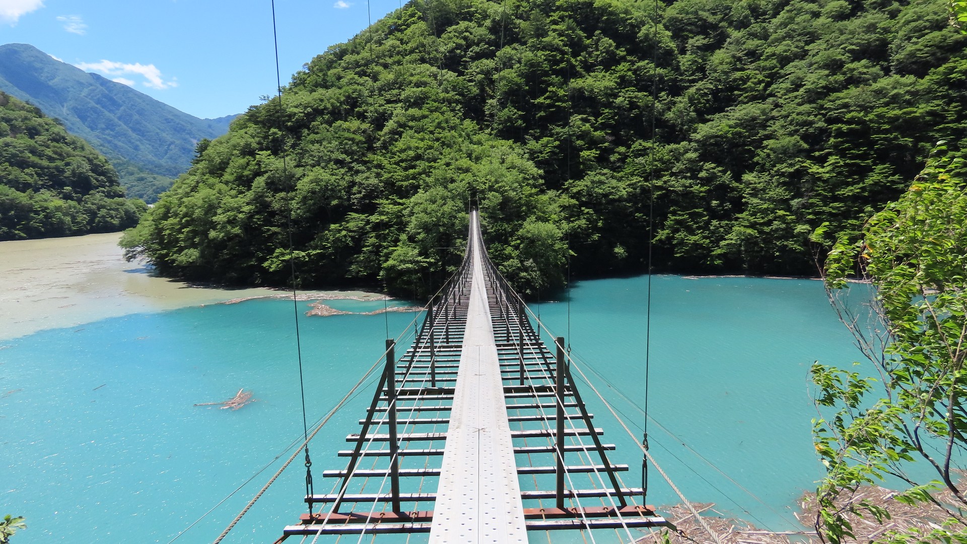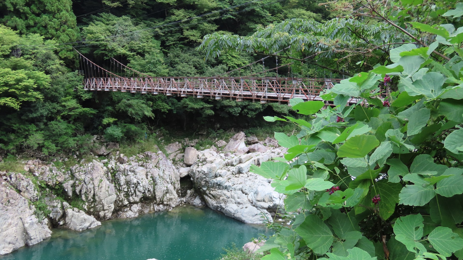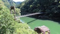 | 歩いて渡れる日本の吊り橋ランキング 第2位。駐車場から約30分程歩くと吊り橋が見えたが、渡るのに待つこと1時間。定員は10名とあるが混雑の為、明らかに倍以上係員に案内される。長さ90m、高さ8mの吊り橋は、板2枚だけでまたよく揺れる。エメラルドブルーの水面がキレイ。 | |||||||