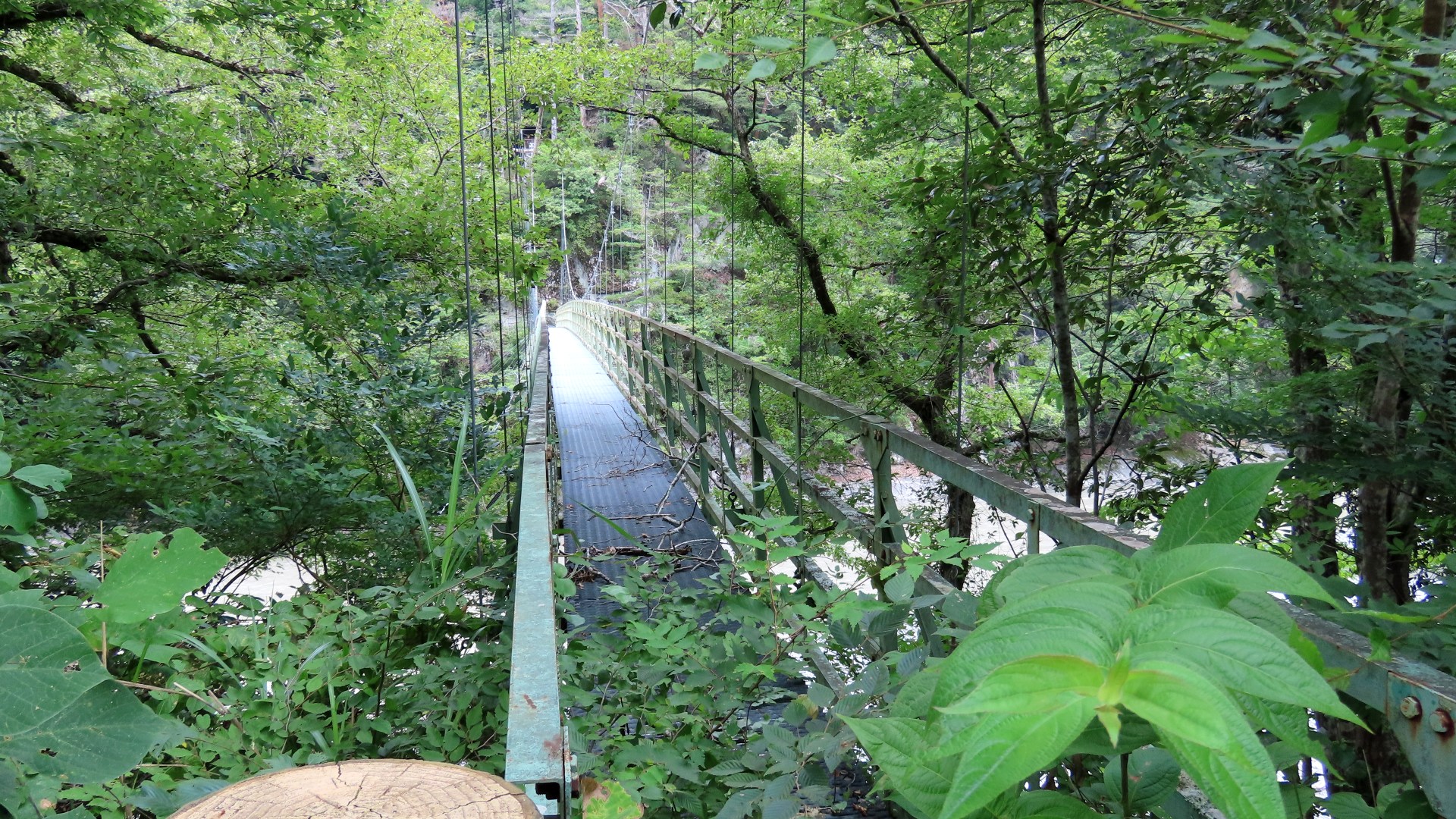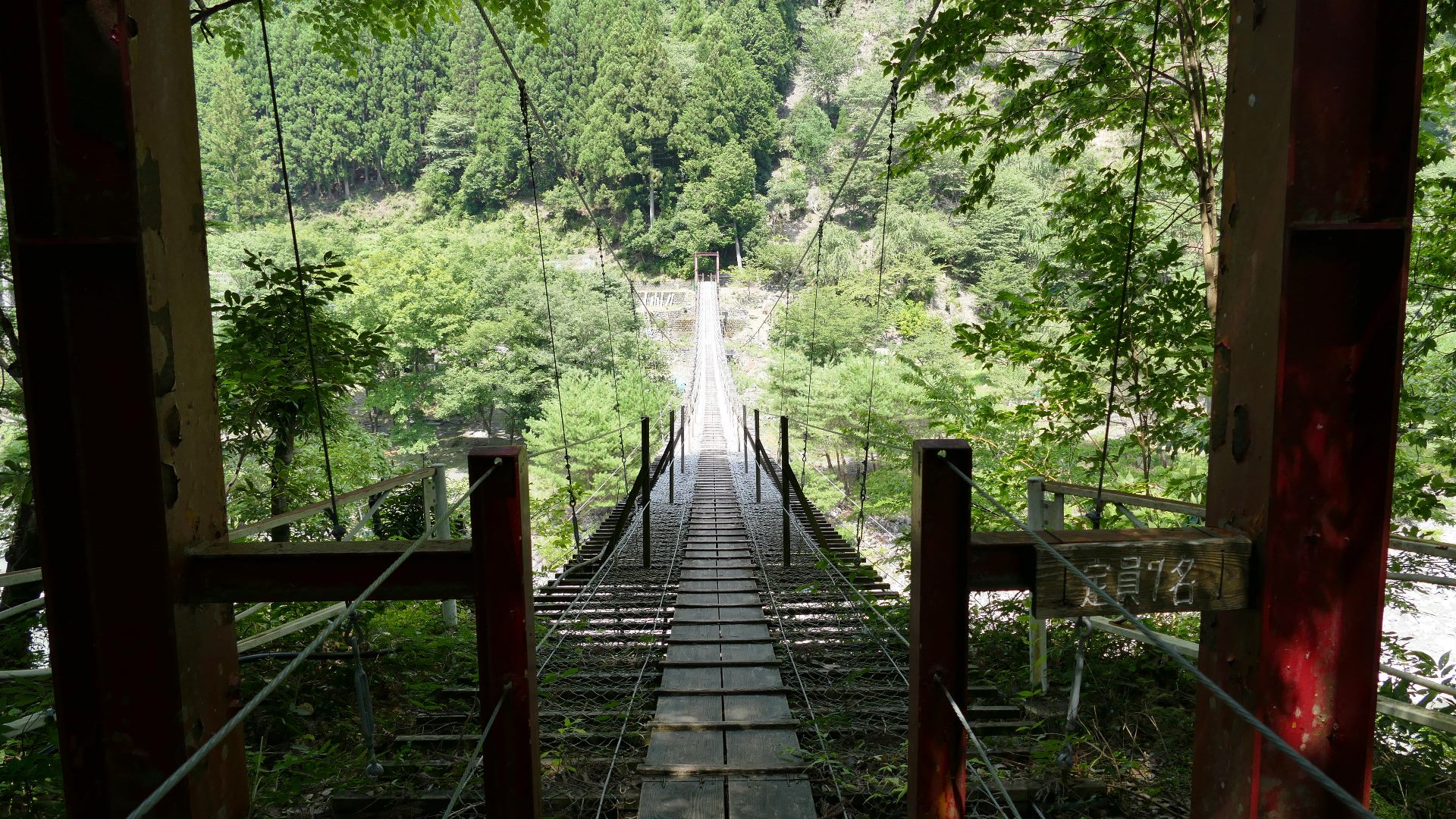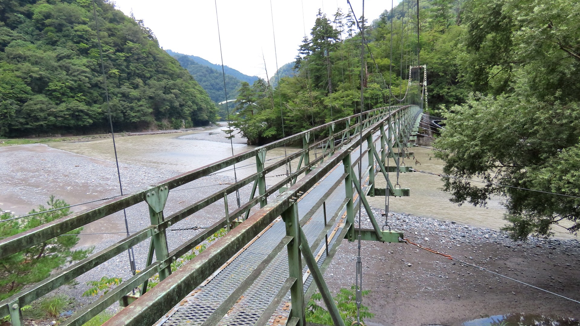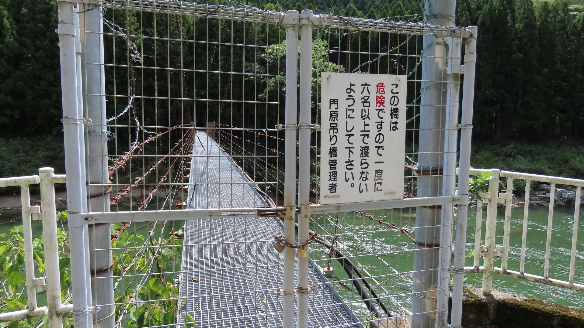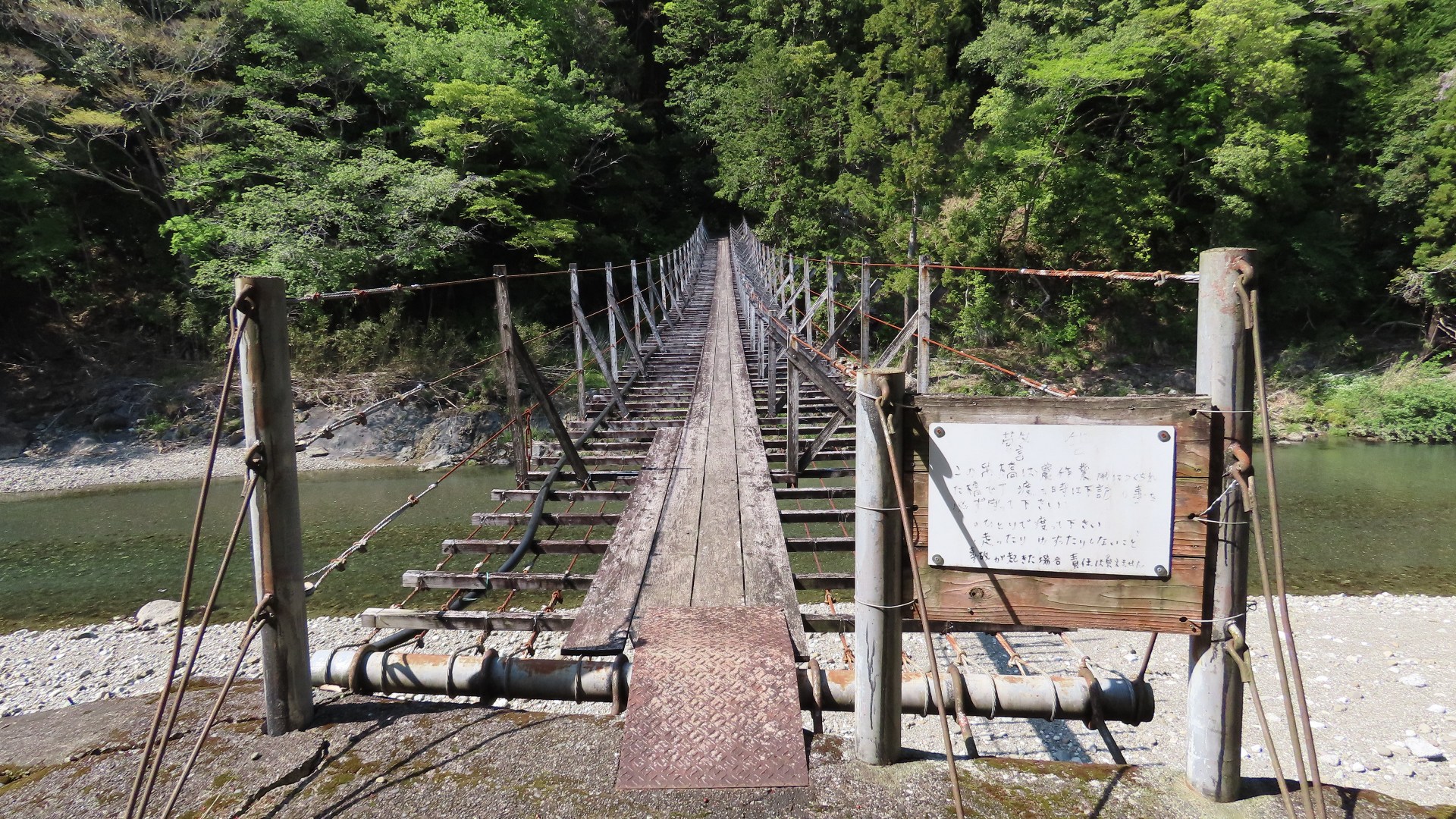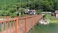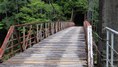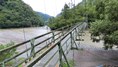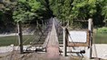 渡本橋の約5.2km上流に架かる全長約130mの吊橋。 見た目と裏腹に揺れが大きく手摺りも不安定でかつ、木板が腐りかけている。 |