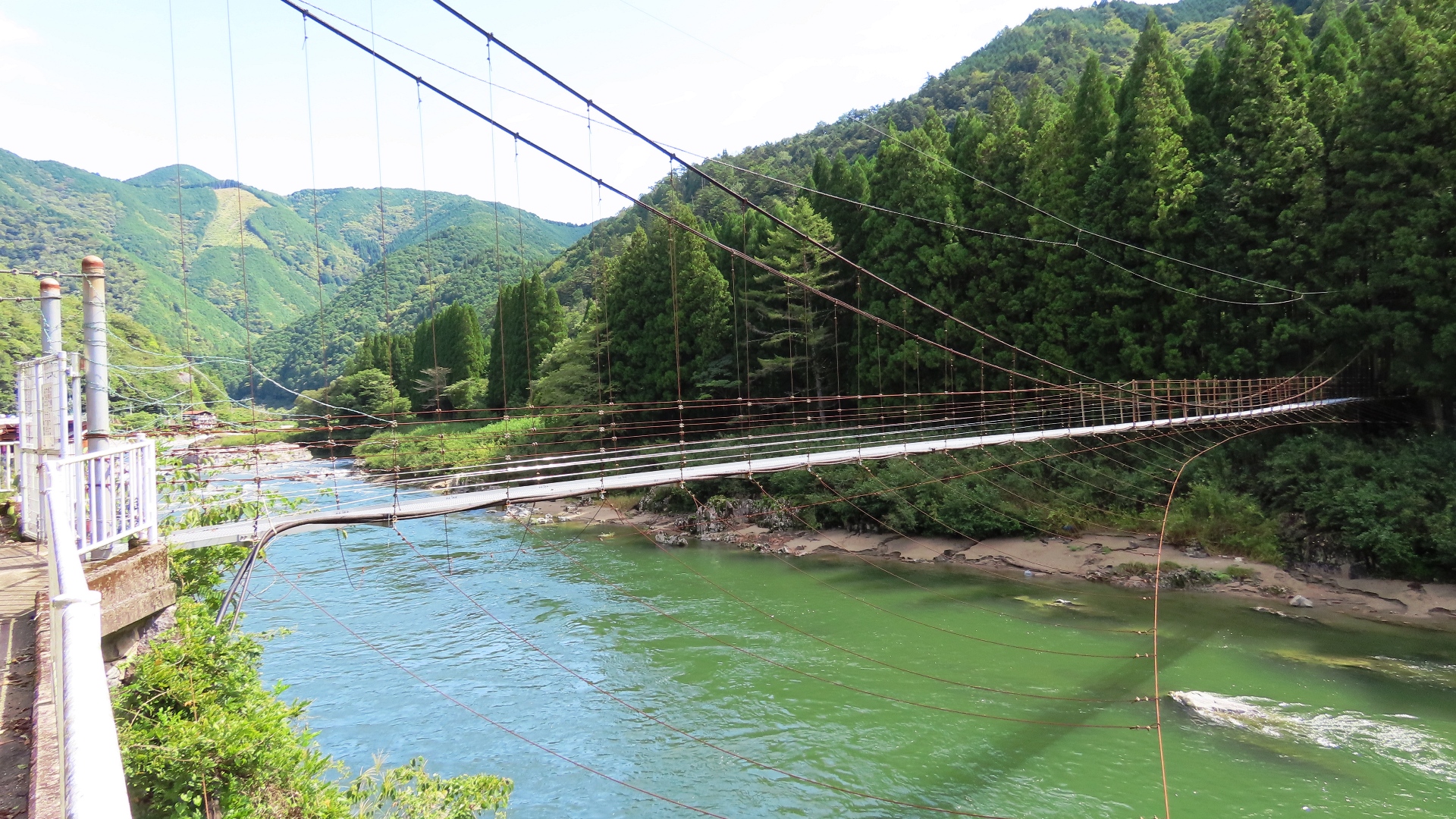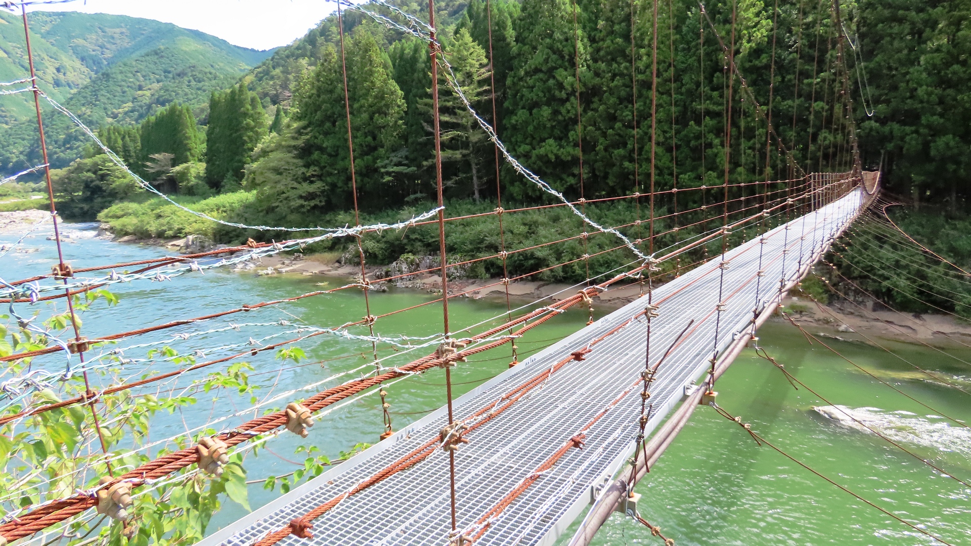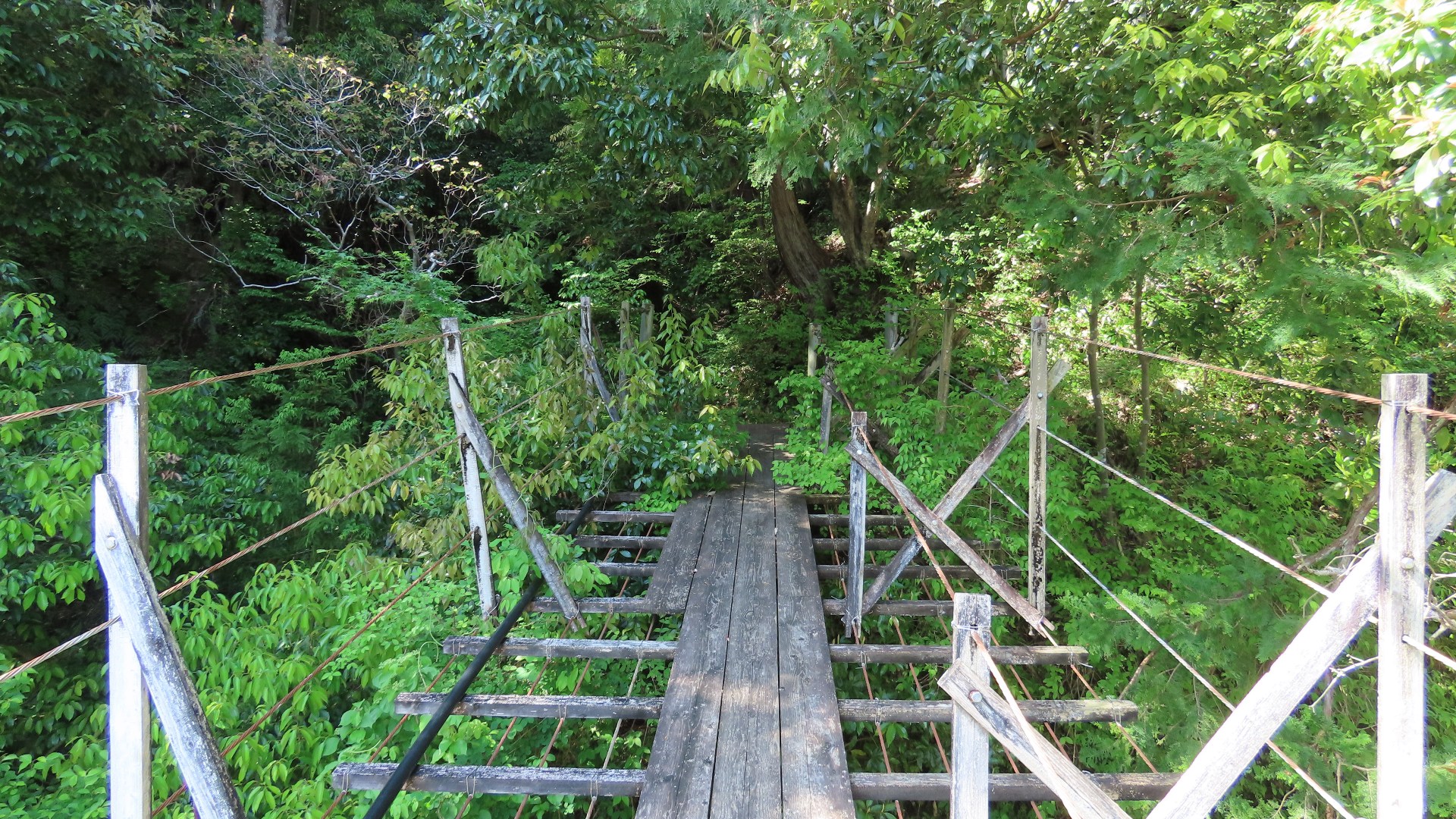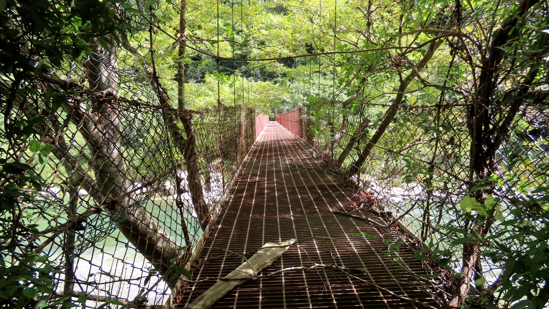 渡本橋の約5.2km上流に架かる全長約130mの吊橋。 見た目と裏腹に揺れが大きく手摺りも不安定でかつ、木板が腐りかけている。 |