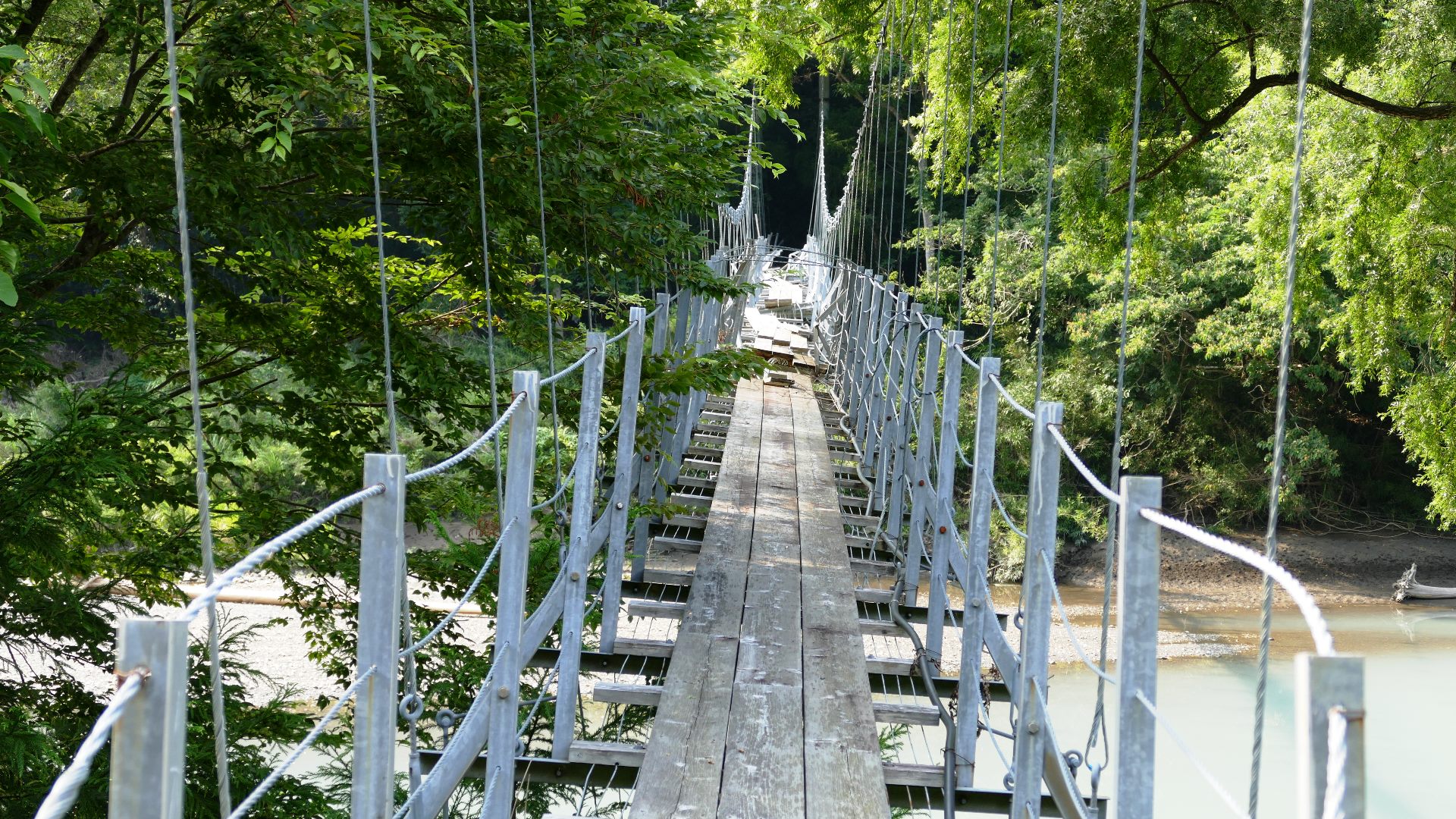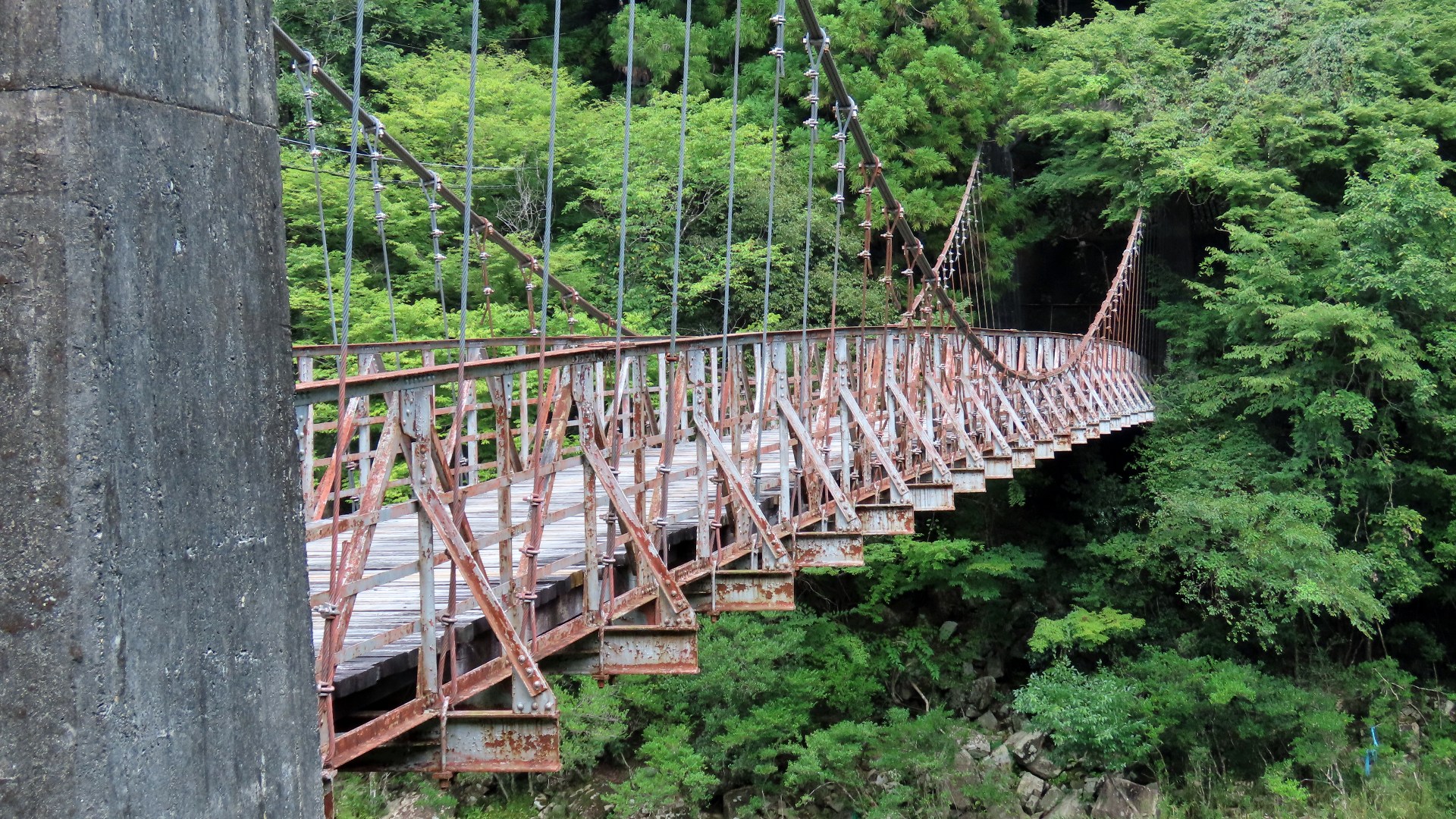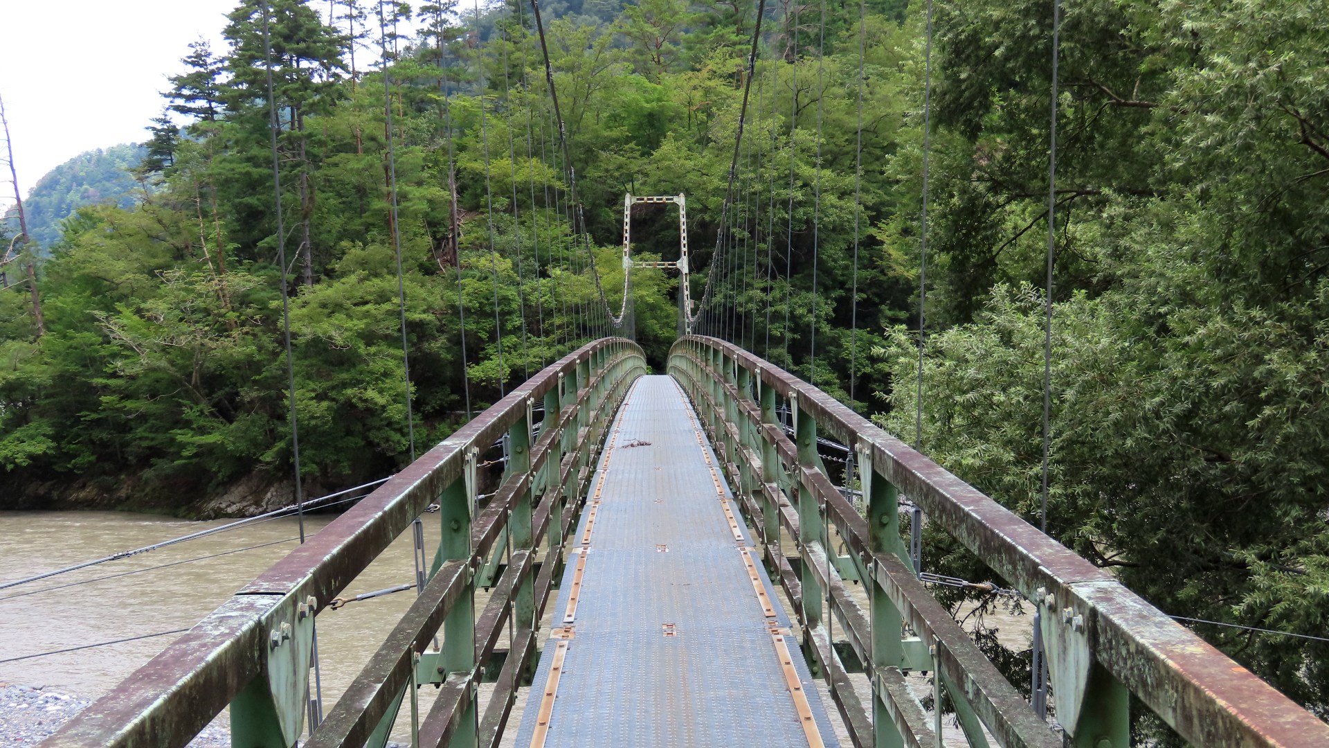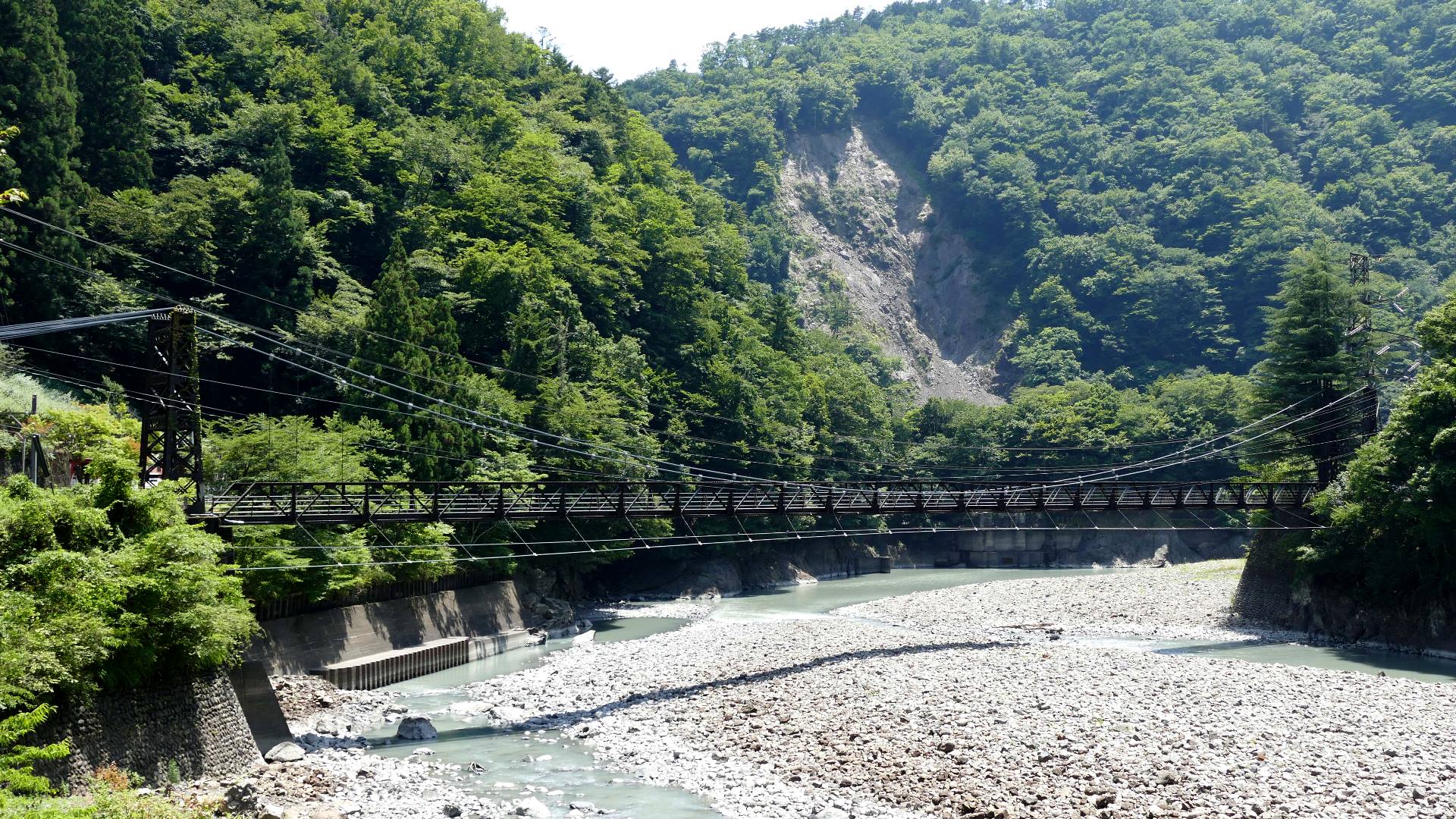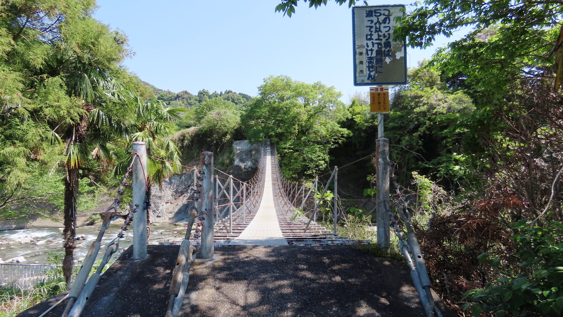 渡本橋の約5.2km上流に架かる全長約130mの吊橋。 見た目と裏腹に揺れが大きく手摺りも不安定でかつ、木板が腐りかけている。 |