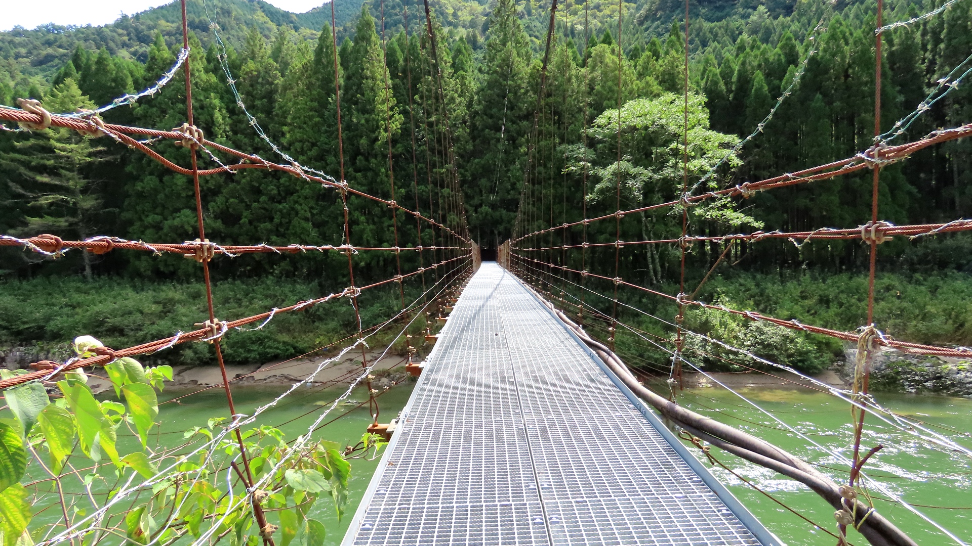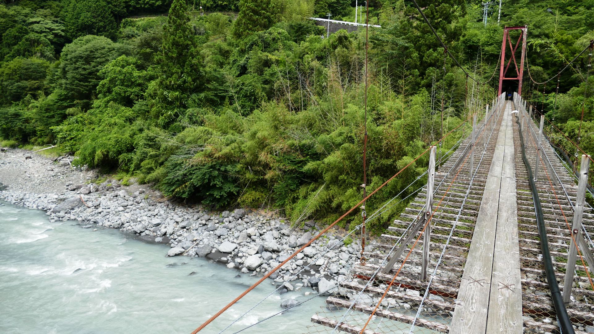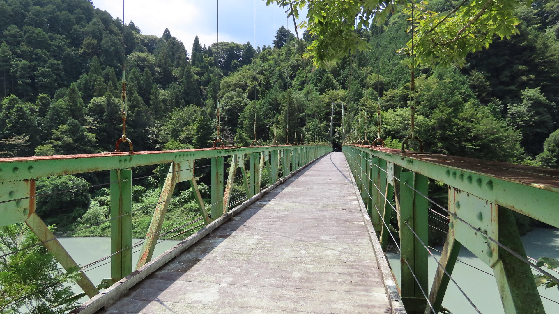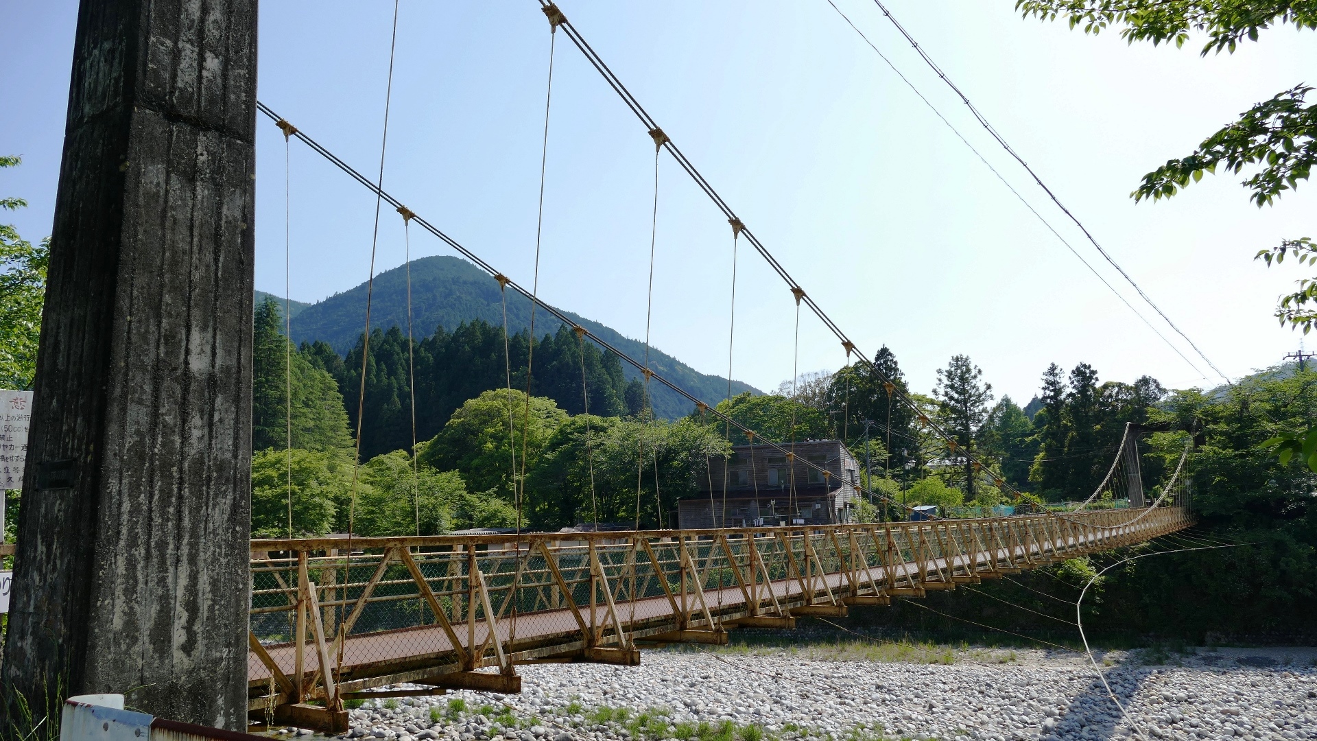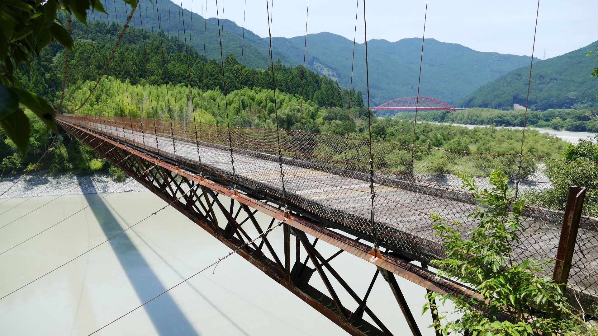 渡本橋の約5.2km上流に架かる全長約130mの吊橋。 見た目と裏腹に揺れが大きく手摺りも不安定でかつ、木板が腐りかけている。 |