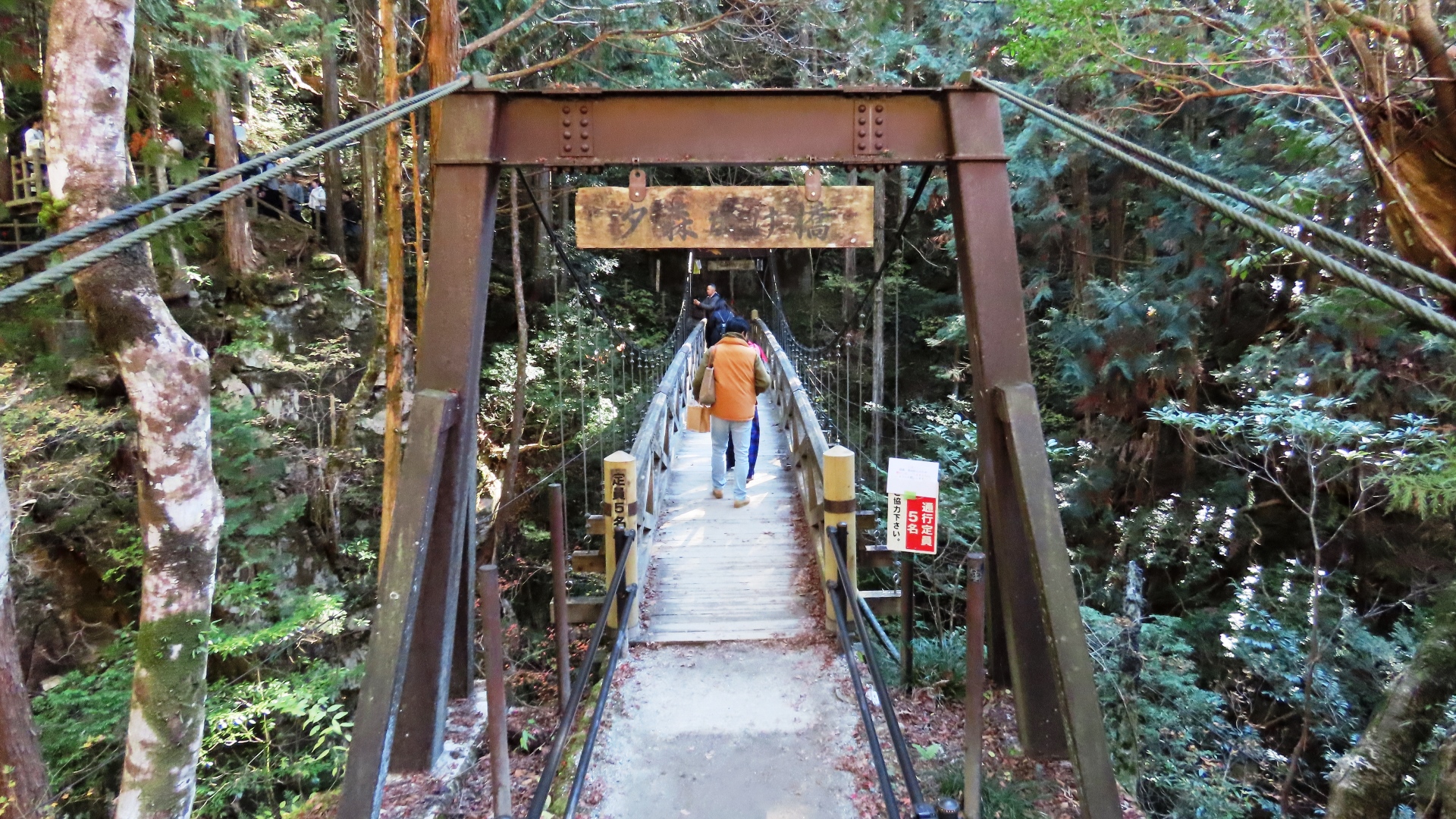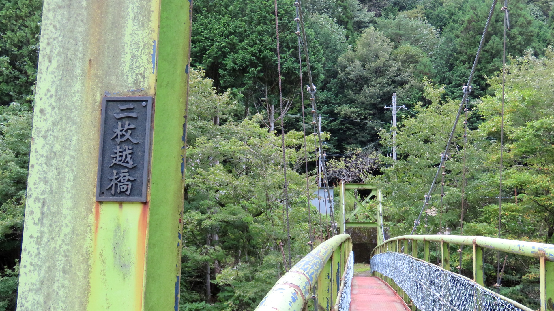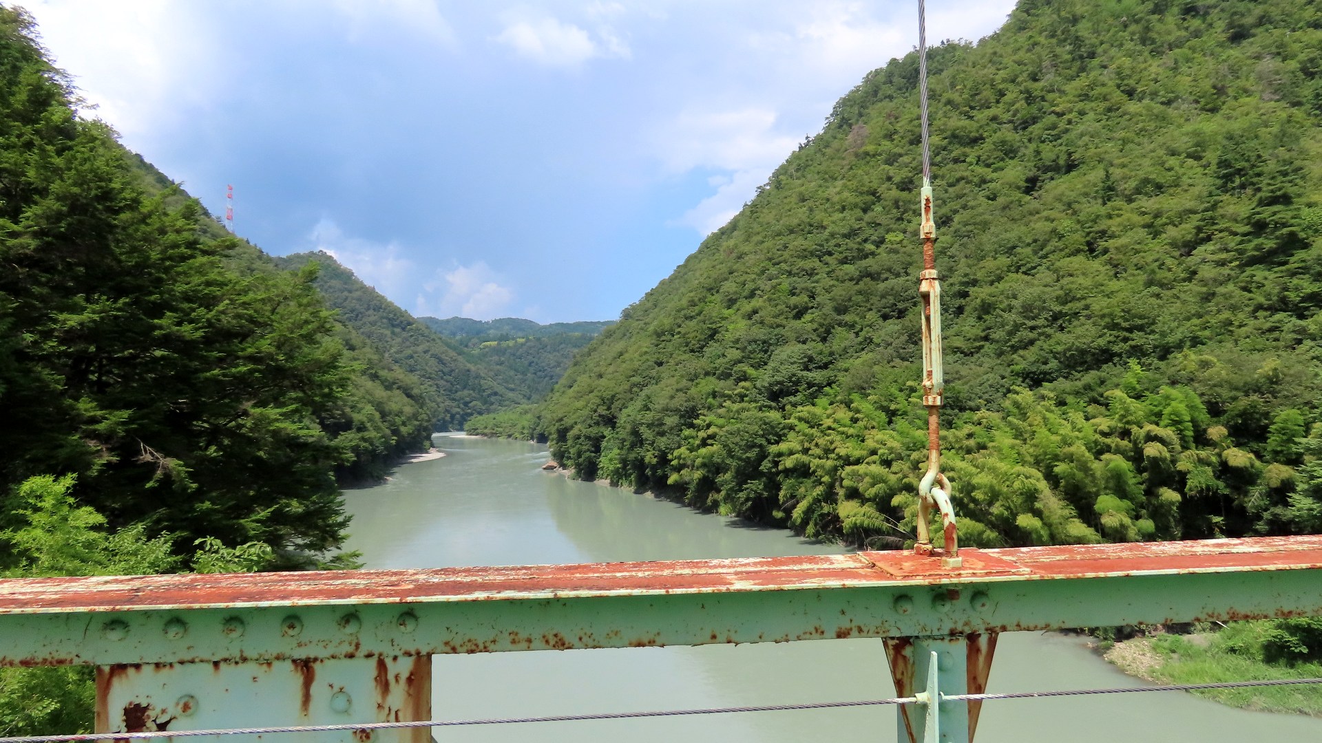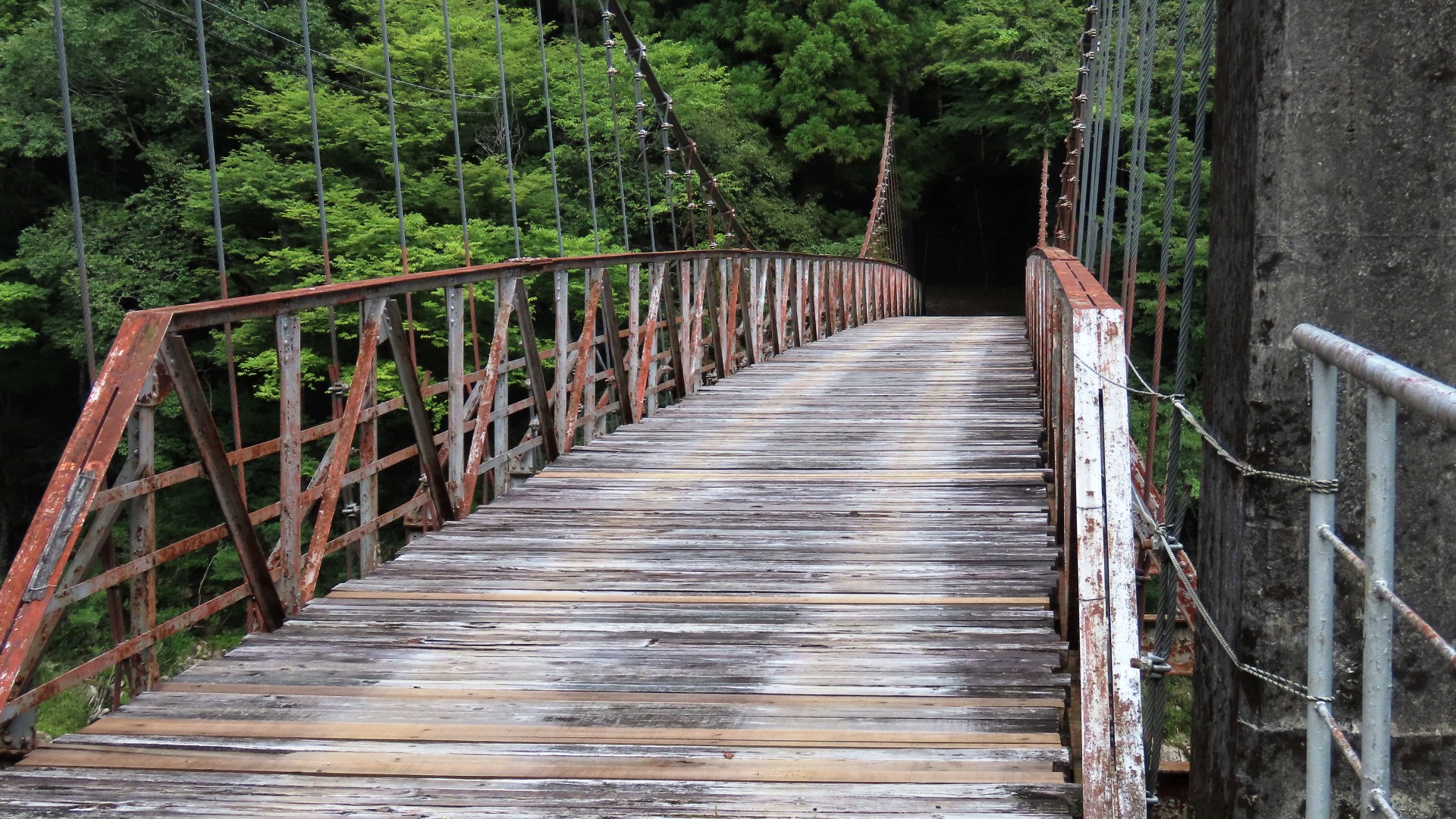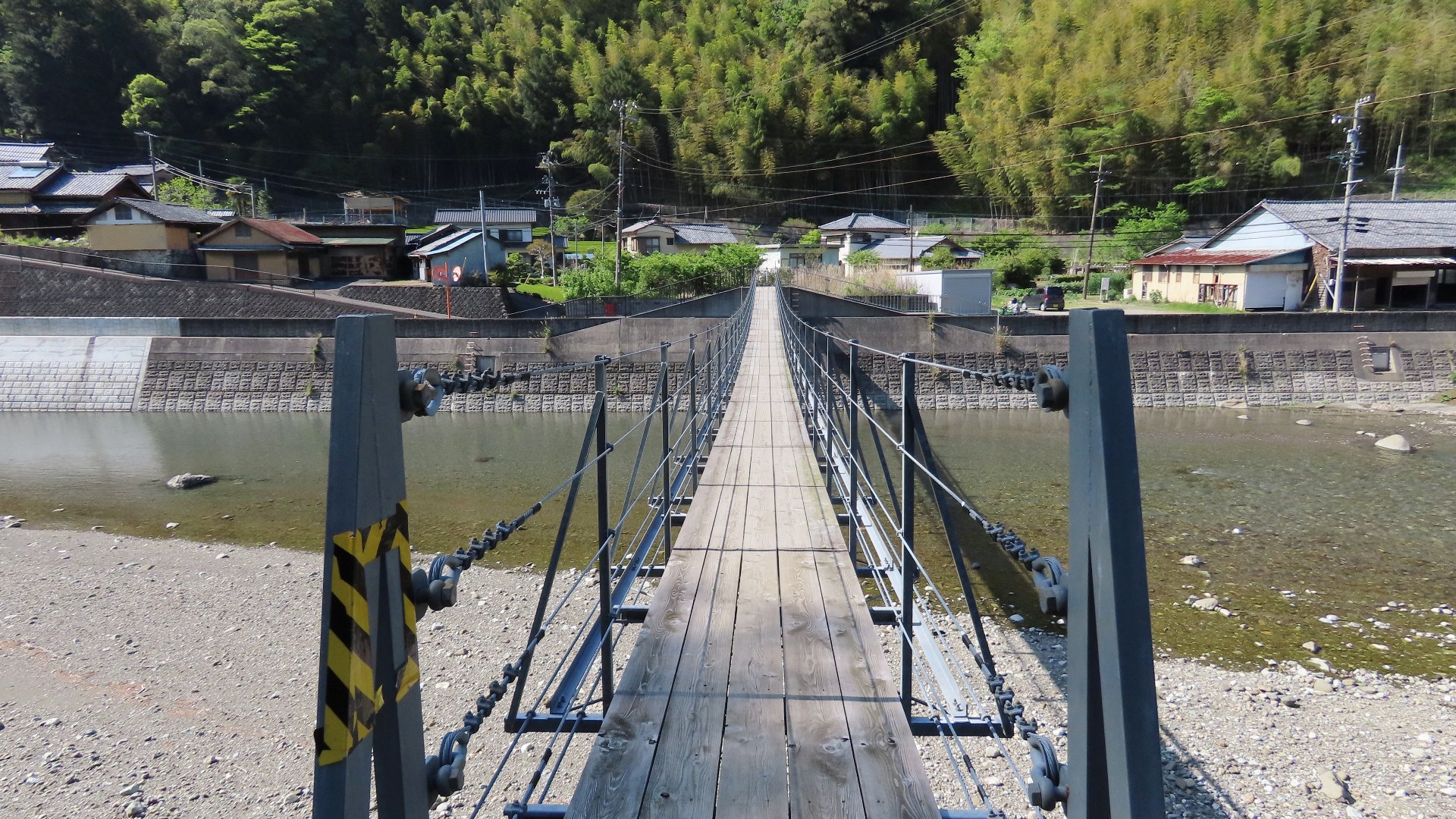 渡本橋の約5.2km上流に架かる全長約130mの吊橋。 見た目と裏腹に揺れが大きく手摺りも不安定でかつ、木板が腐りかけている。 |