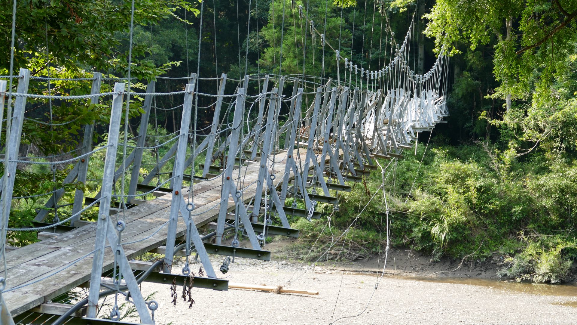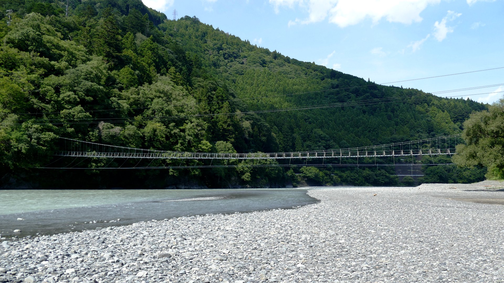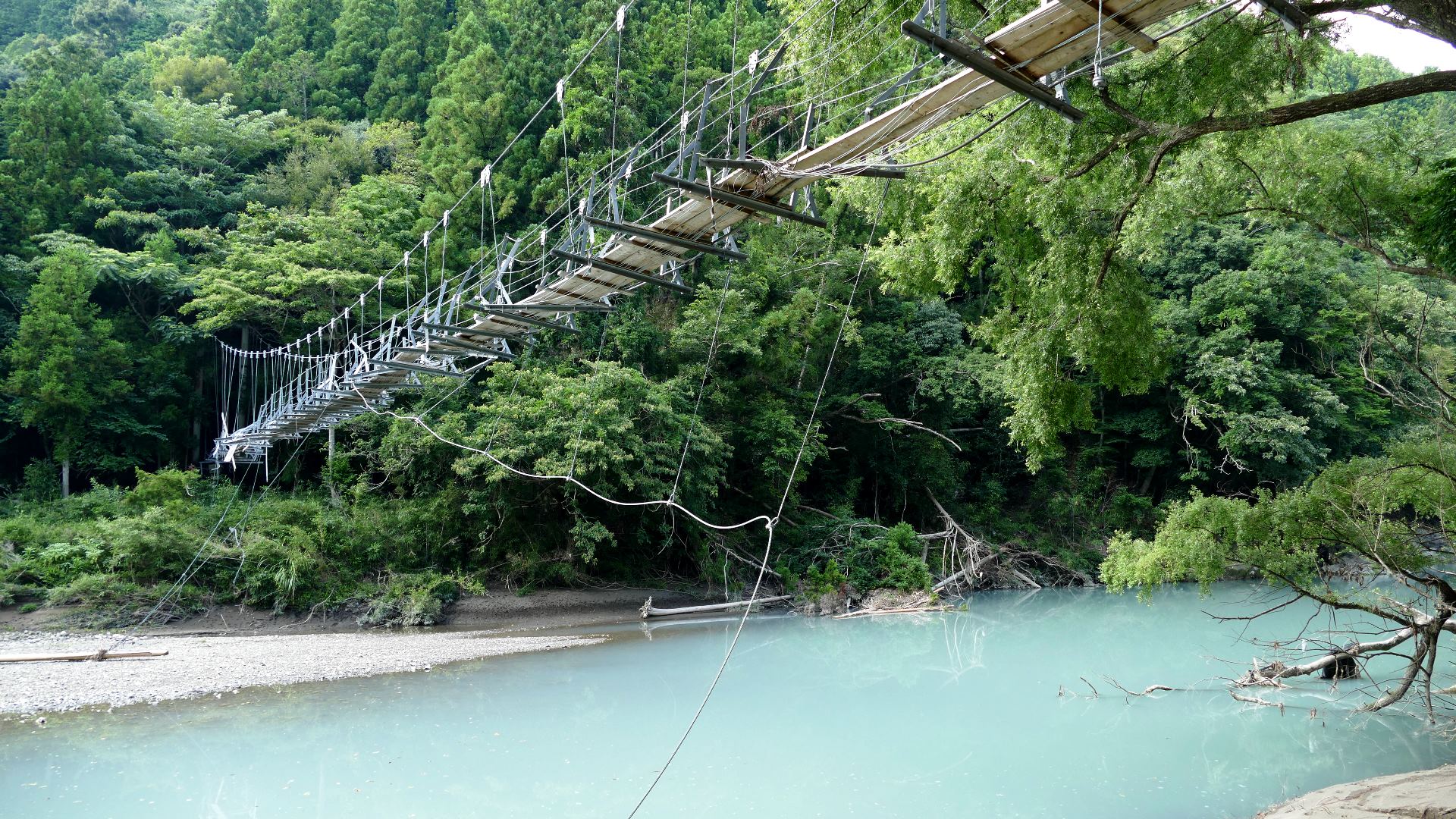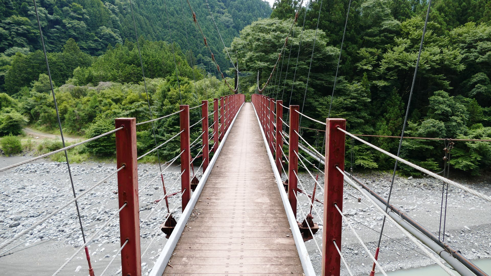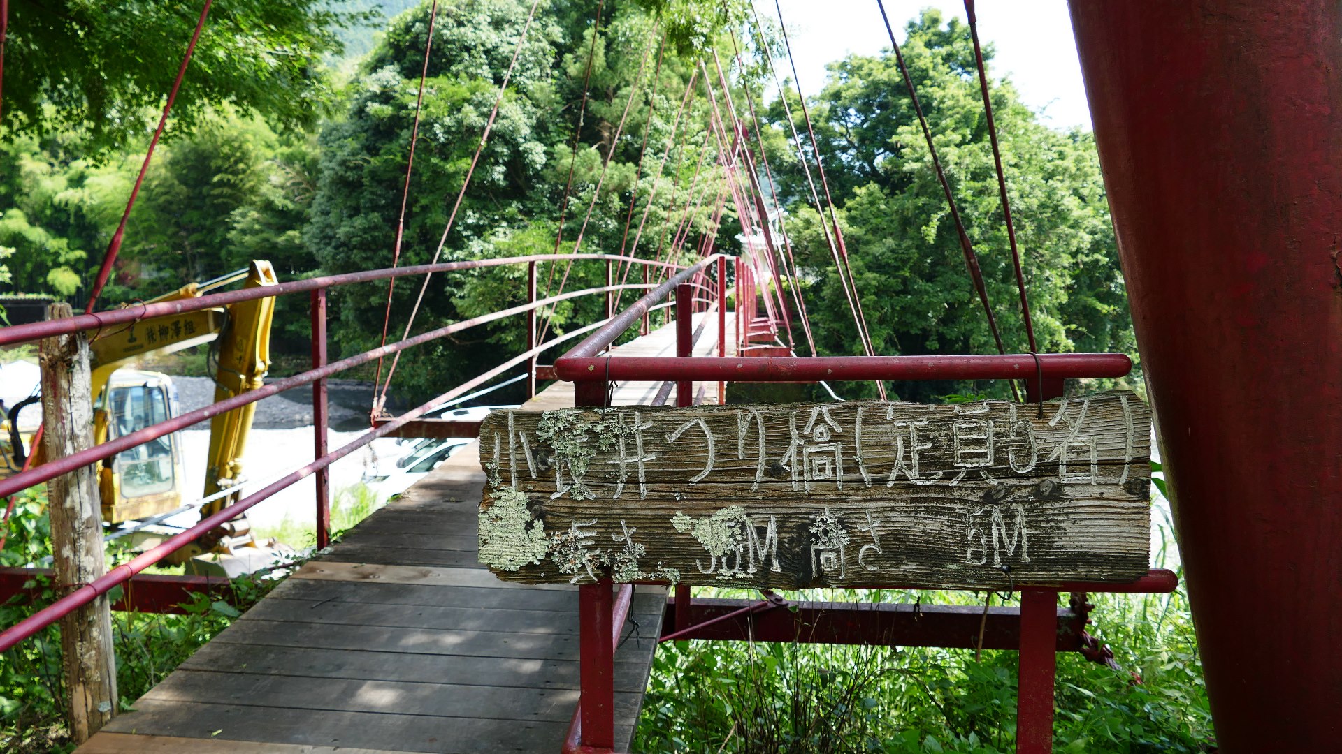 渡本橋の約5.2km上流に架かる全長約130mの吊橋。 見た目と裏腹に揺れが大きく手摺りも不安定でかつ、木板が腐りかけている。 |