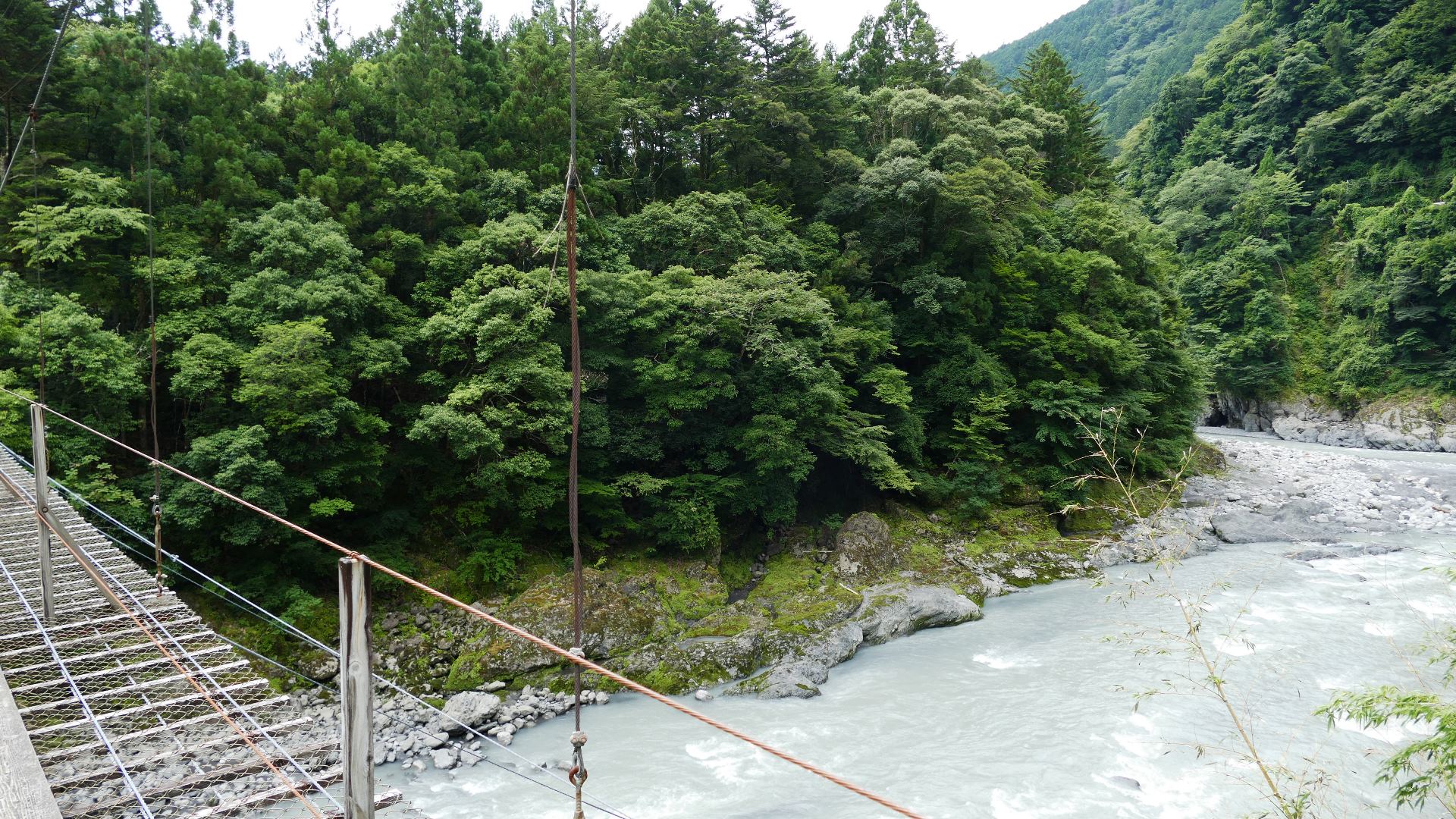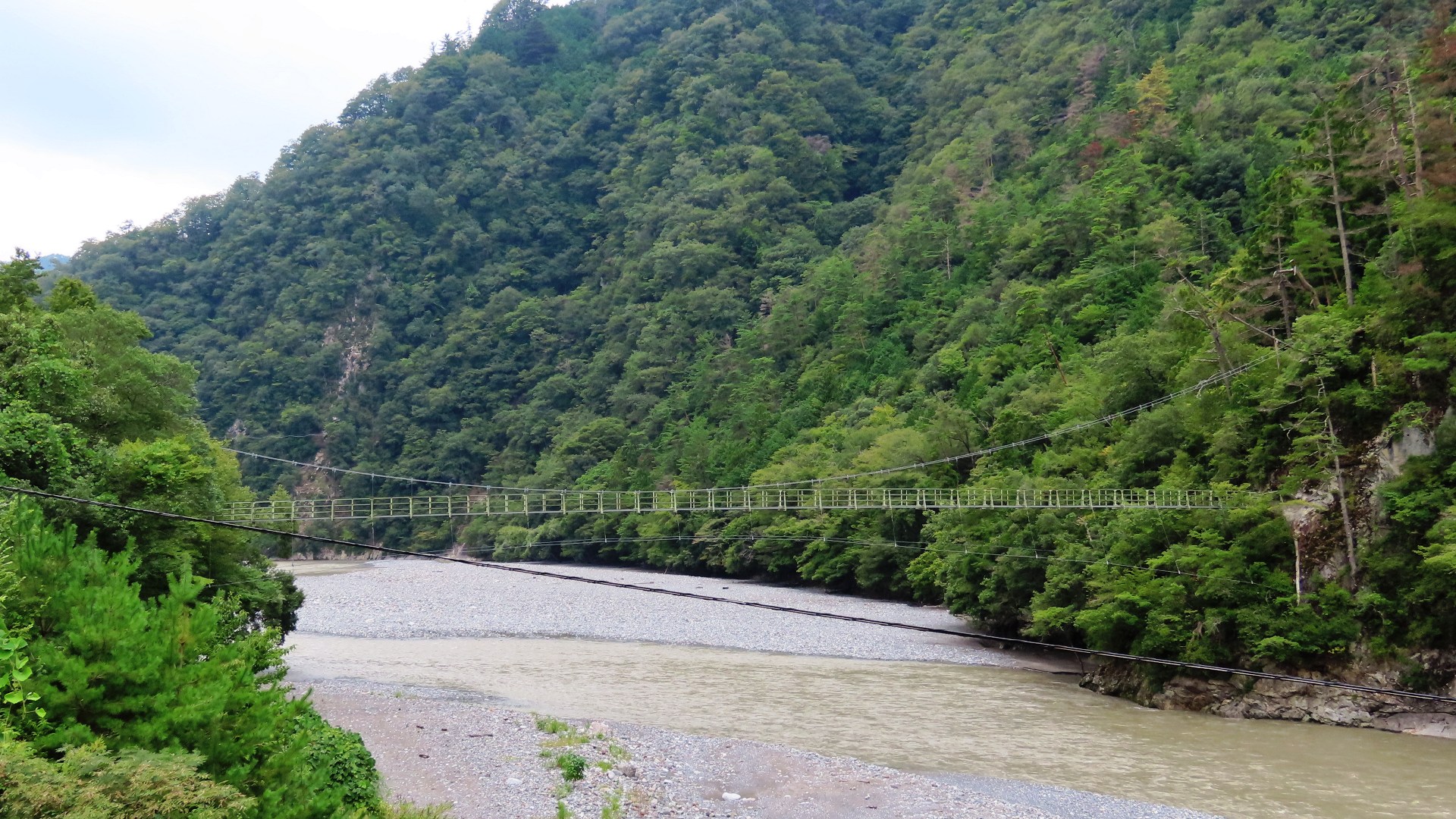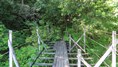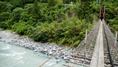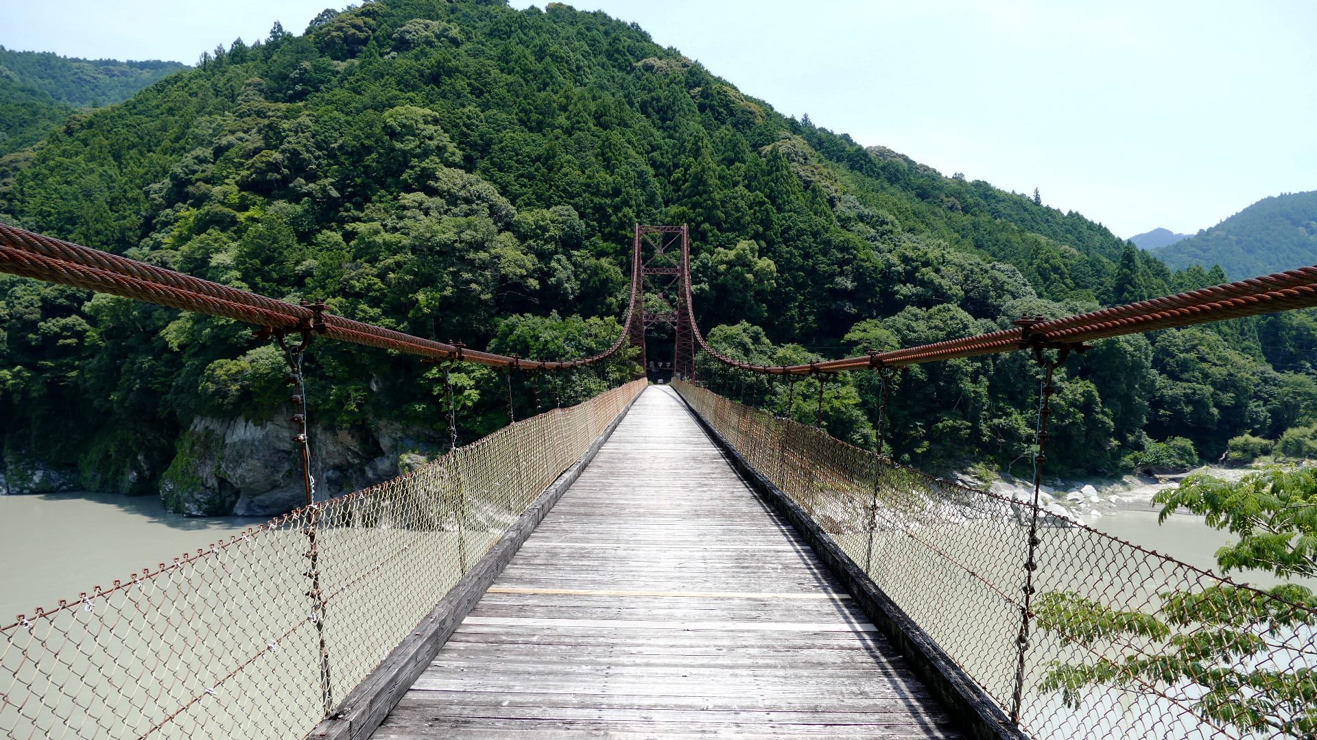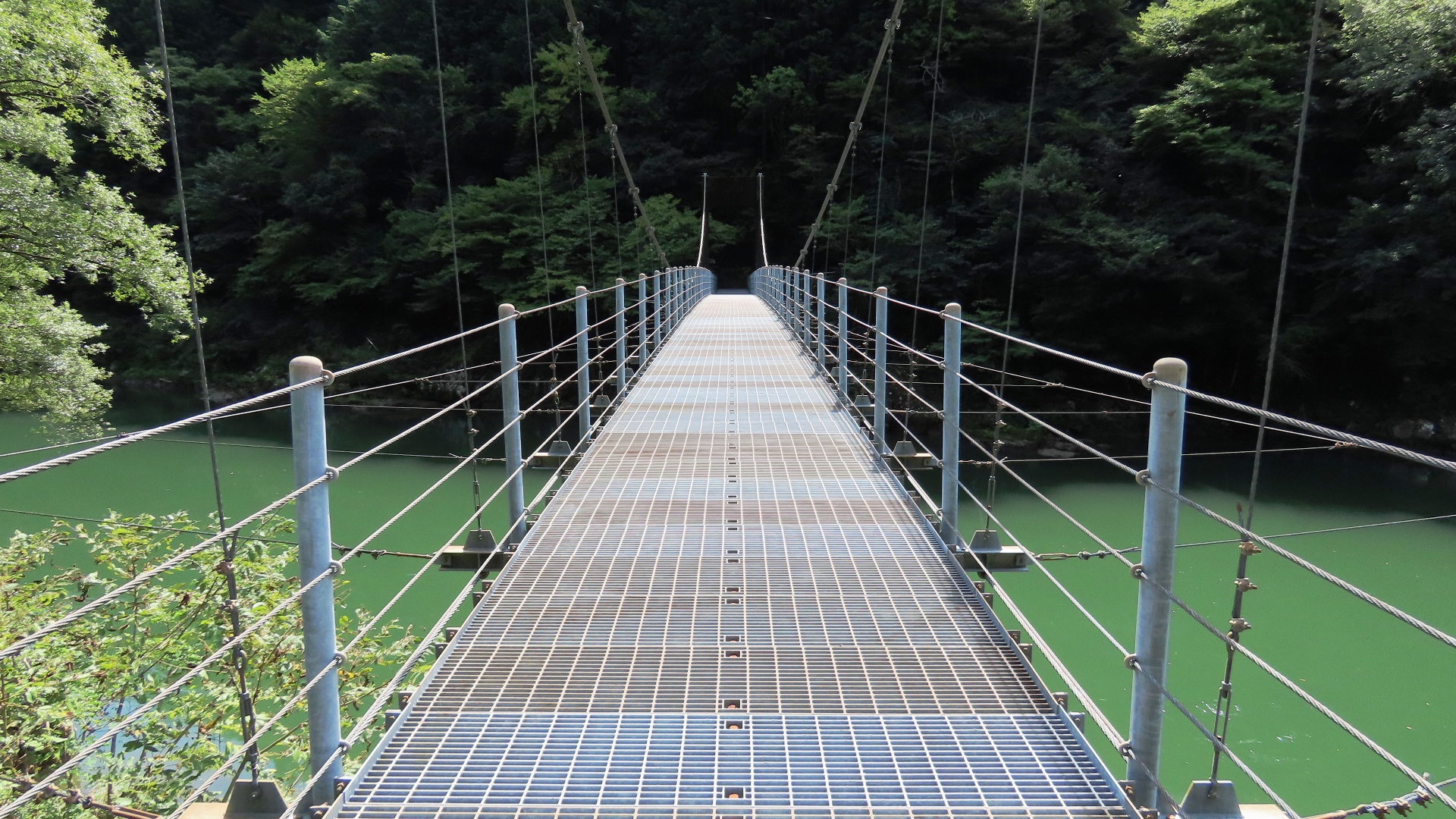 渡本橋の約5.2km上流に架かる全長約130mの吊橋。 見た目と裏腹に揺れが大きく手摺りも不安定でかつ、木板が腐りかけている。 |