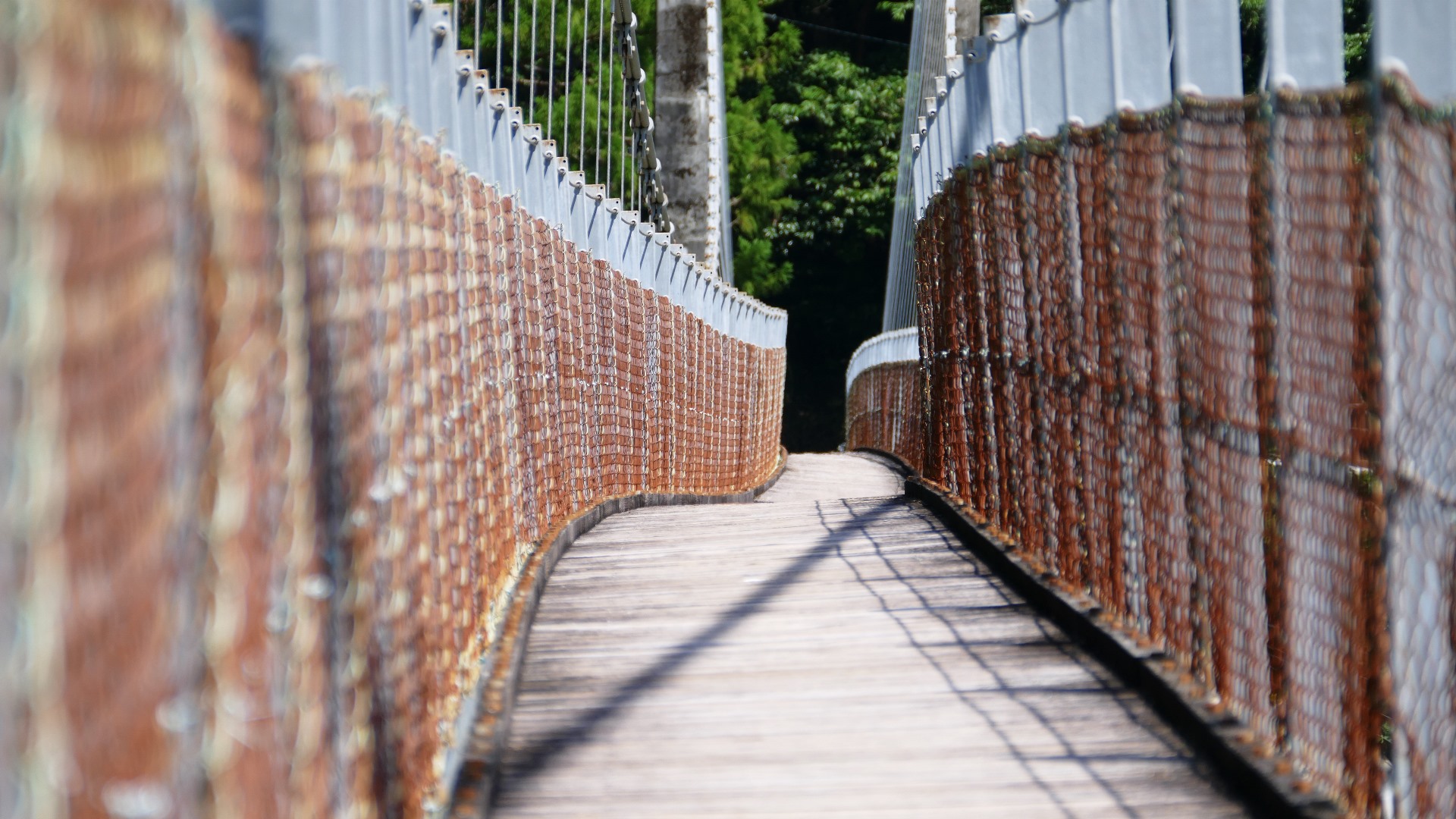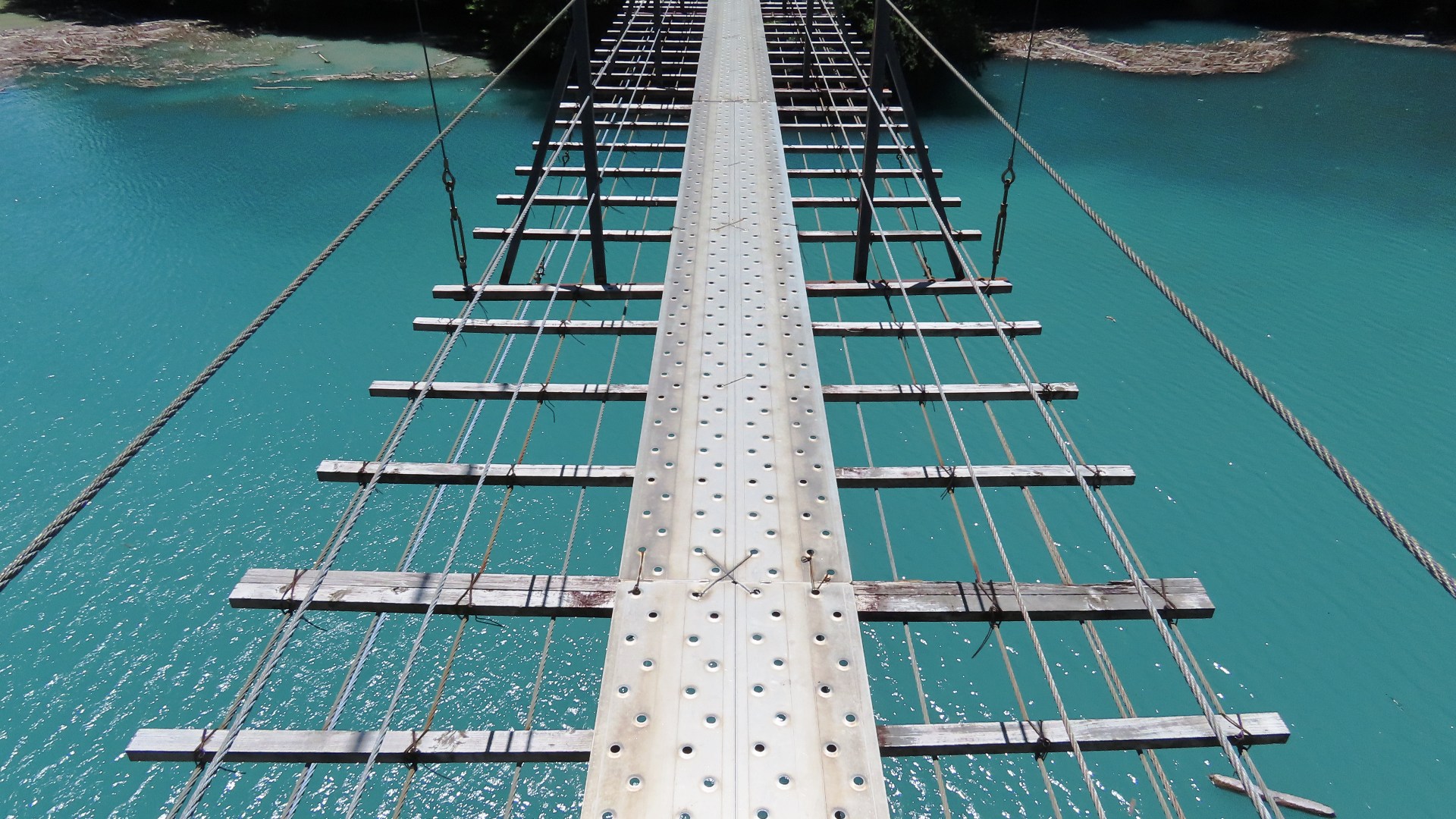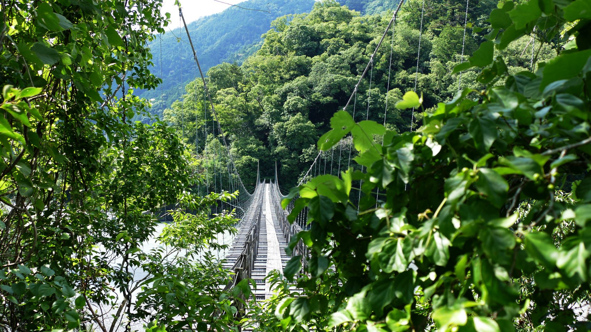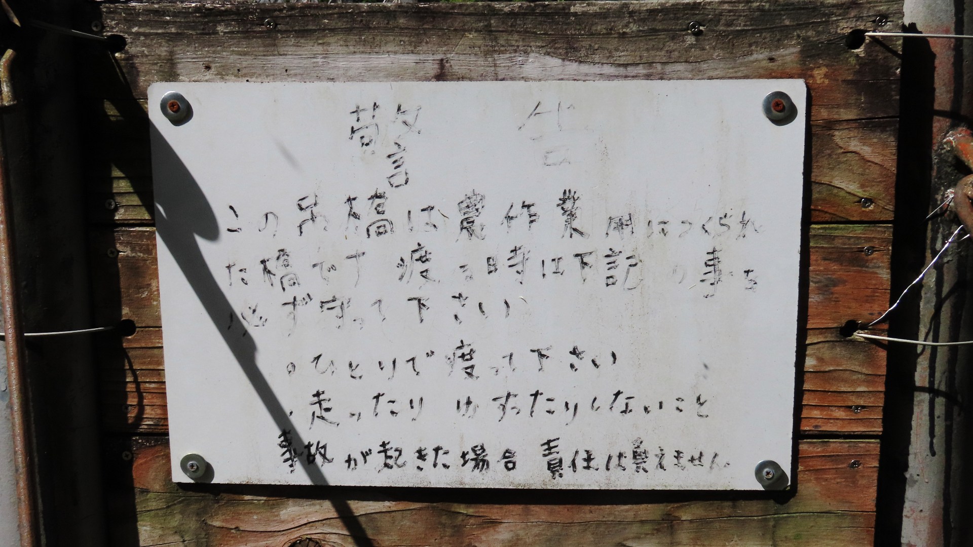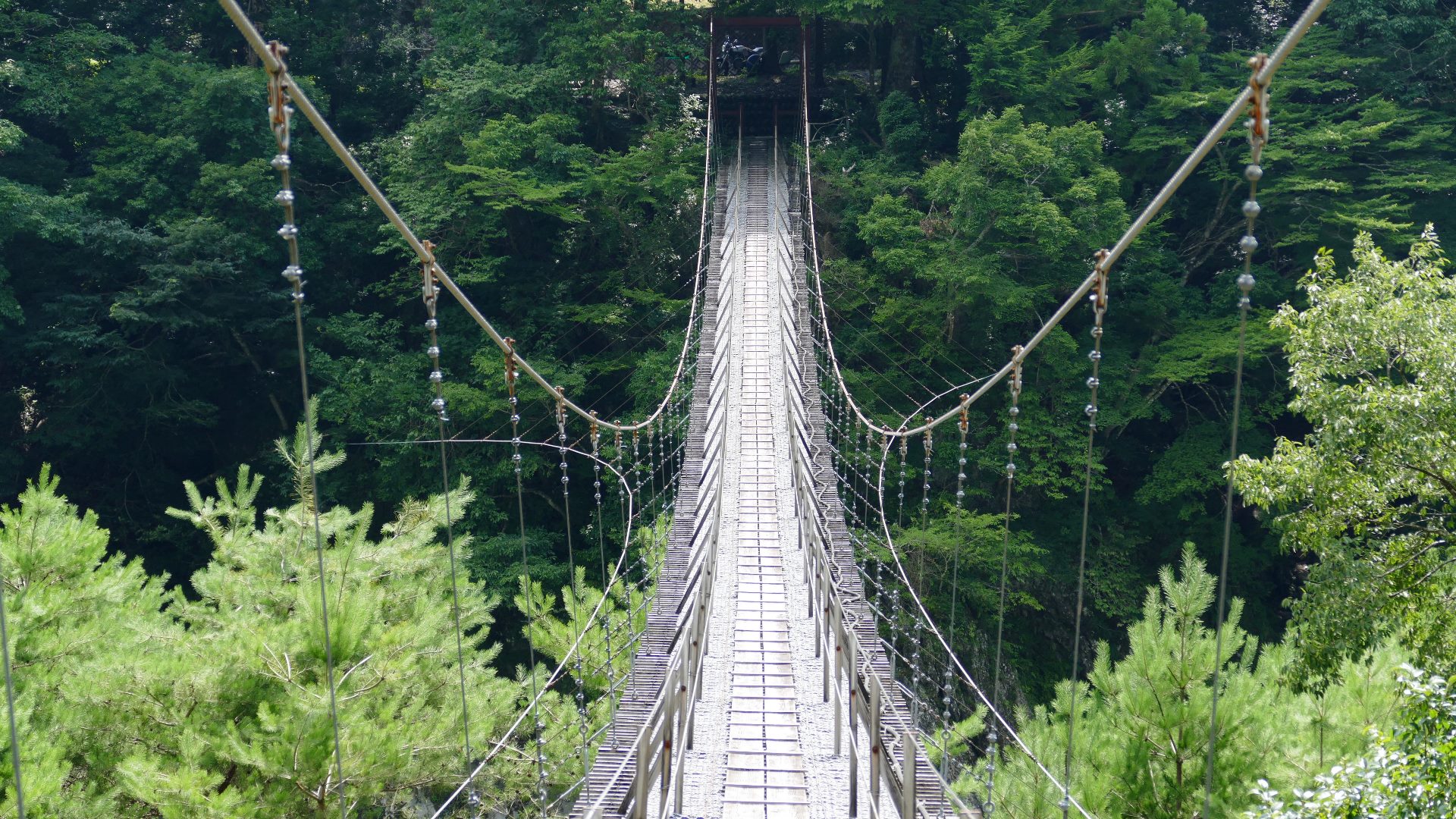 渡本橋の約5.2km上流に架かる全長約130mの吊橋。 見た目と裏腹に揺れが大きく手摺りも不安定でかつ、木板が腐りかけている。 |