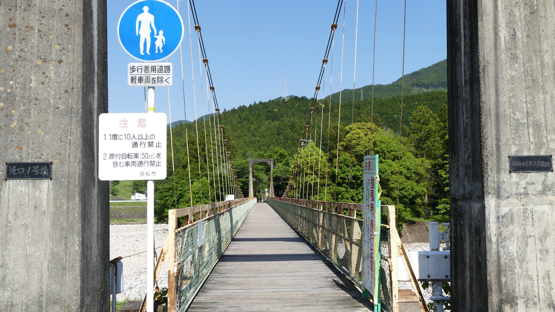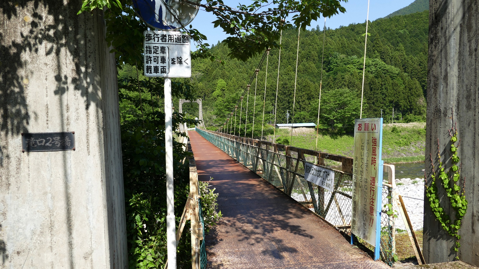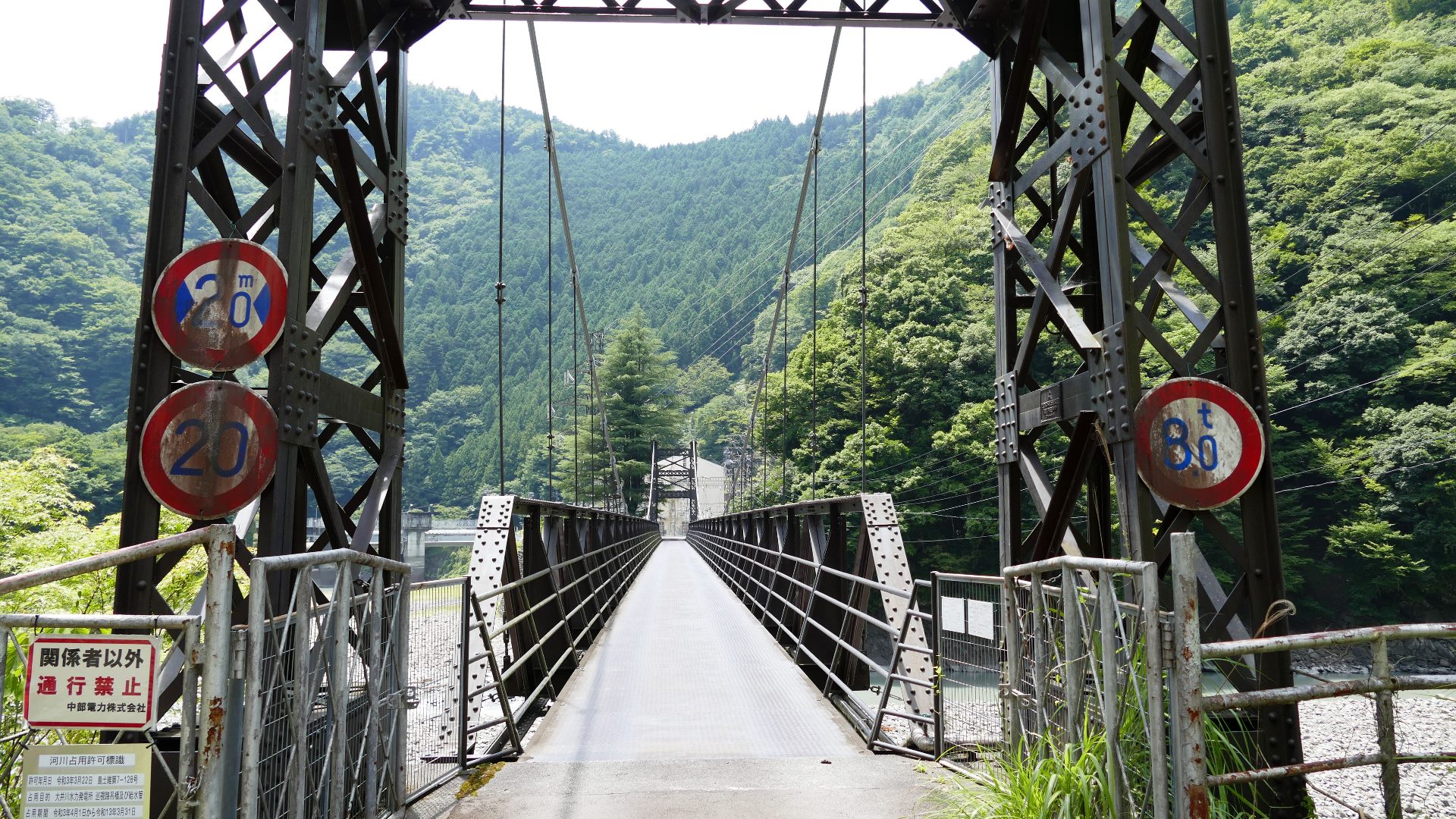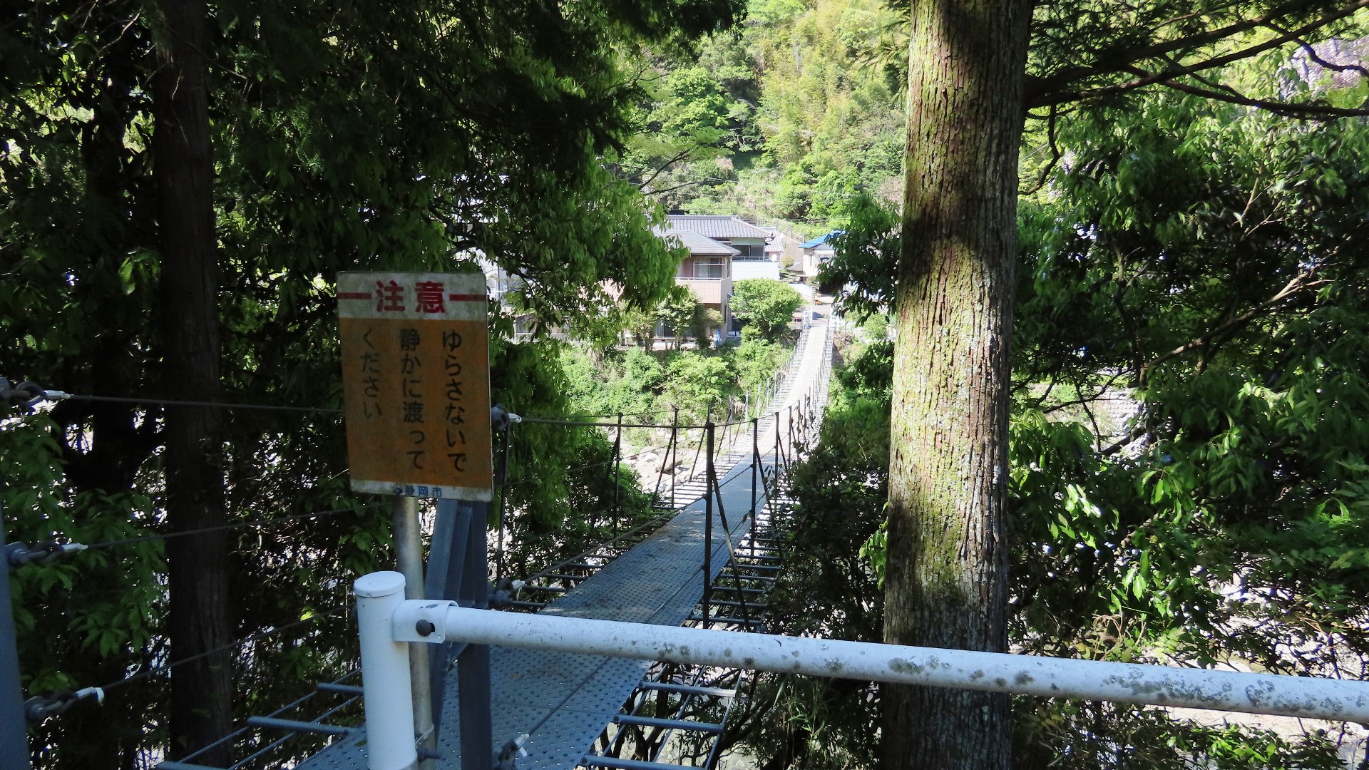 | 中部電力押山発電所へ行く専用吊り橋で関係者以外渡れない。また通行制限荷重は200kgまで。途中でカーブしている珍しい吊り橋。 2020.5 | |||||||