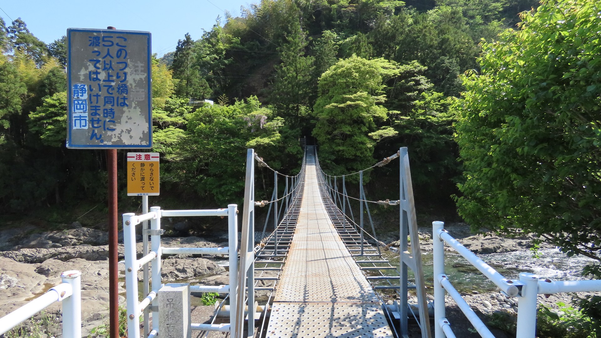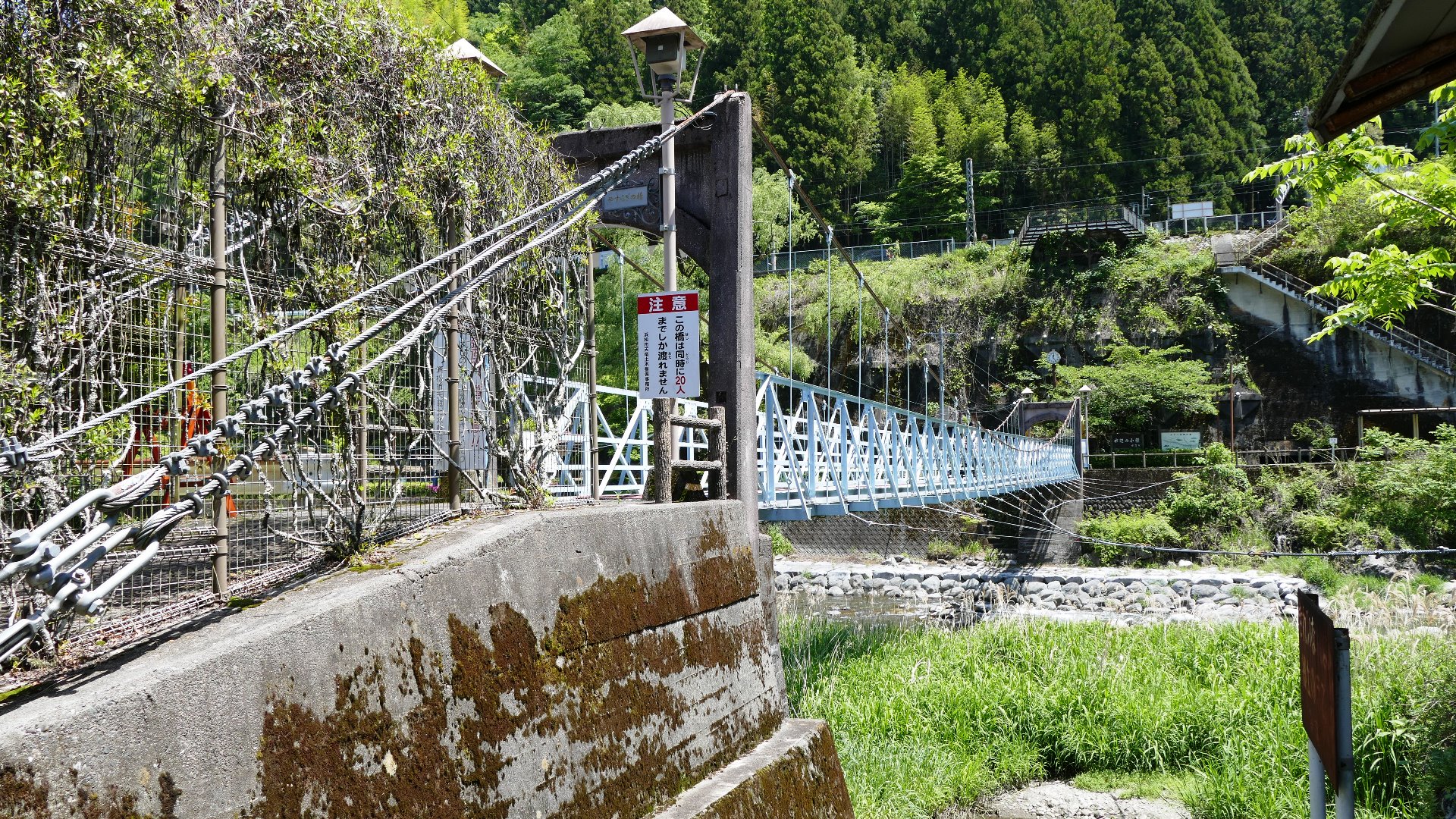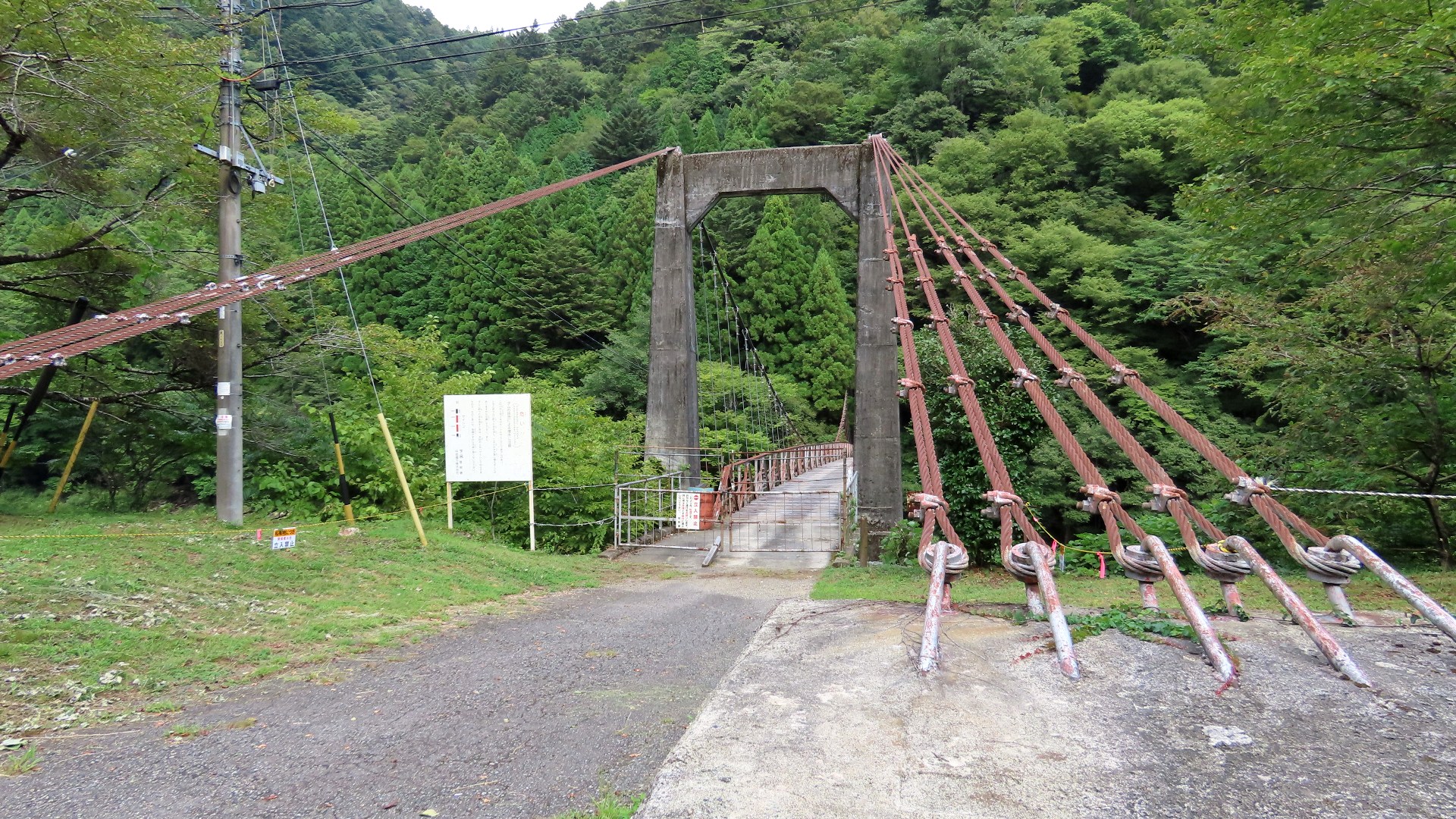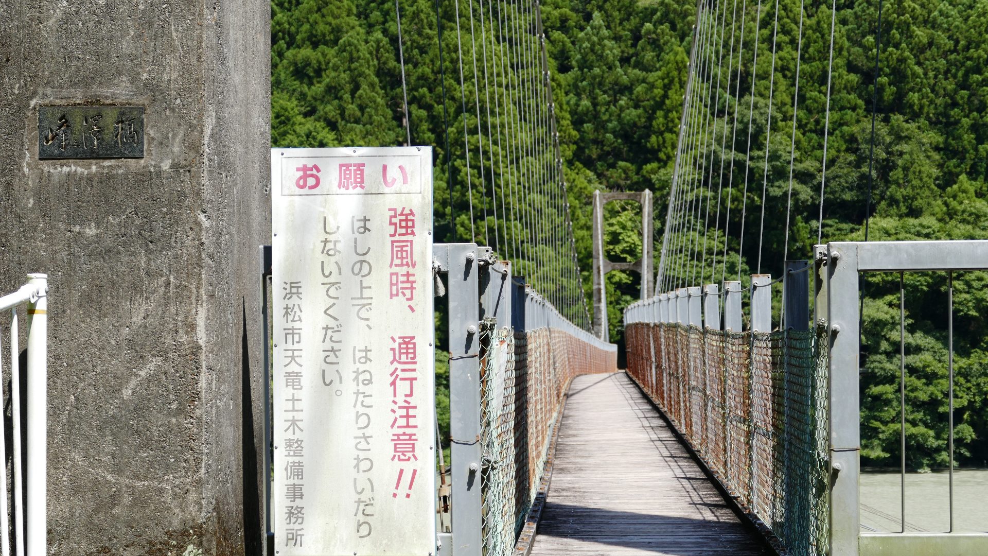 | 中部電力押山発電所へ行く専用吊り橋で関係者以外渡れない。また通行制限荷重は200kgまで。途中でカーブしている珍しい吊り橋。 2020.5 | |||||||