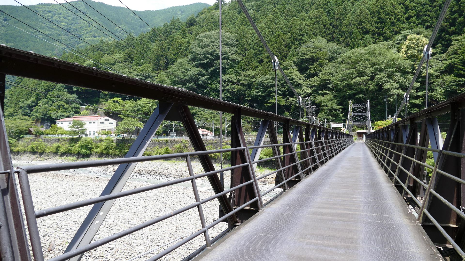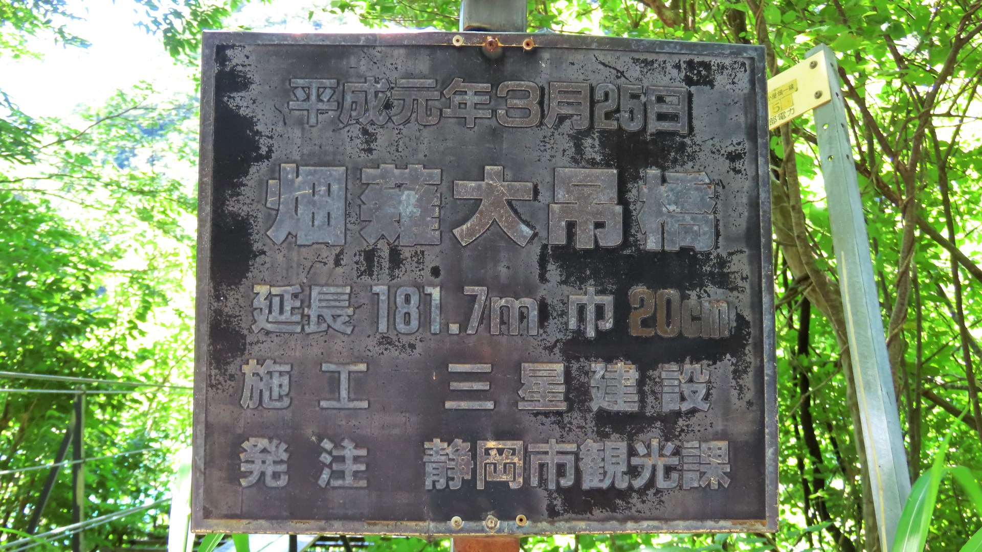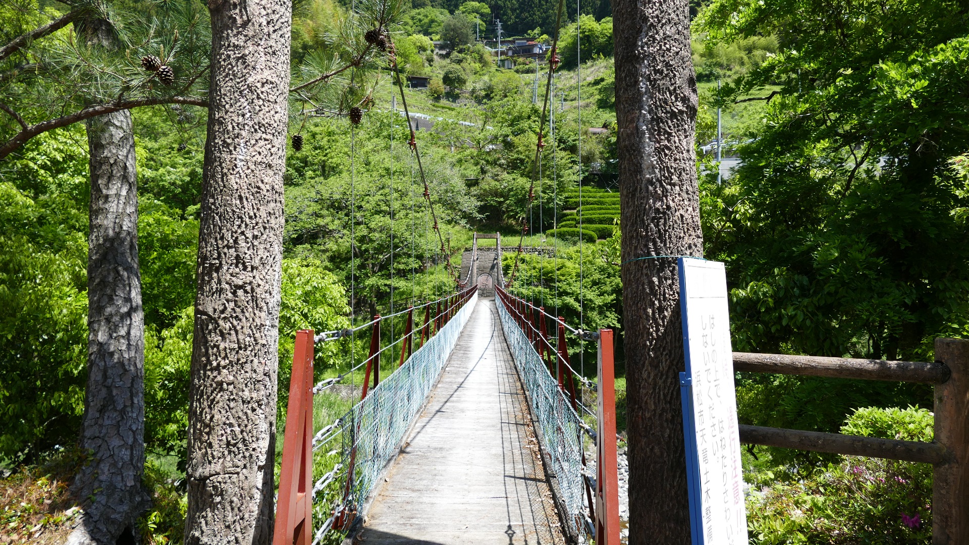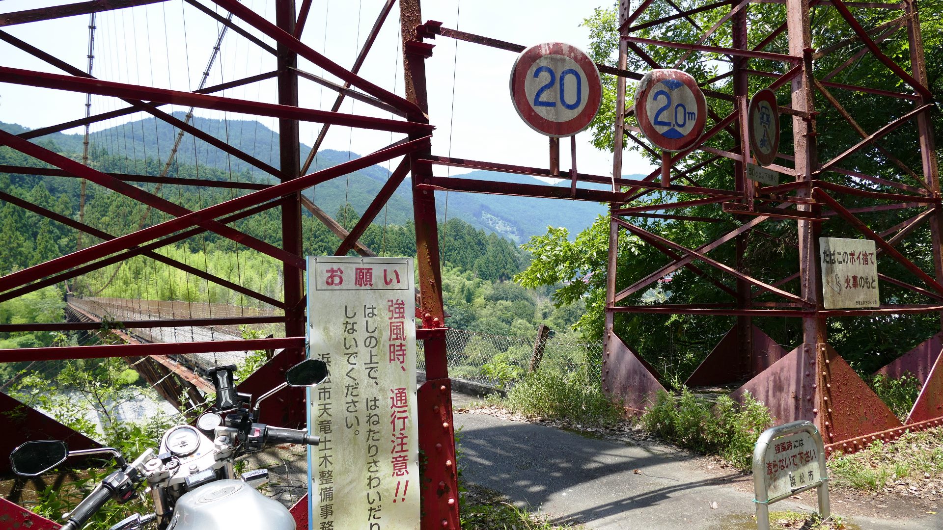 | 中部電力押山発電所へ行く専用吊り橋で関係者以外渡れない。また通行制限荷重は200kgまで。途中でカーブしている珍しい吊り橋。 2020.5 | |||||||