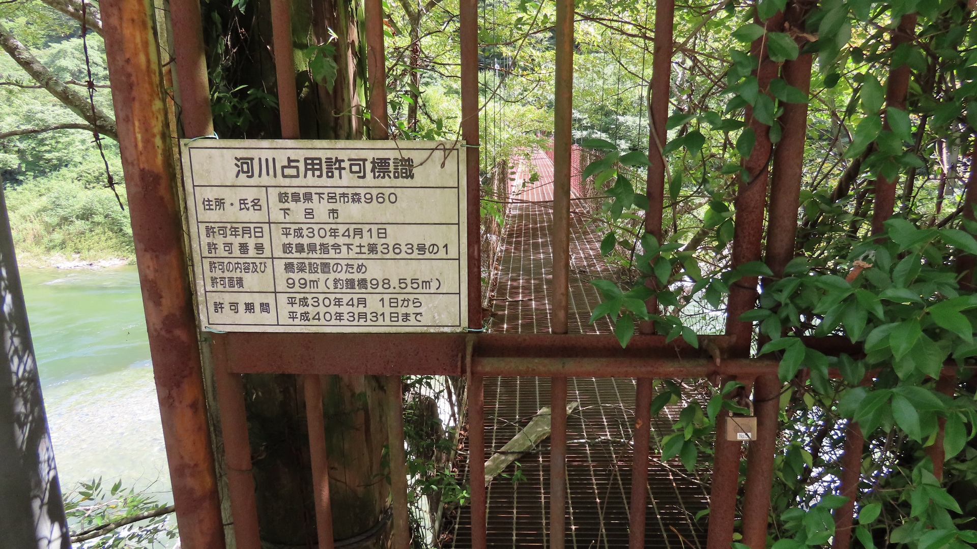 | 国道41号沿い、焼石以北にある飛騨川に架かる吊橋 施錠してあって渡れない吊橋 銘板 2025.9 |