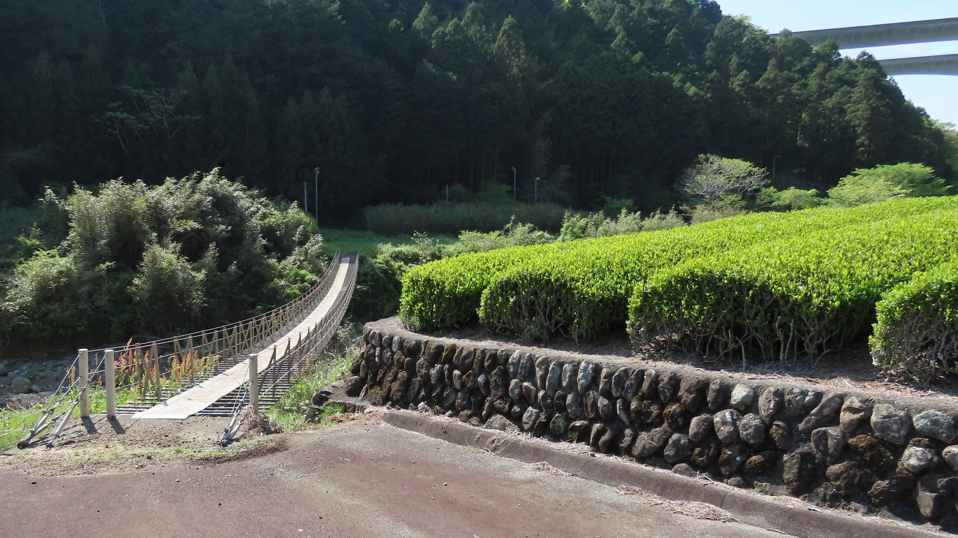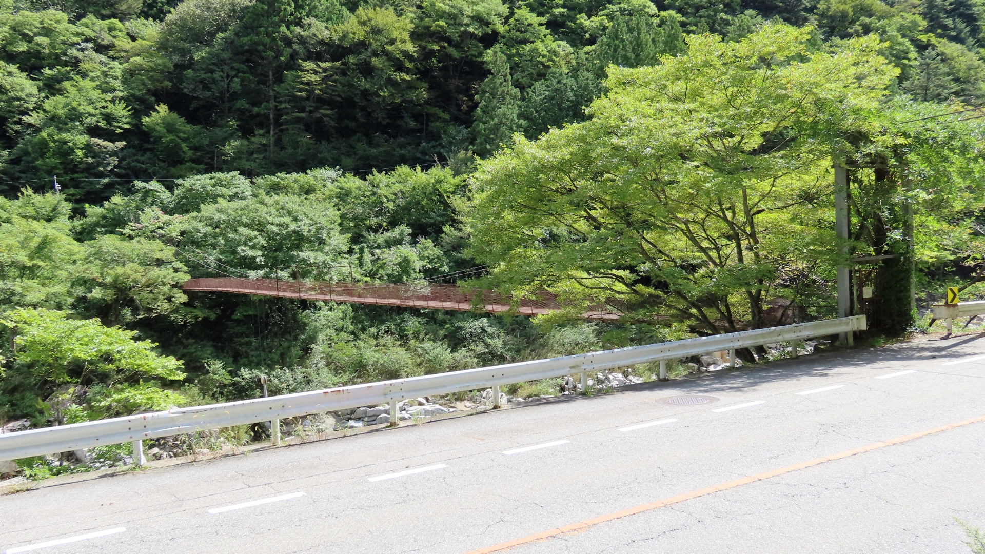 孫佐島橋の約3km上流に架かる全長約60mの県道をまたぐ吊橋。 橋の渡り口が分かりづらかった。 |