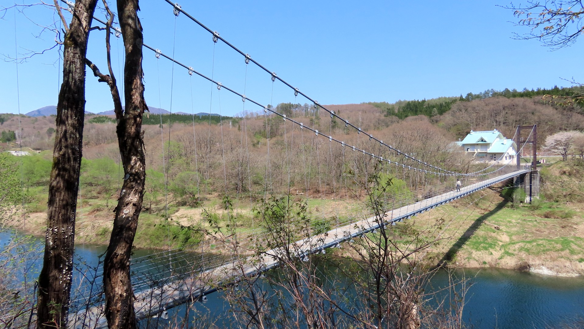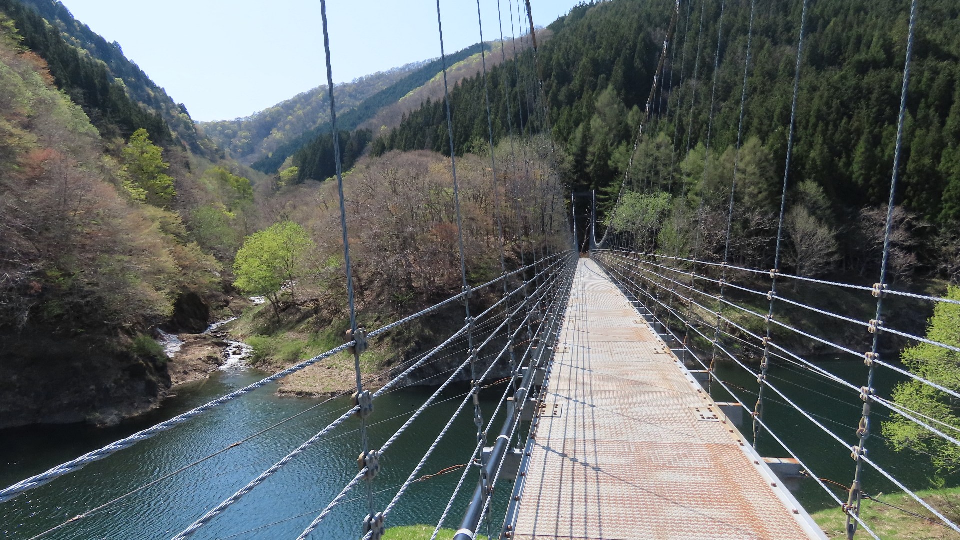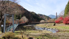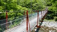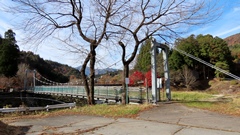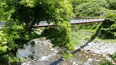 | 細野橋の約1.4km上流に架かる全長約110mの吊橋。 床板は木材で幅はかなり狭く水面からの高さもありスリル満点 |