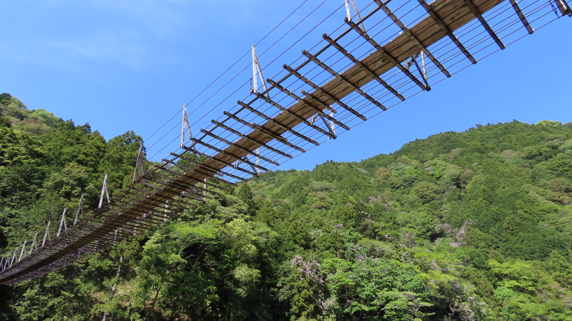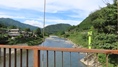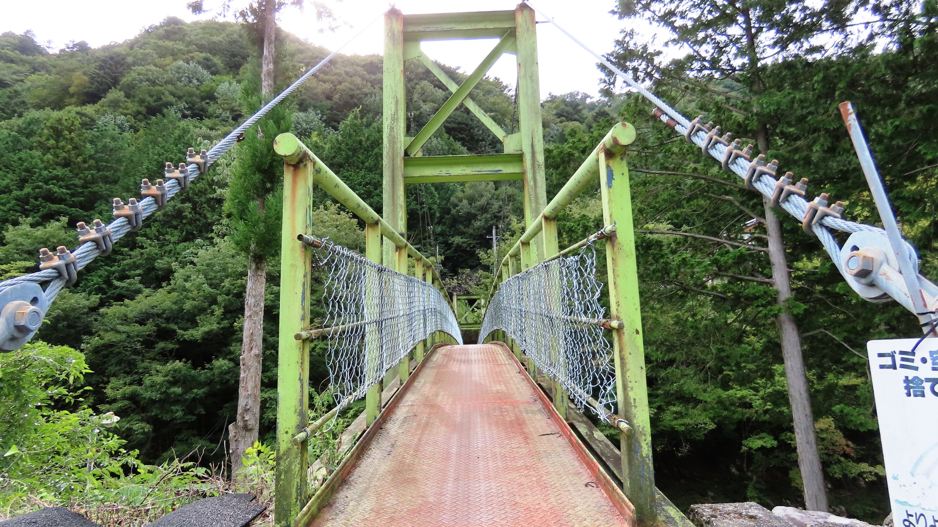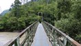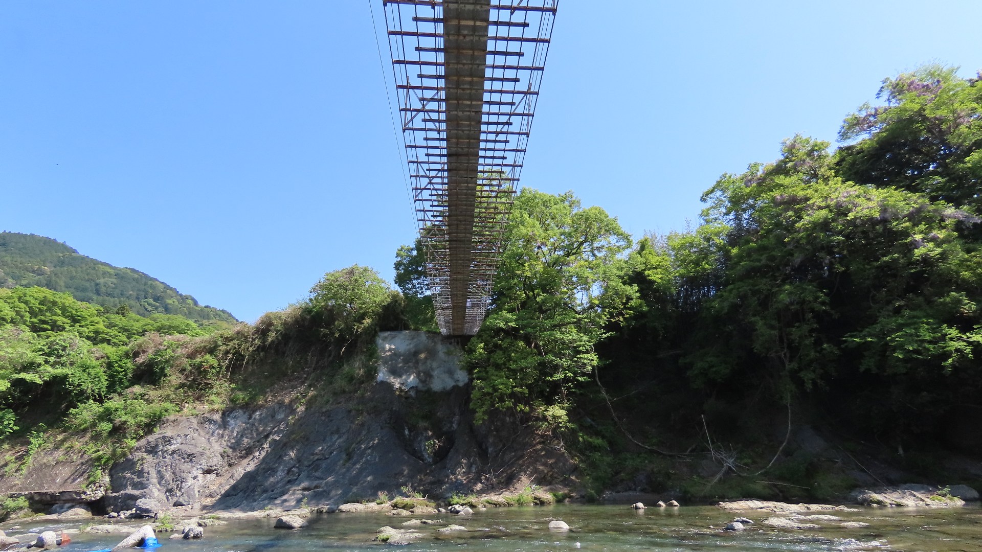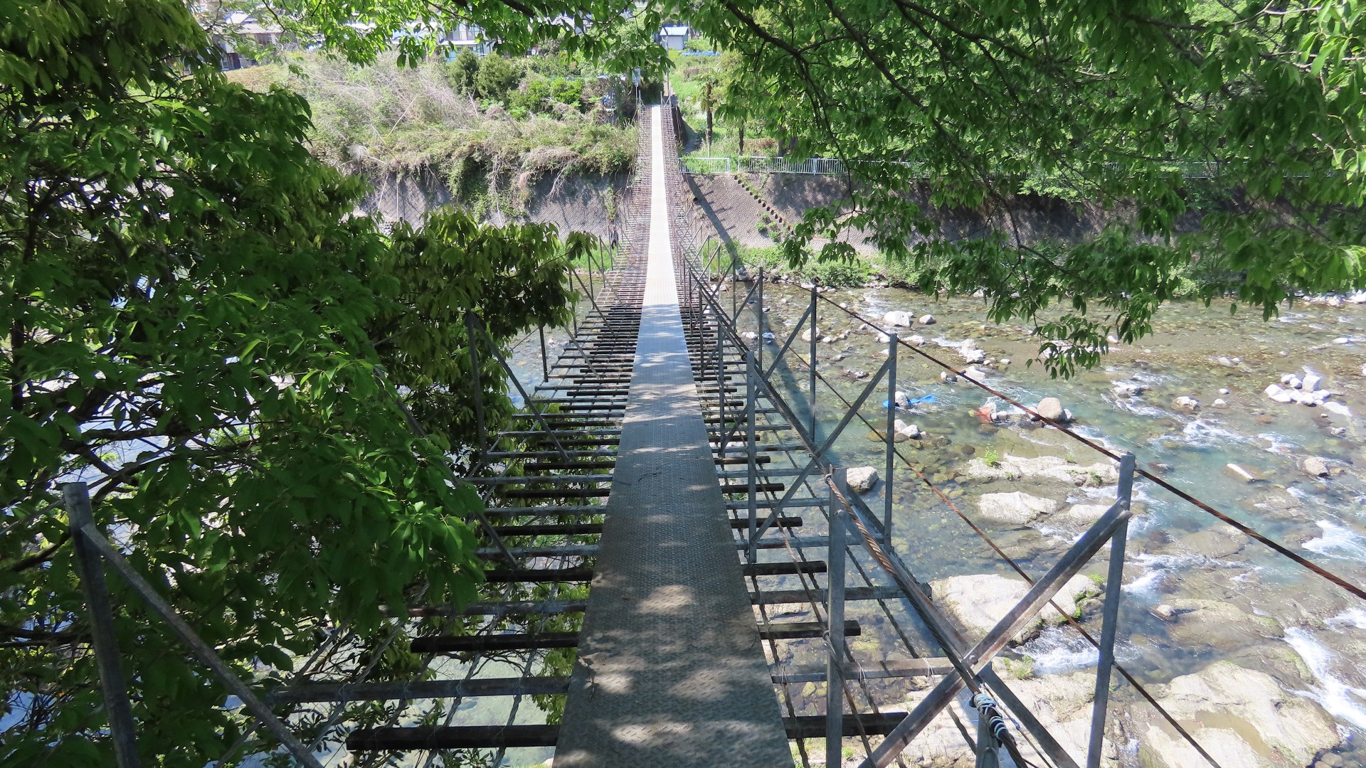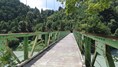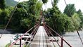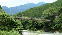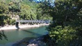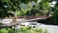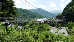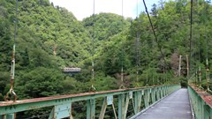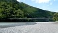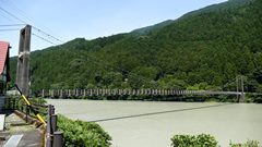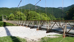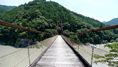 | 谷瀬の吊橋から3kmほど南にある長い吊り橋。 橋長186m 高さ12m 歩道部の木板が腐りかけでワクワク度が上がる。 対岸の小さな集落へ渡る生活橋で谷瀬の吊橋ほど観光地でないので人が皆無。 |