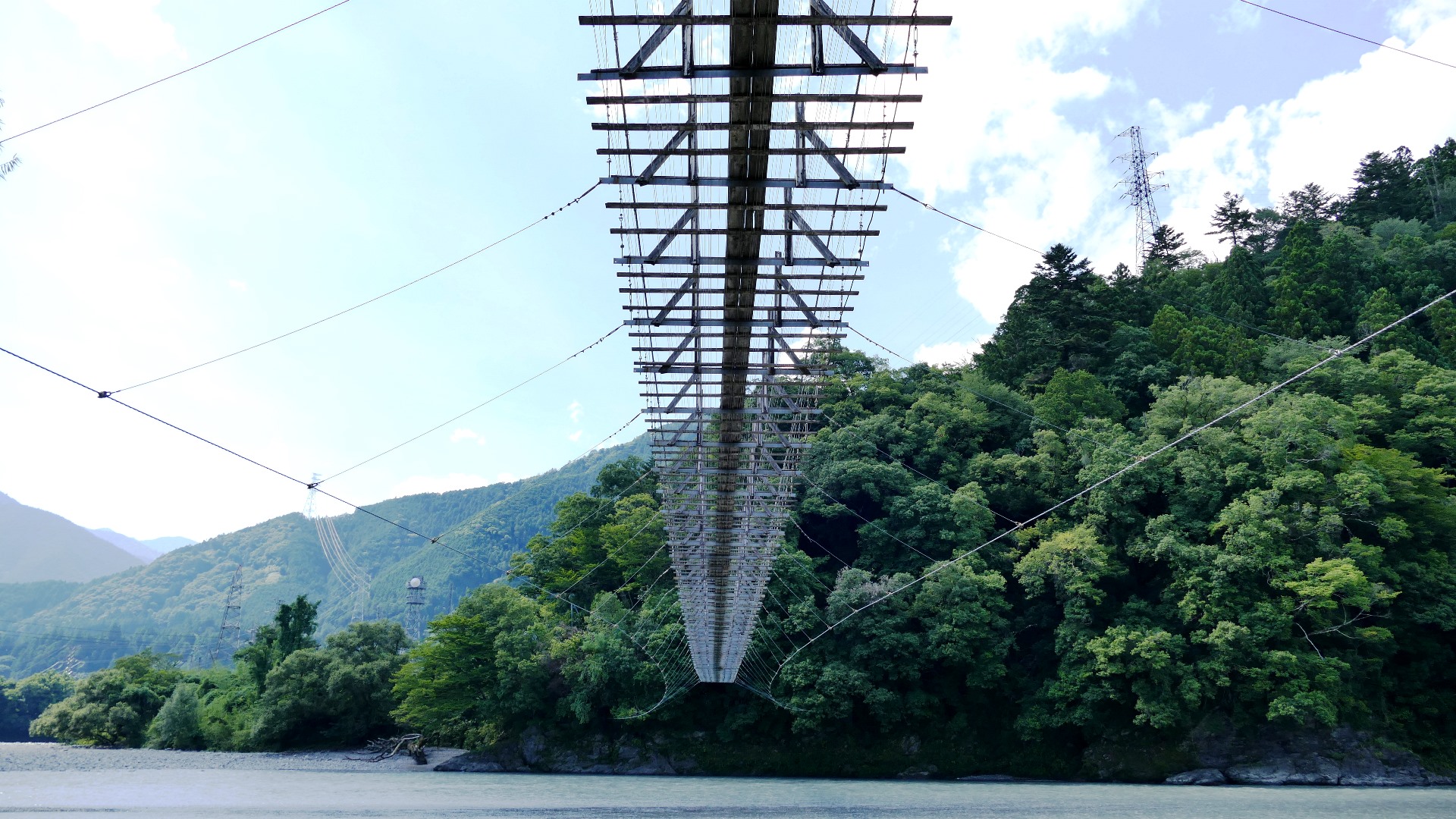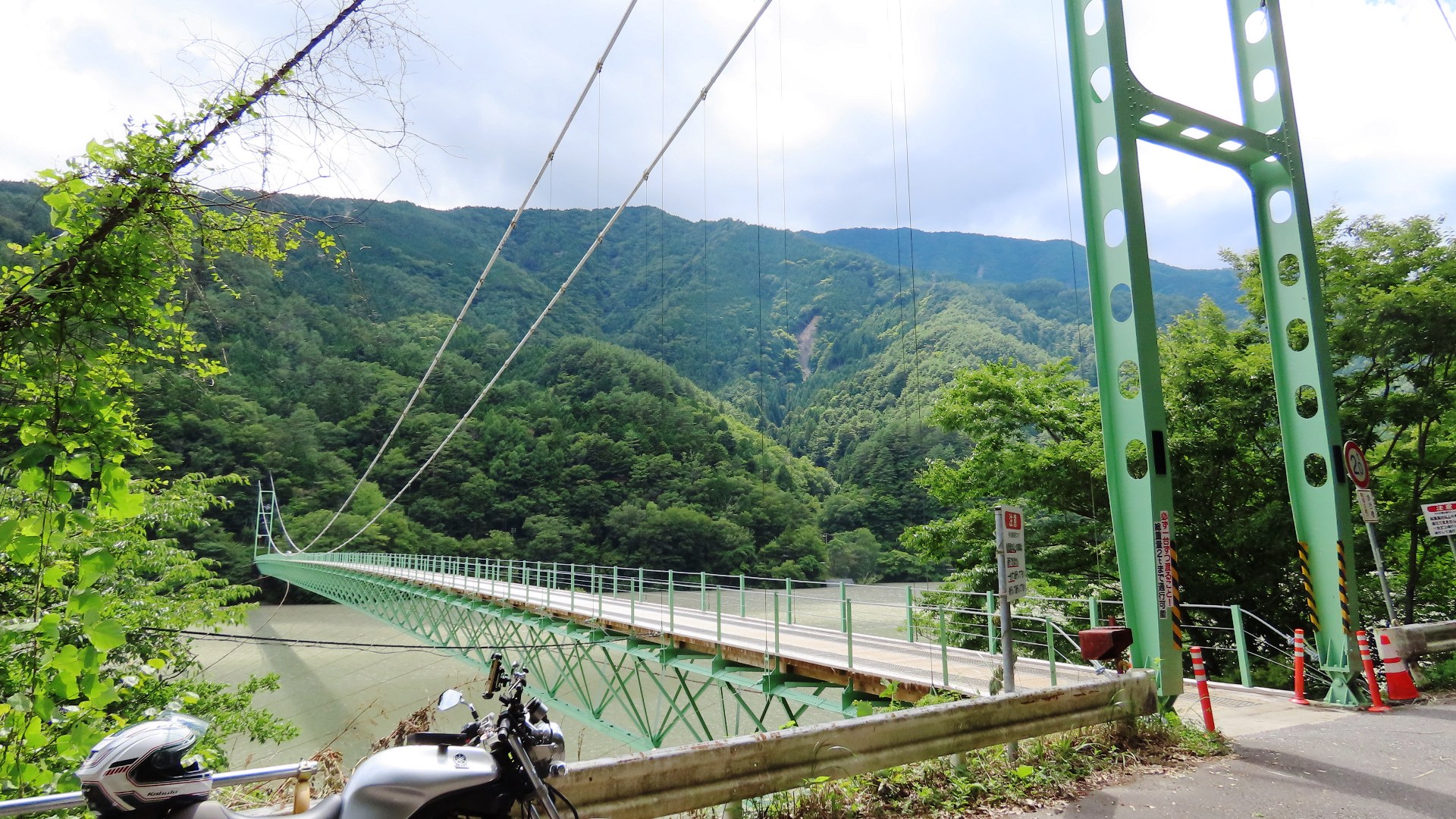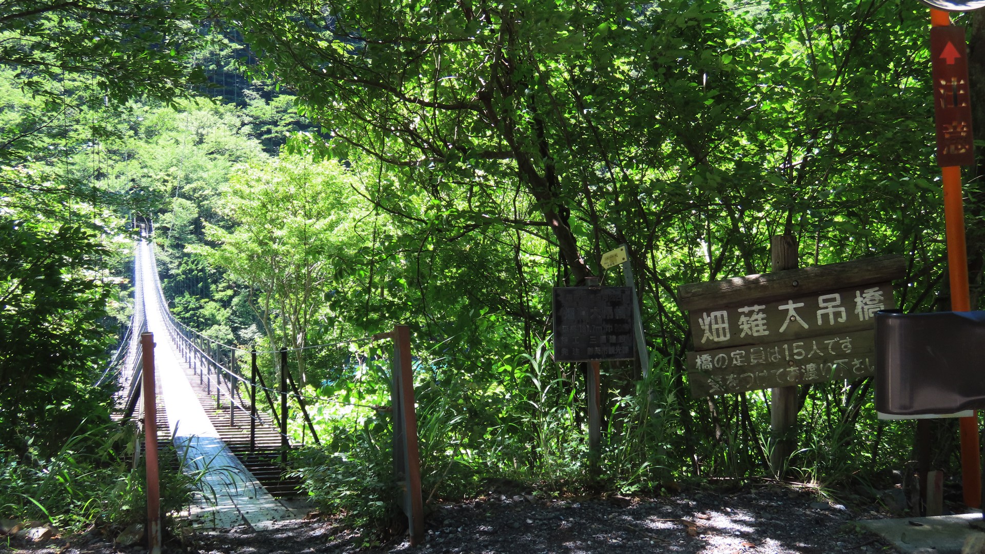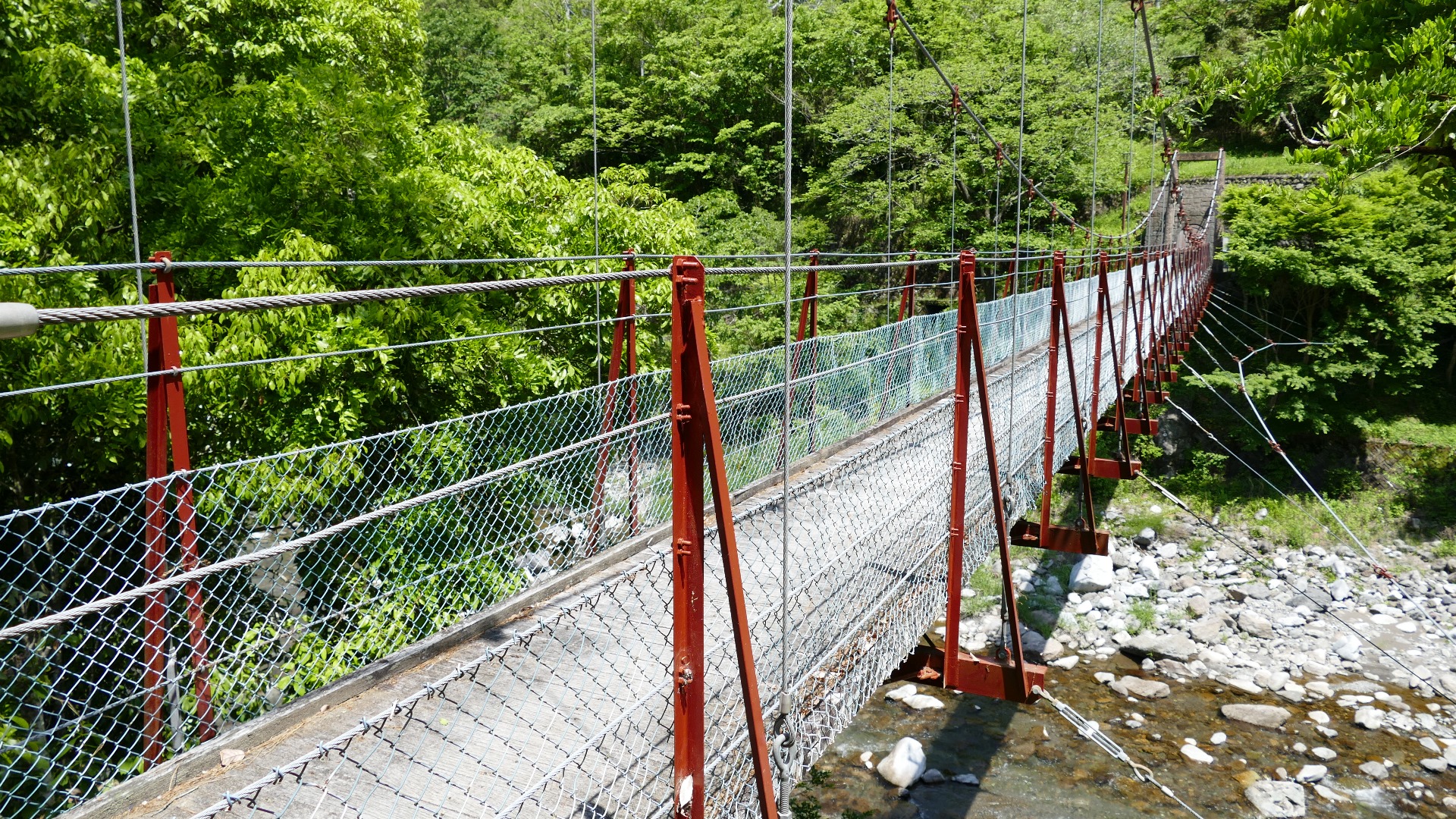 | 谷瀬の吊橋から3kmほど南にある長い吊り橋。 橋長186m 高さ12m 歩道部の木板が腐りかけでワクワク度が上がる。 対岸の小さな集落へ渡る生活橋で谷瀬の吊橋ほど観光地でないので人が皆無。 |