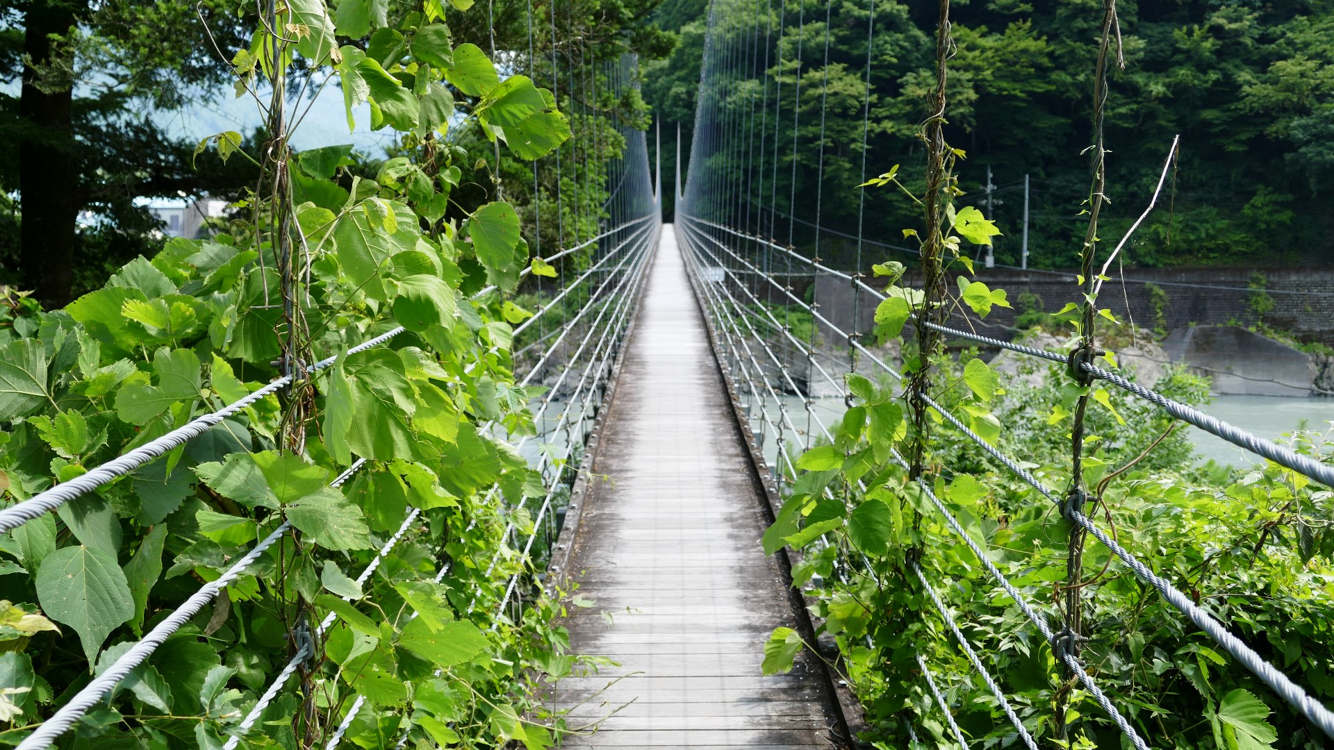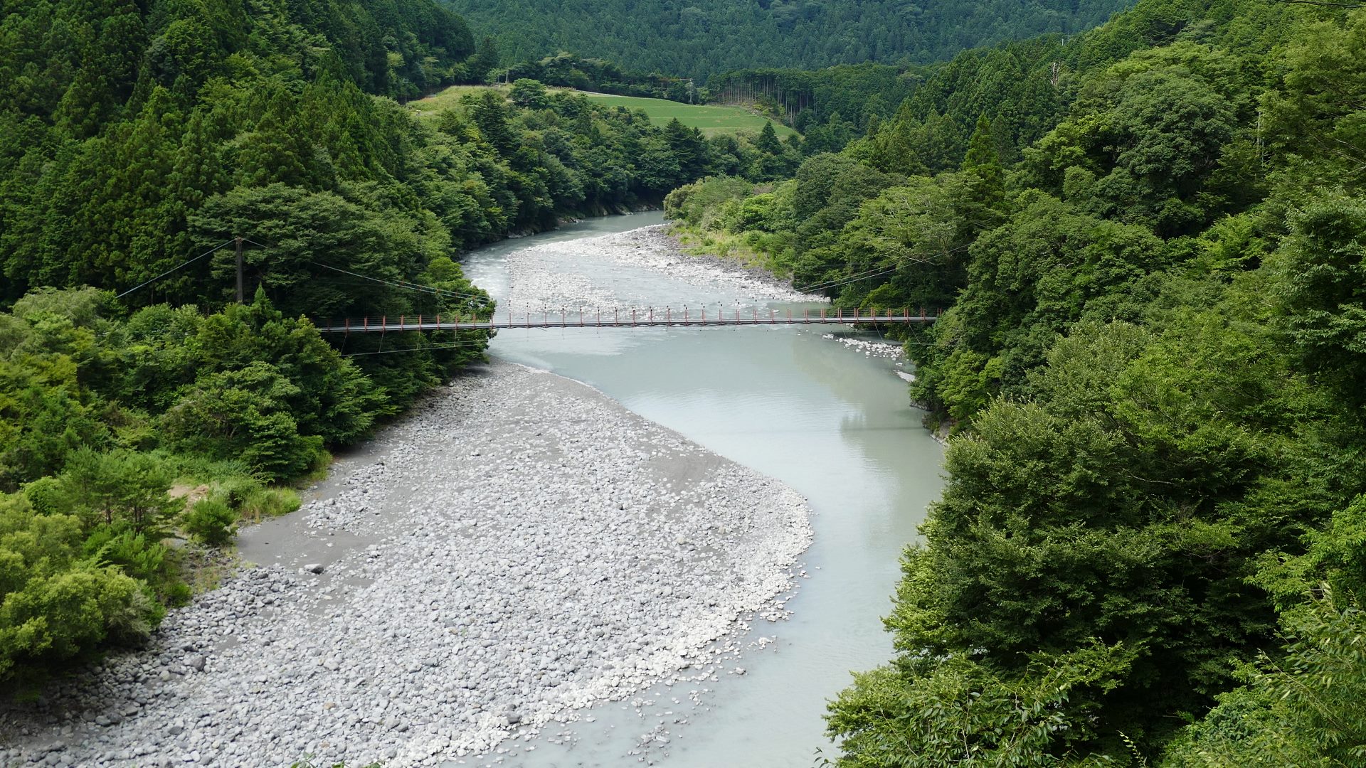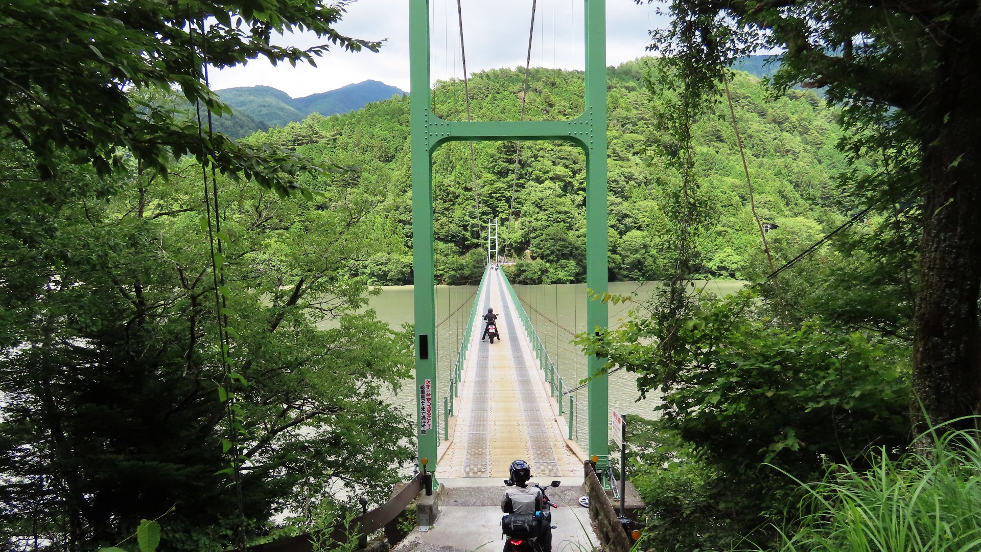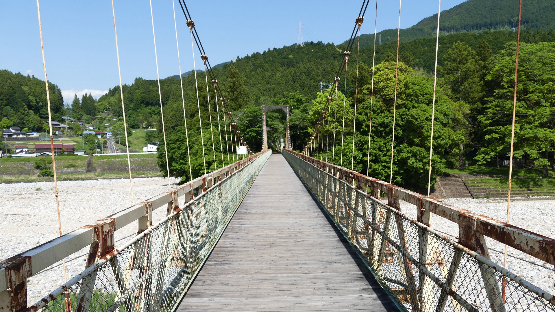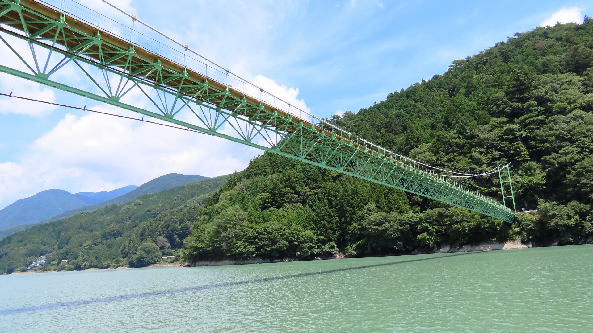 | 谷瀬の吊橋から3kmほど南にある長い吊り橋。 橋長186m 高さ12m 歩道部の木板が腐りかけでワクワク度が上がる。 対岸の小さな集落へ渡る生活橋で谷瀬の吊橋ほど観光地でないので人が皆無。 |