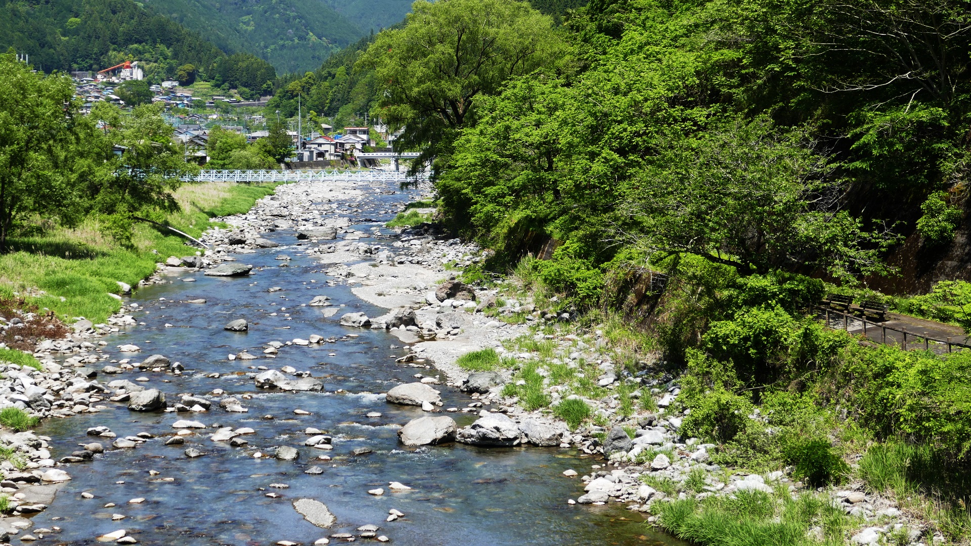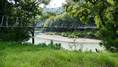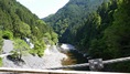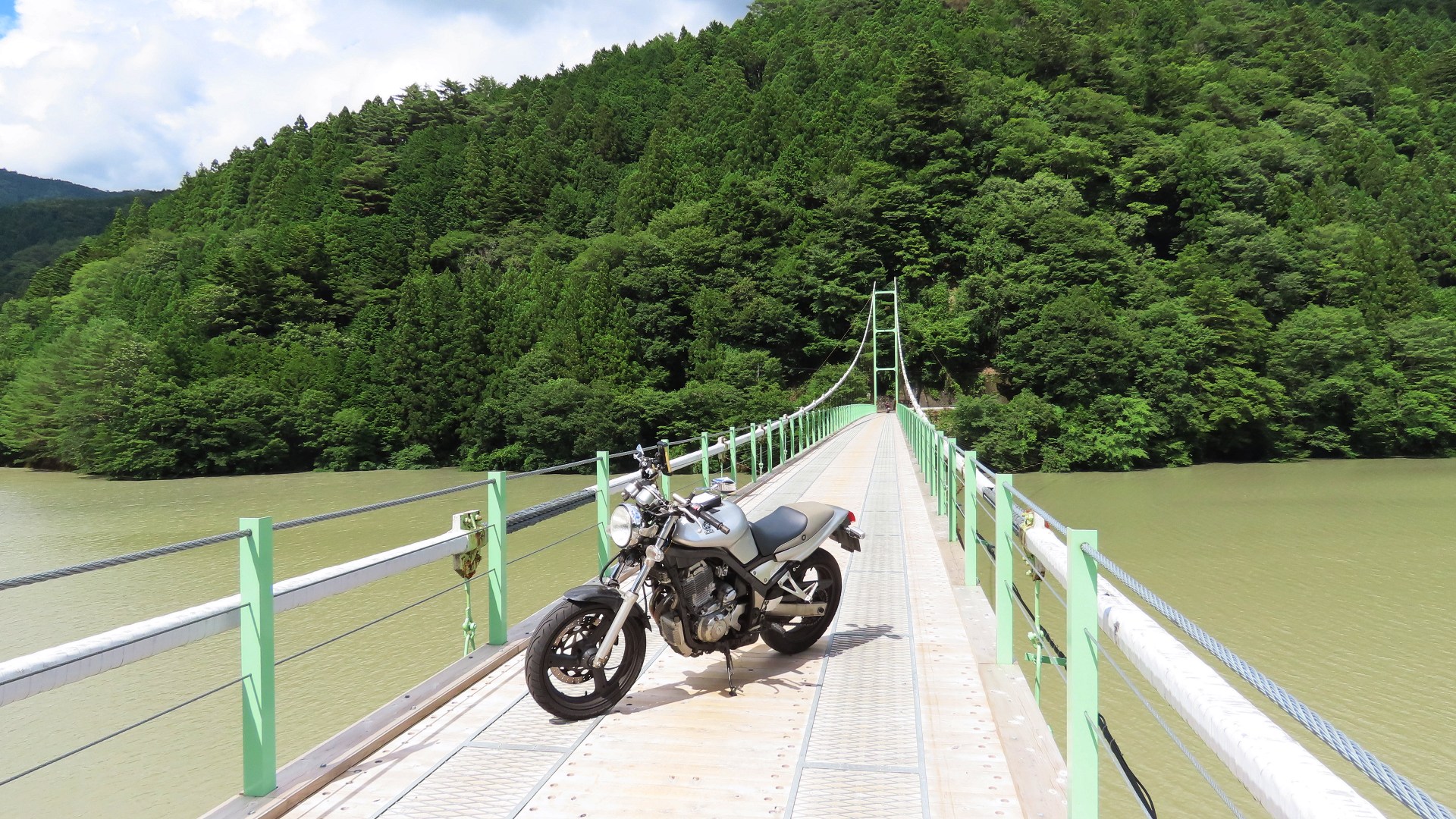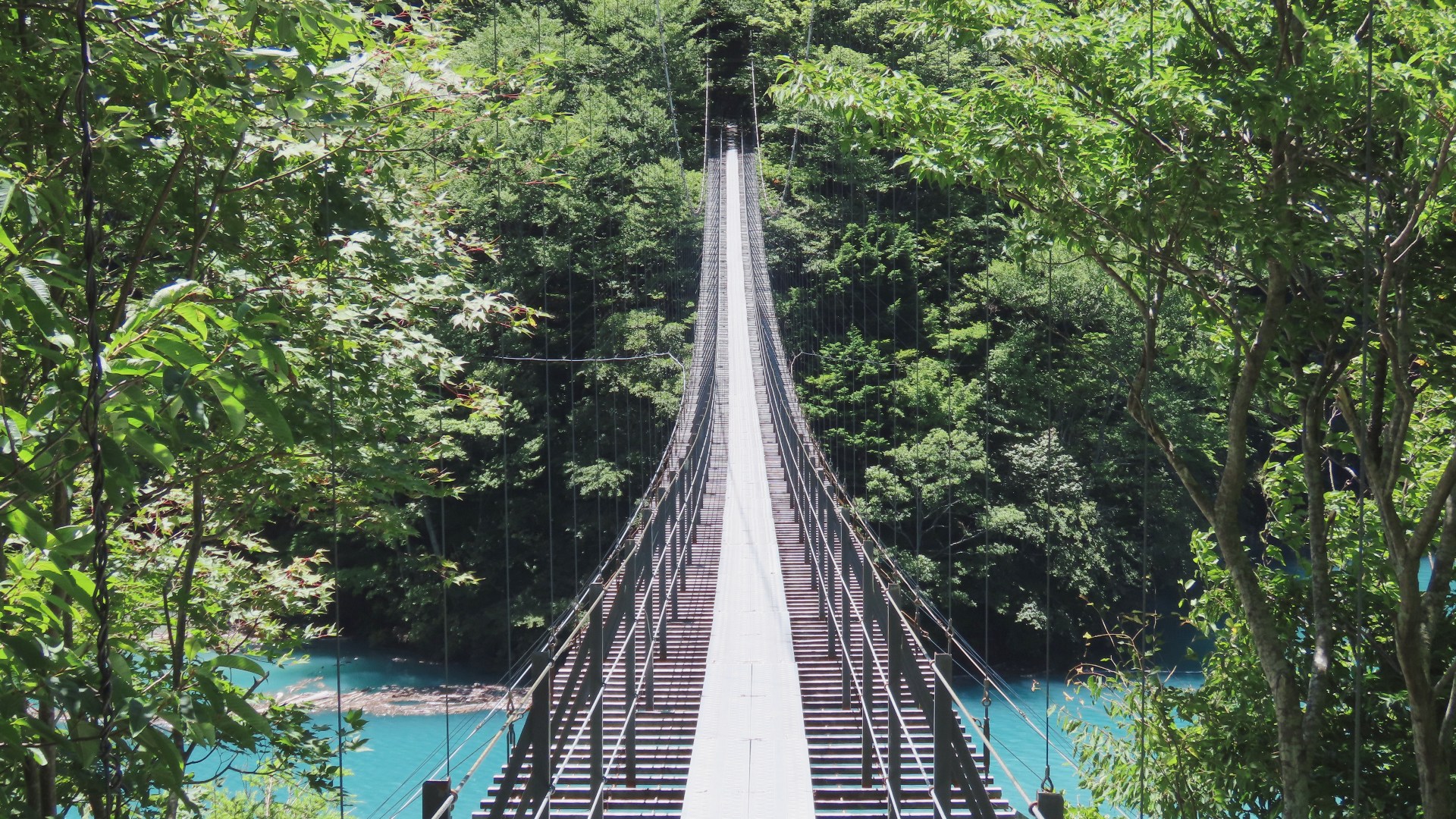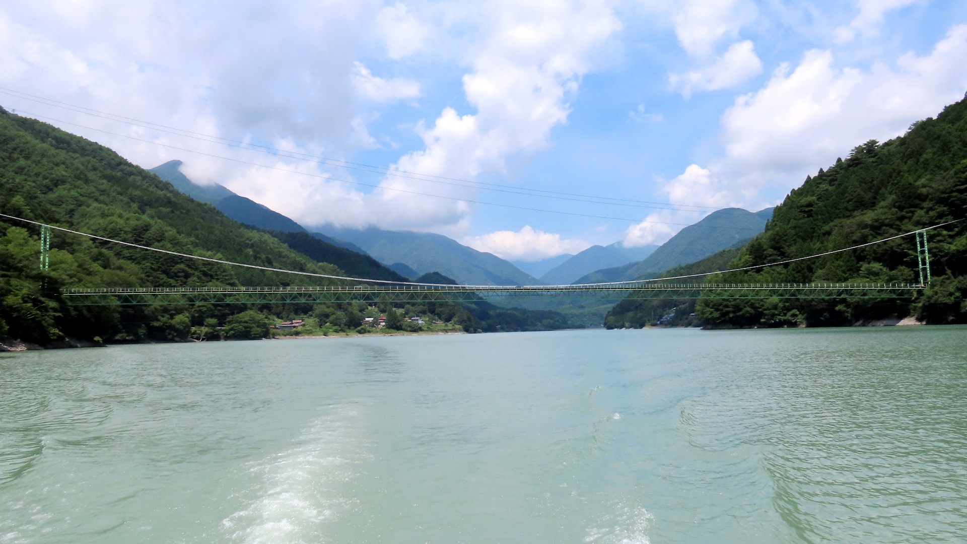 | 谷瀬の吊橋から3kmほど南にある長い吊り橋。 橋長186m 高さ12m 歩道部の木板が腐りかけでワクワク度が上がる。 対岸の小さな集落へ渡る生活橋で谷瀬の吊橋ほど観光地でないので人が皆無。 |