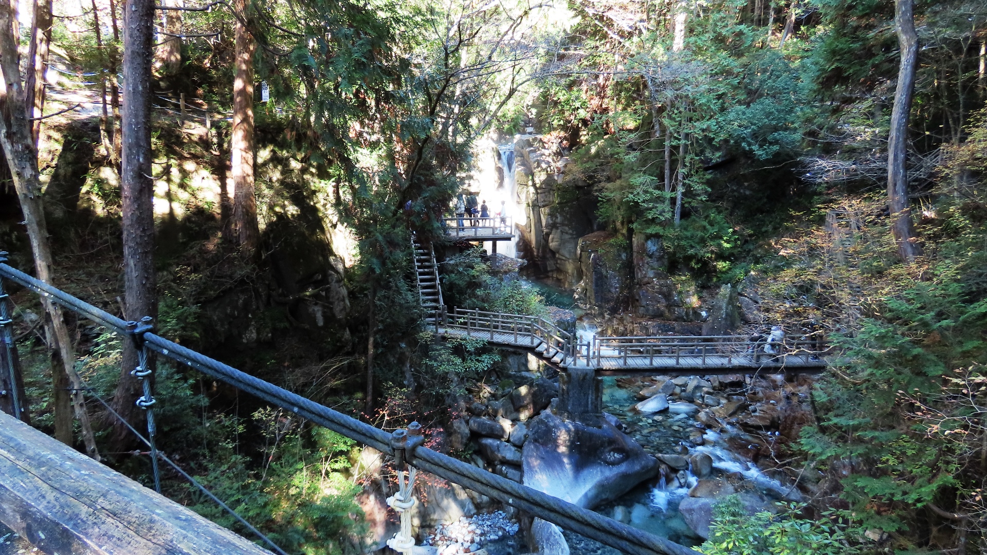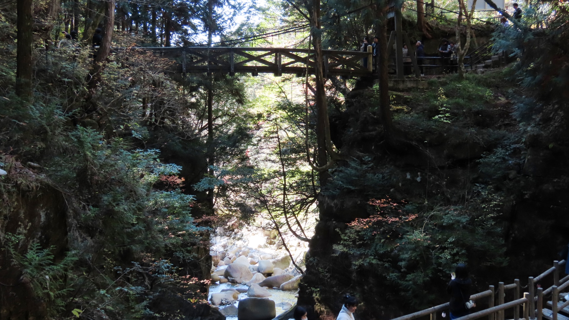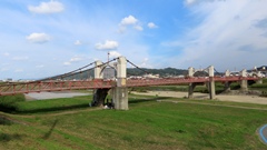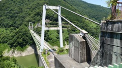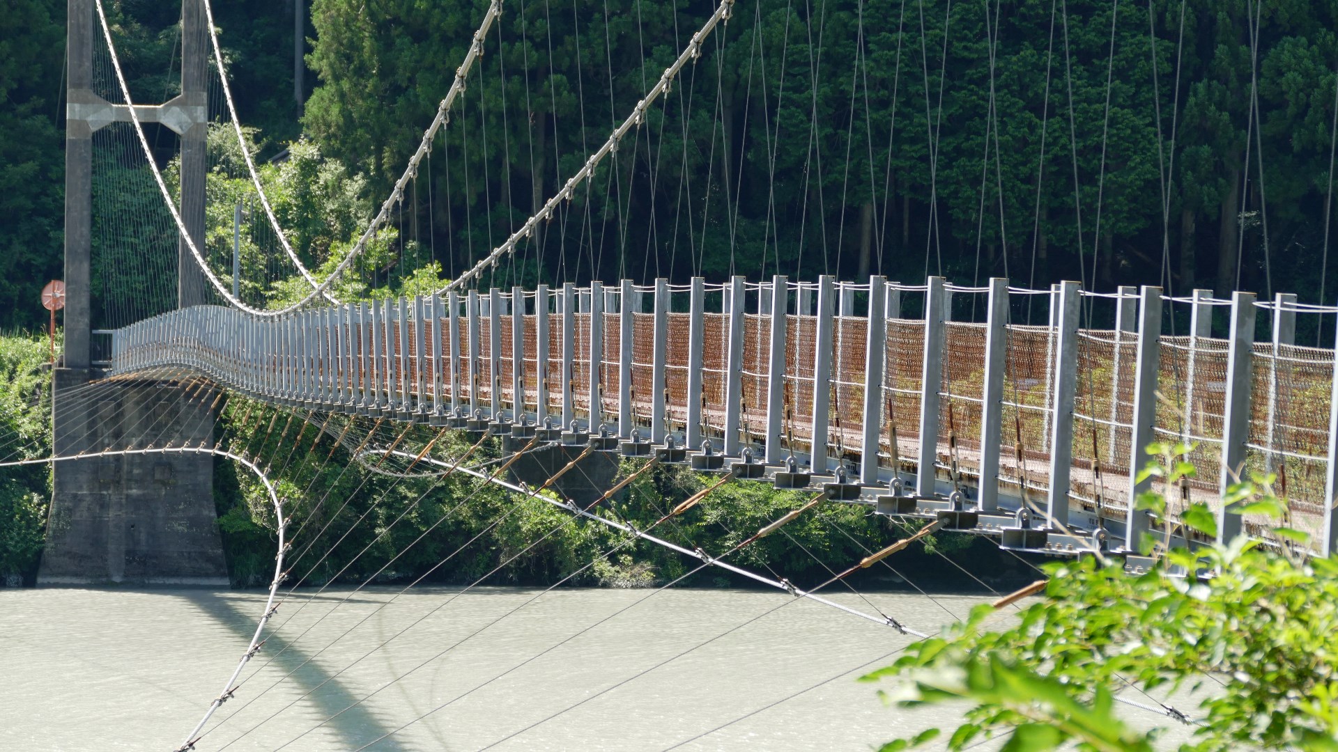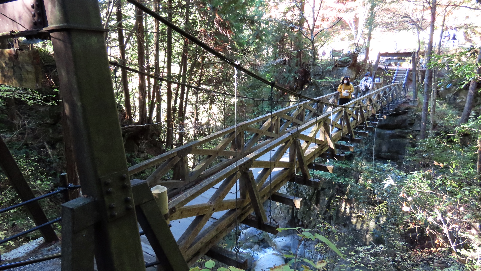 | 1942年に架橋の長さ54mの人道橋。2020年木材部リニューアル工事完成 上流には「吊床版橋」の白虹橋が見える 2024.10 |
