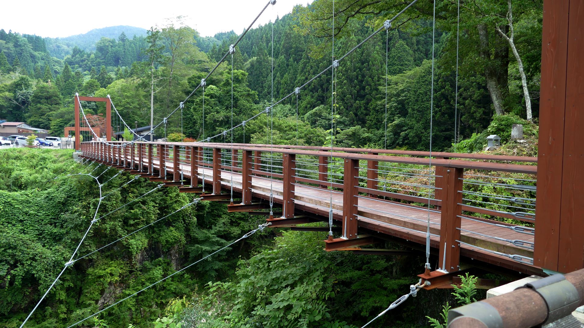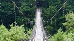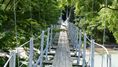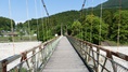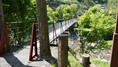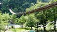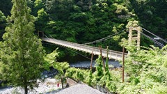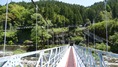 | かずら橋の近くの志津原ビレッジにある足羽川渓谷にかかる吊り橋。全長38m 橋の真ん中から渓流を見下ろすと素晴らしい景観を楽しめる、渓谷には約3kmのふれあい遊歩道が整備されている。 2020.8 |