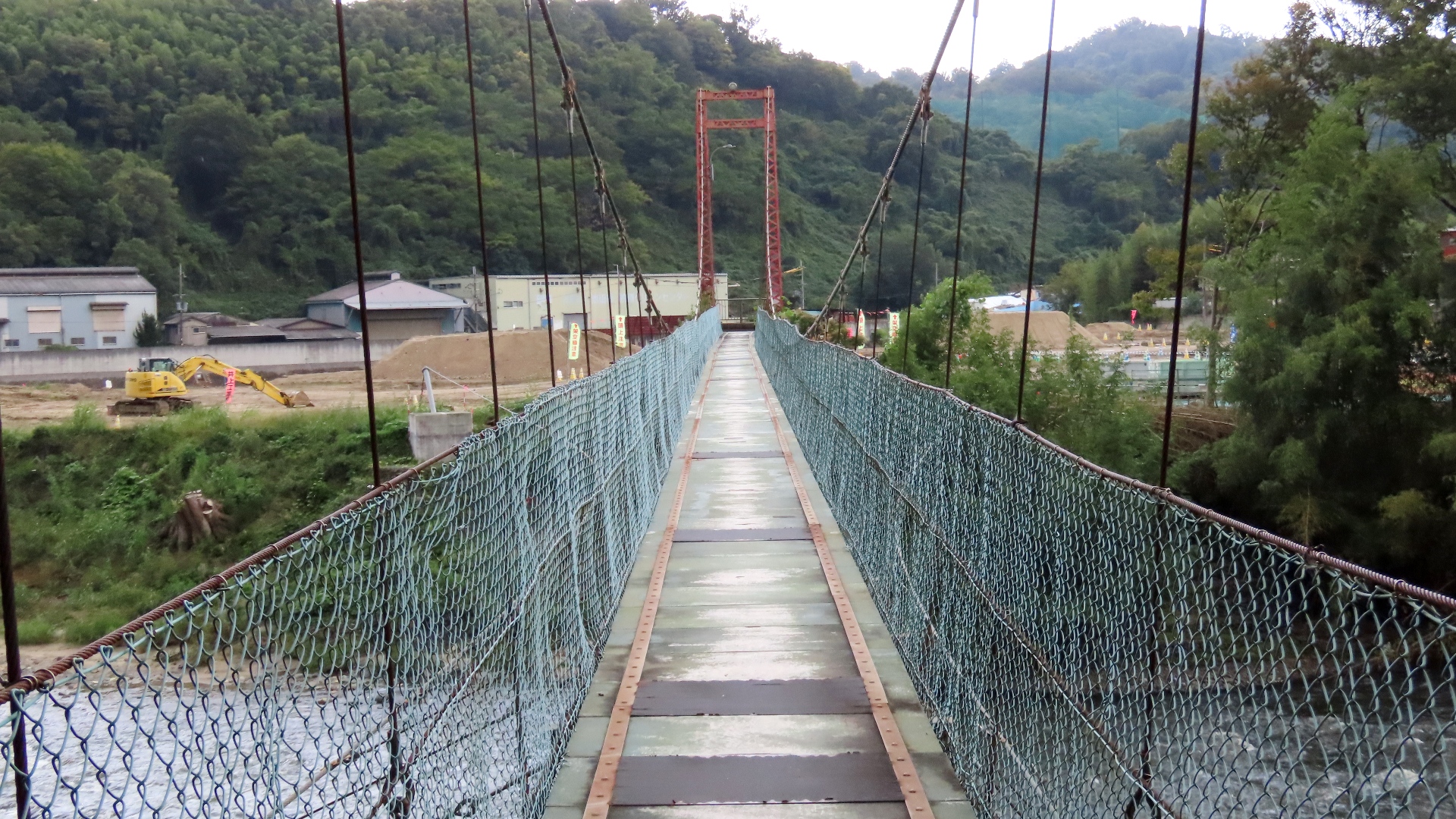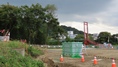 | 国道25号沿いから入った大和川に架かる吊橋。夏目茶屋渡し跡 入口が分かりづらい、対岸は造成中? 2025.11 |