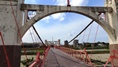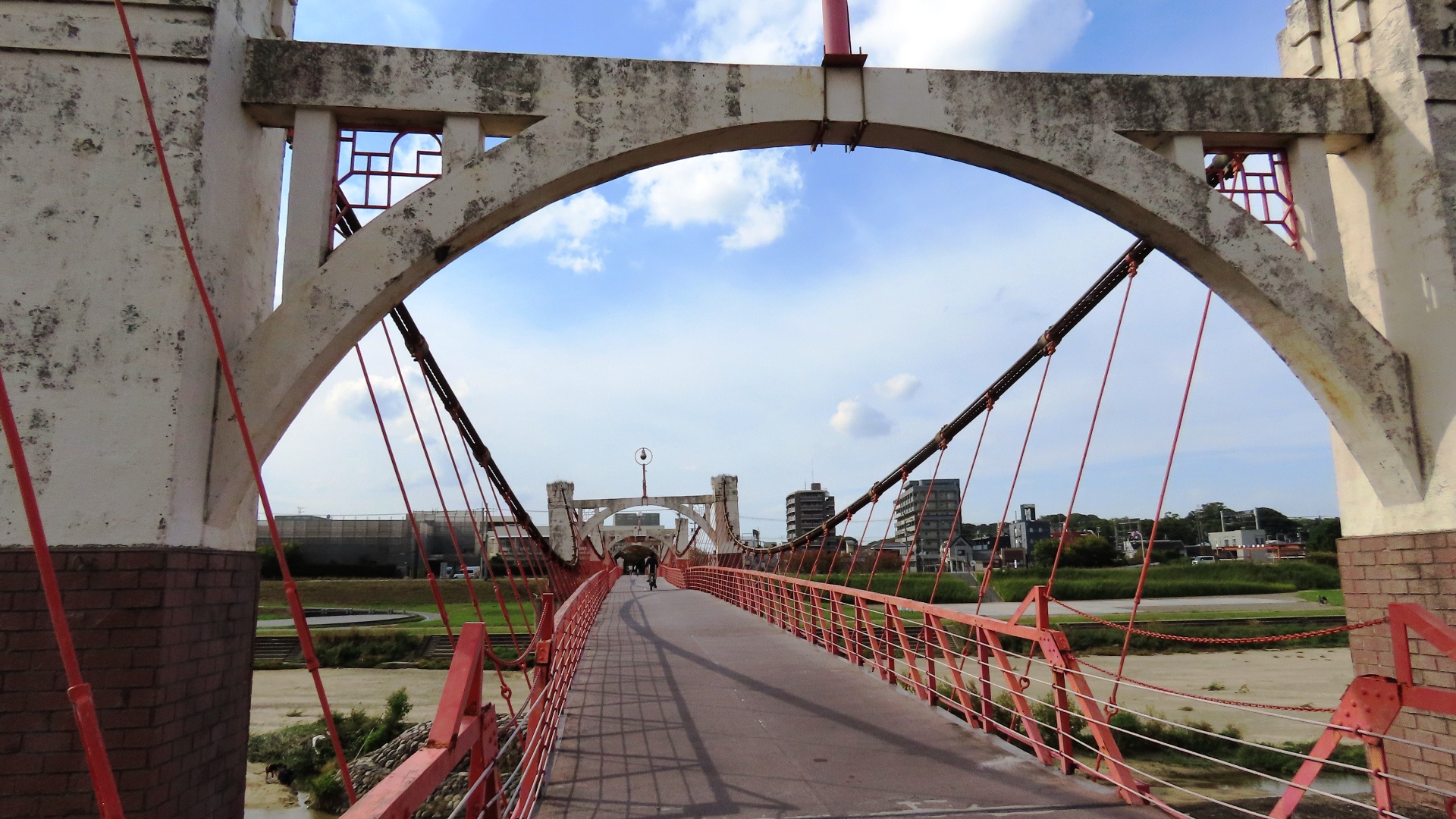 | 1916(大正5)完成、現存する最古の近代吊り橋。 長良川にかかる人と自転車専用橋。橋の長さは113m 2016.7 |