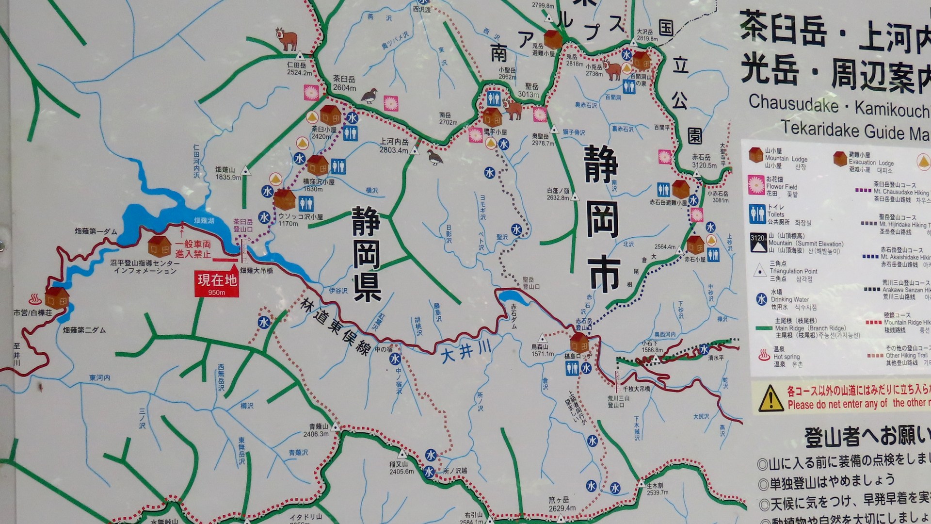 | 沼平ゲートから歩くこと約40分でたどり着く、登山道入口の長い吊橋。大自然の中、西側・東側どちらを向いてもロケーションが素晴らしい さら上流に約75分程歩くと「中ノ宿吊橋」がある 周辺地図 説明板 ゆるキャン△聖地 2025.7 |