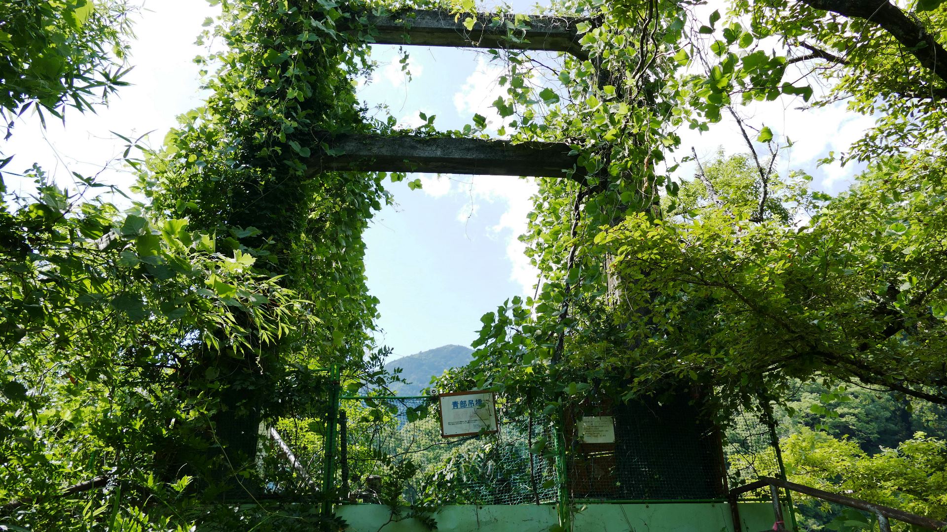 | かずら橋は、つる植物のシラチクカズラを使って架けられた原始的な吊り橋。 かずら橋は徳島県の「祖谷(いや)のかずら橋」が有名だが、池田町は観光資源として東祖谷から招いた職人の指導のもと1989年に造られた。 全長は本家より1m短い44m、高さは本家より2m低い12m、通行料大人300円 2020.8 |