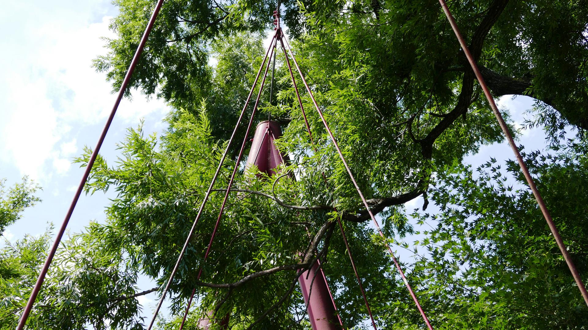 主塔が三角形、主ケーブルからハンガーケーブルも三角形の 珍しい形の吊橋 橋長35m 2024.7 |