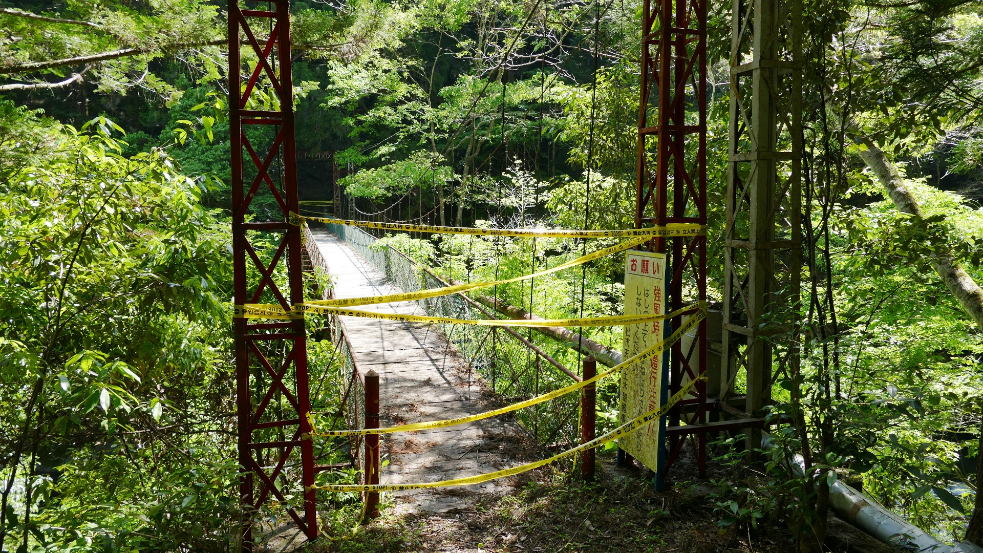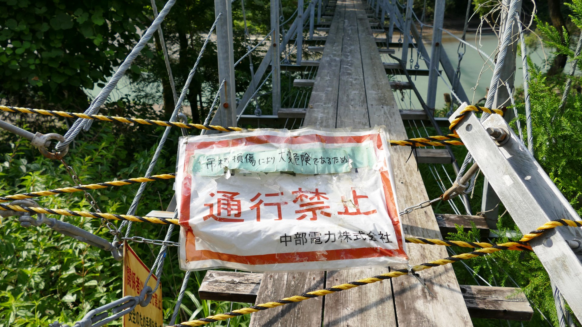 大井川発電所付近の中部電力所有の今は渡れない吊橋 その昔はハイキングコースの一部になっていたらしい 2024.7 |