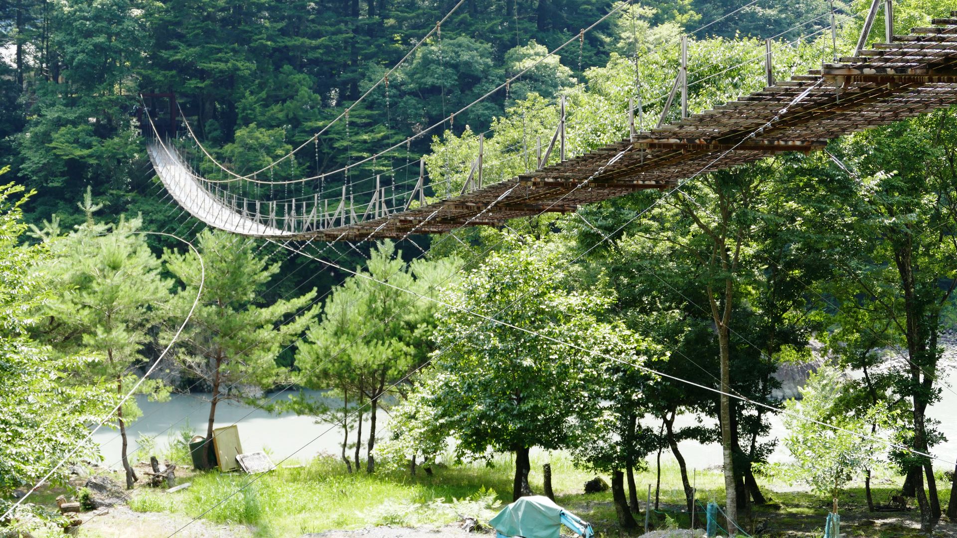 | 大井川に合流する手前の寸又川に架かる池の谷ファミリーキャンプ場と 集落を繋ぐ吊橋 縦揺れが楽しい 2024.7 |