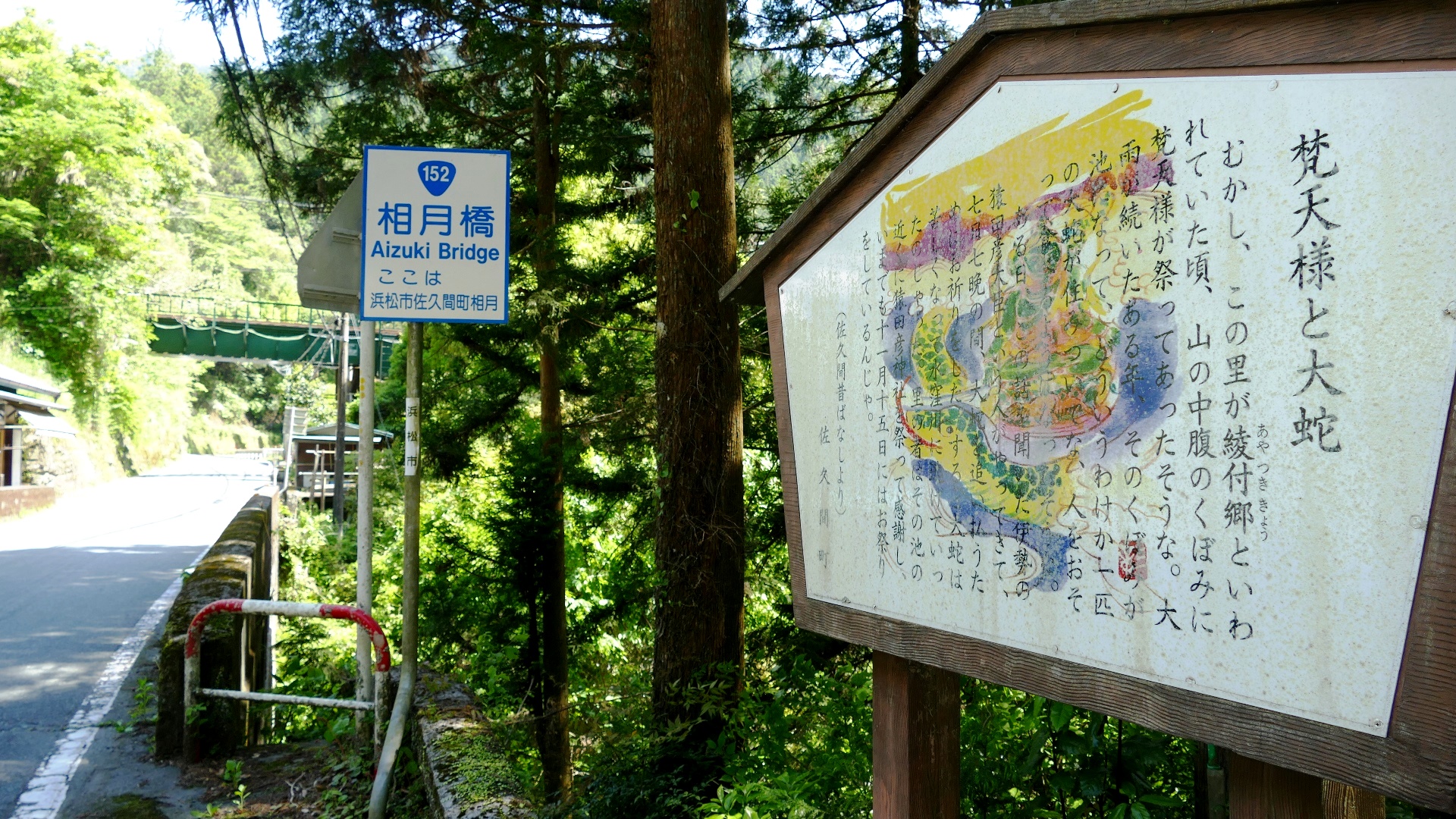 | 嵐渓にある「香嵐橋」 2020.5 | 大井平公園内の名倉川に架かる全長86mの床木製の吊橋。 案内図 稲武町観光マップ 2020.8 |
