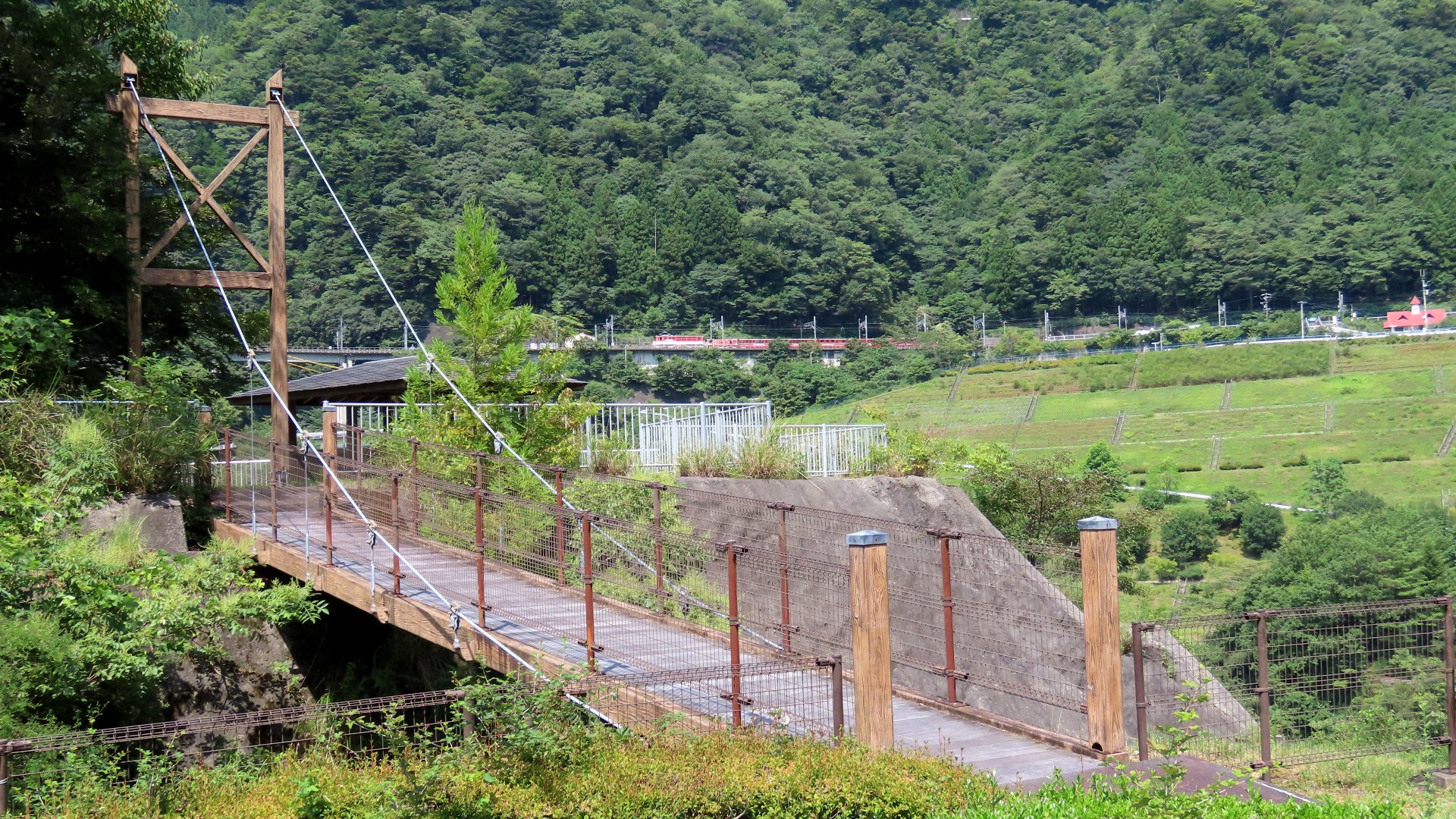 | 井川線や車両基地が見えるロケーションが良い吊橋 人通り多い割に狭い 橋長145m 2024.7 |