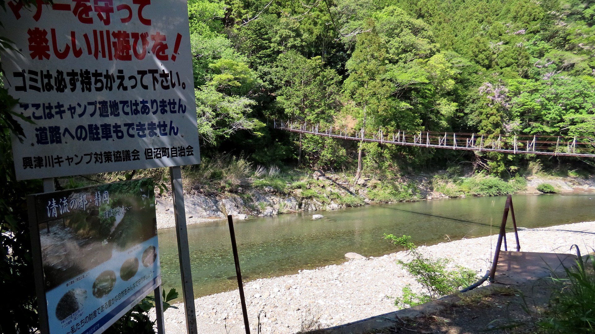 | 「但沼の吊橋」上流にに架かる、興津川漁協東にある無名橋 案内看板 さらに上流にあった「清地の吊橋」は廃橋となった 2025.4 |