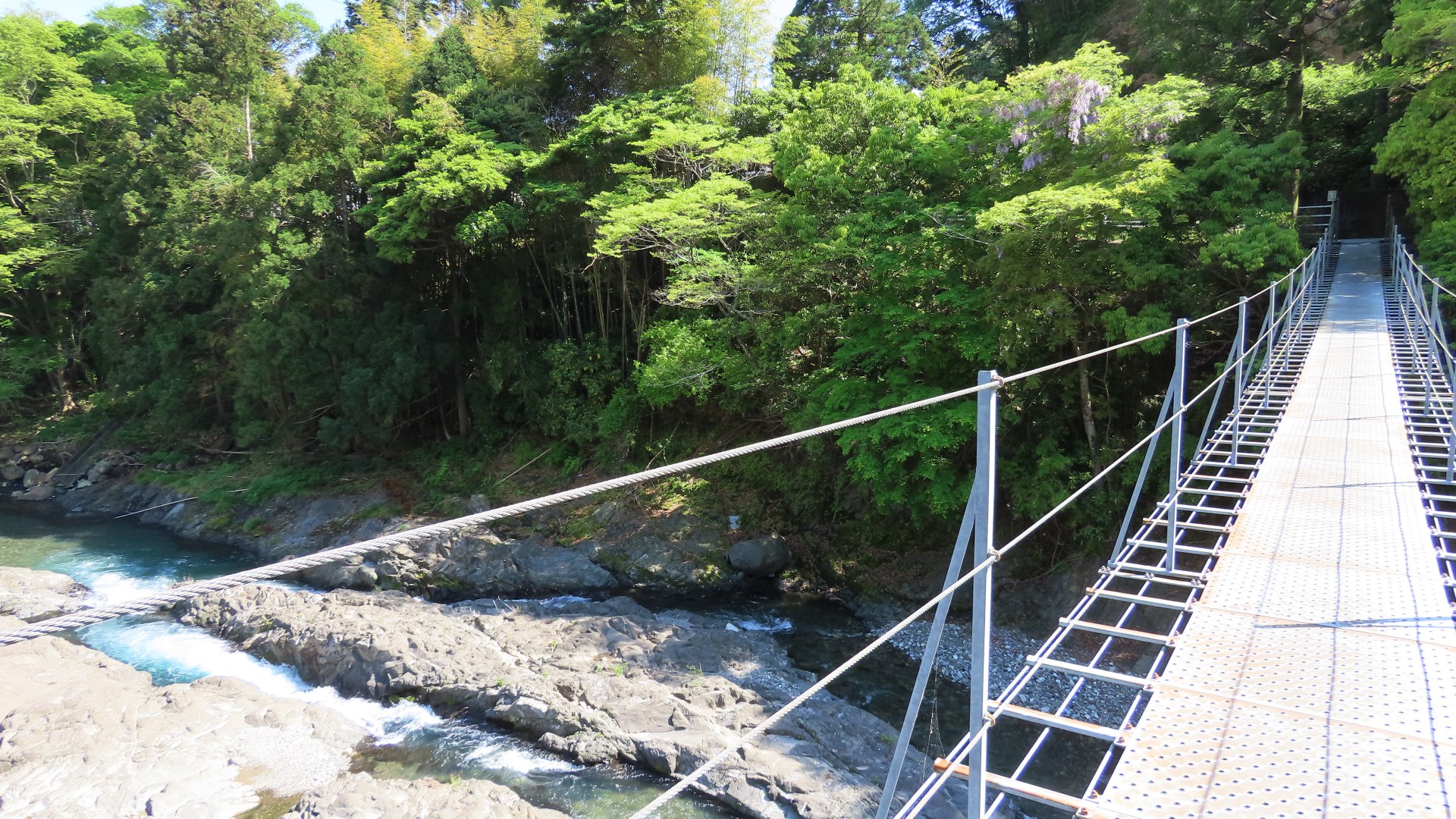 | 天竜峡遊歩道に架かる吊橋。垂直の岩「龍角峯(りゅうかくほう)」も見える。 2021.5 | |||||||