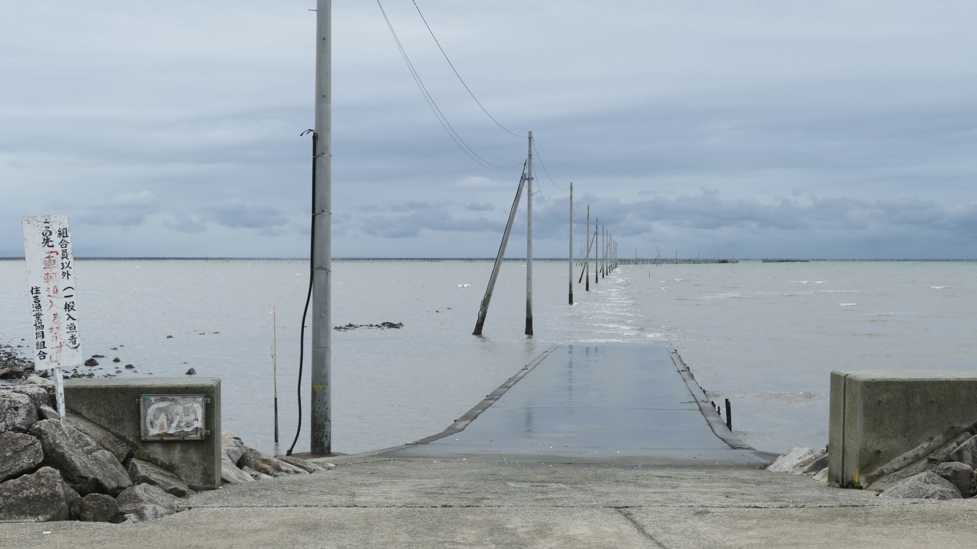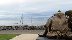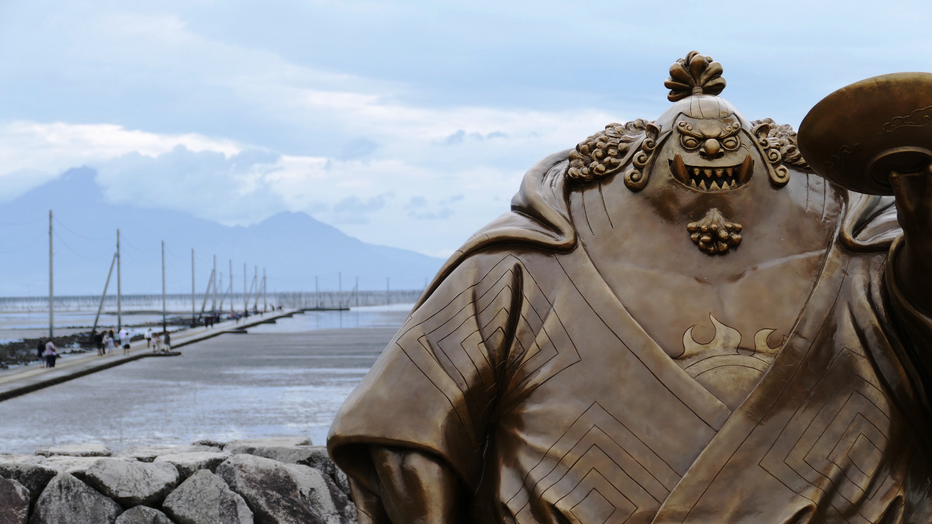 ONEPIECEのジンベイ像の傍ら 海水が満ちて通行できない |
