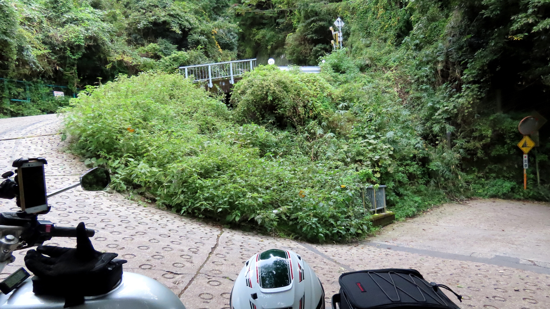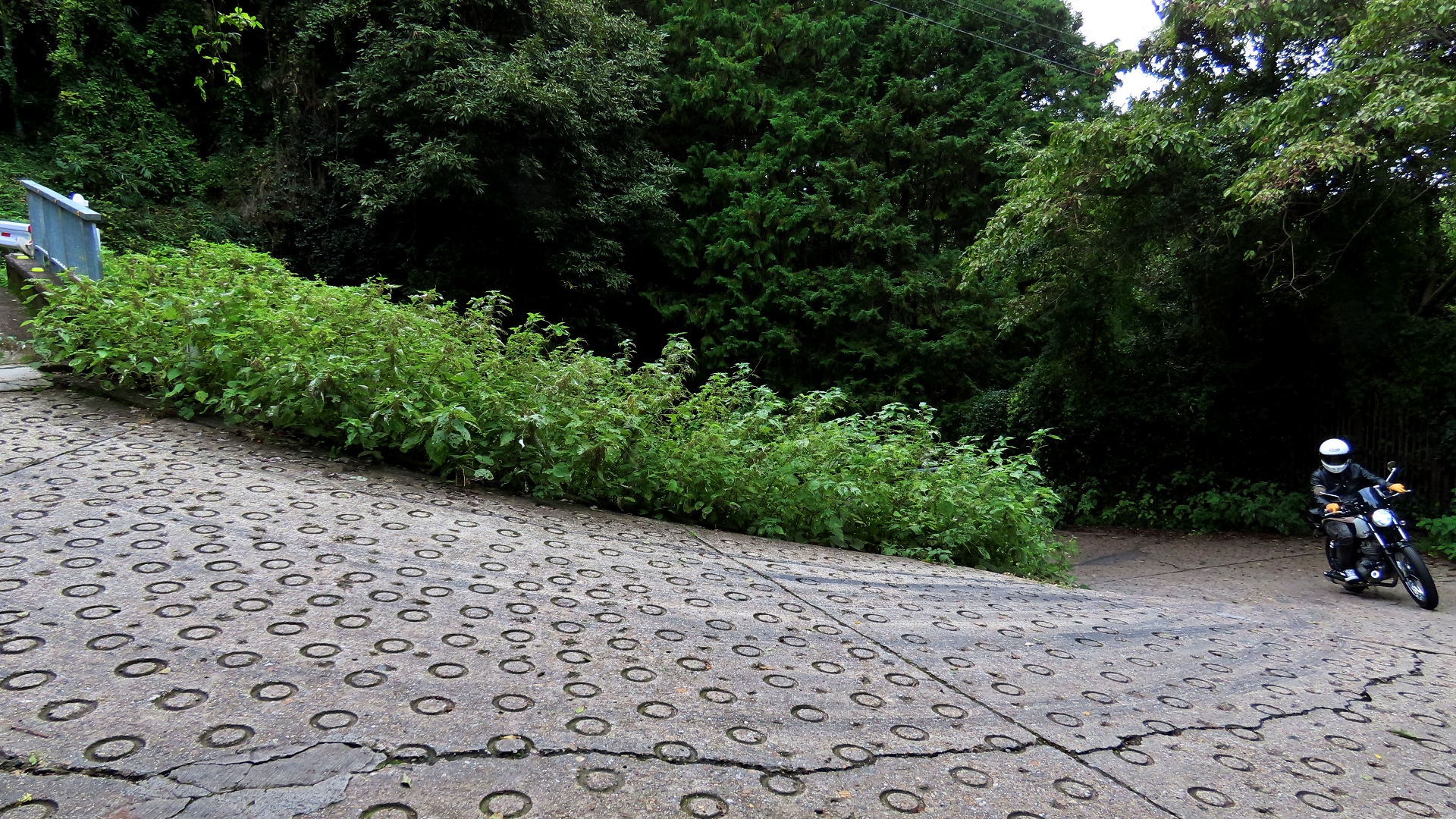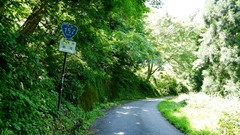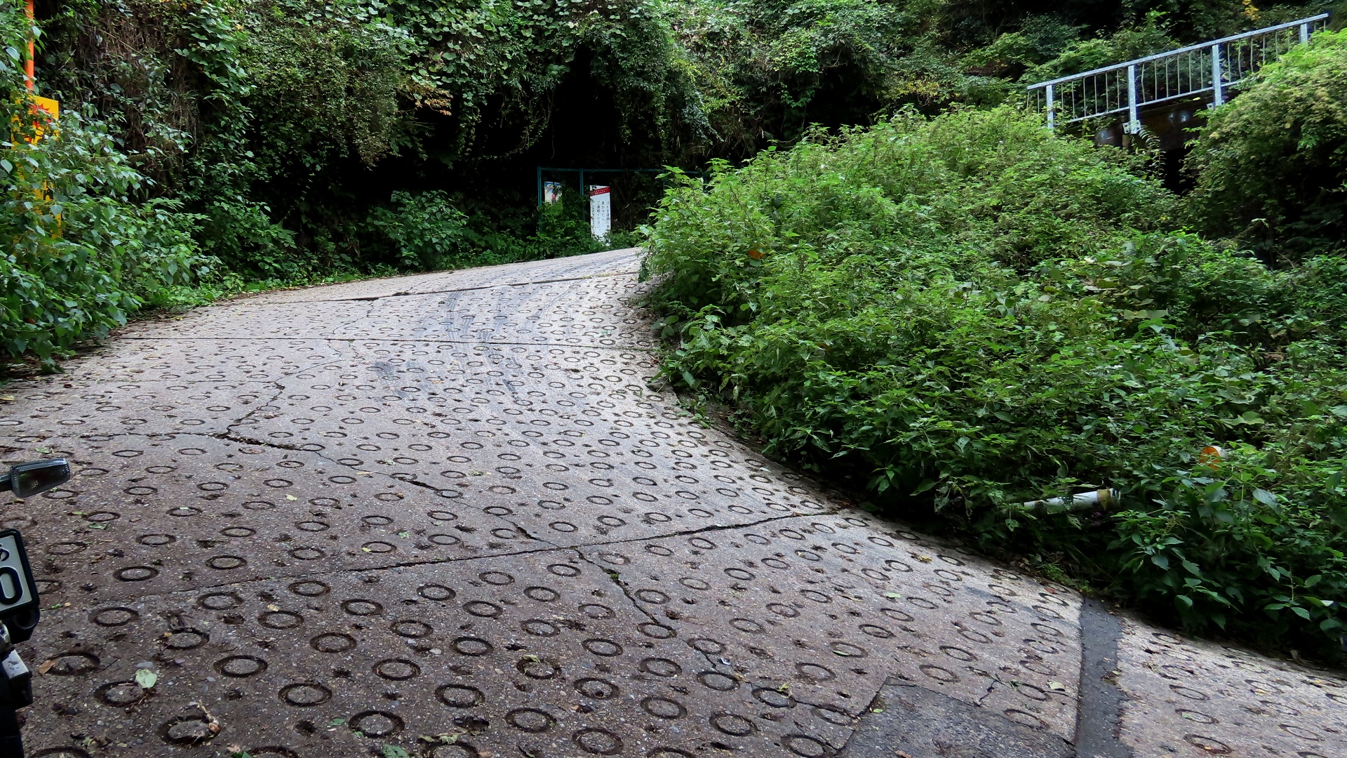 暗峠最急勾配地点 最大勾配は約40%と言われている。路面は水抜き丸溝があるコンクリート タイヤ痕がこの険しさを物語る。 上りより下りの方が怖そう |